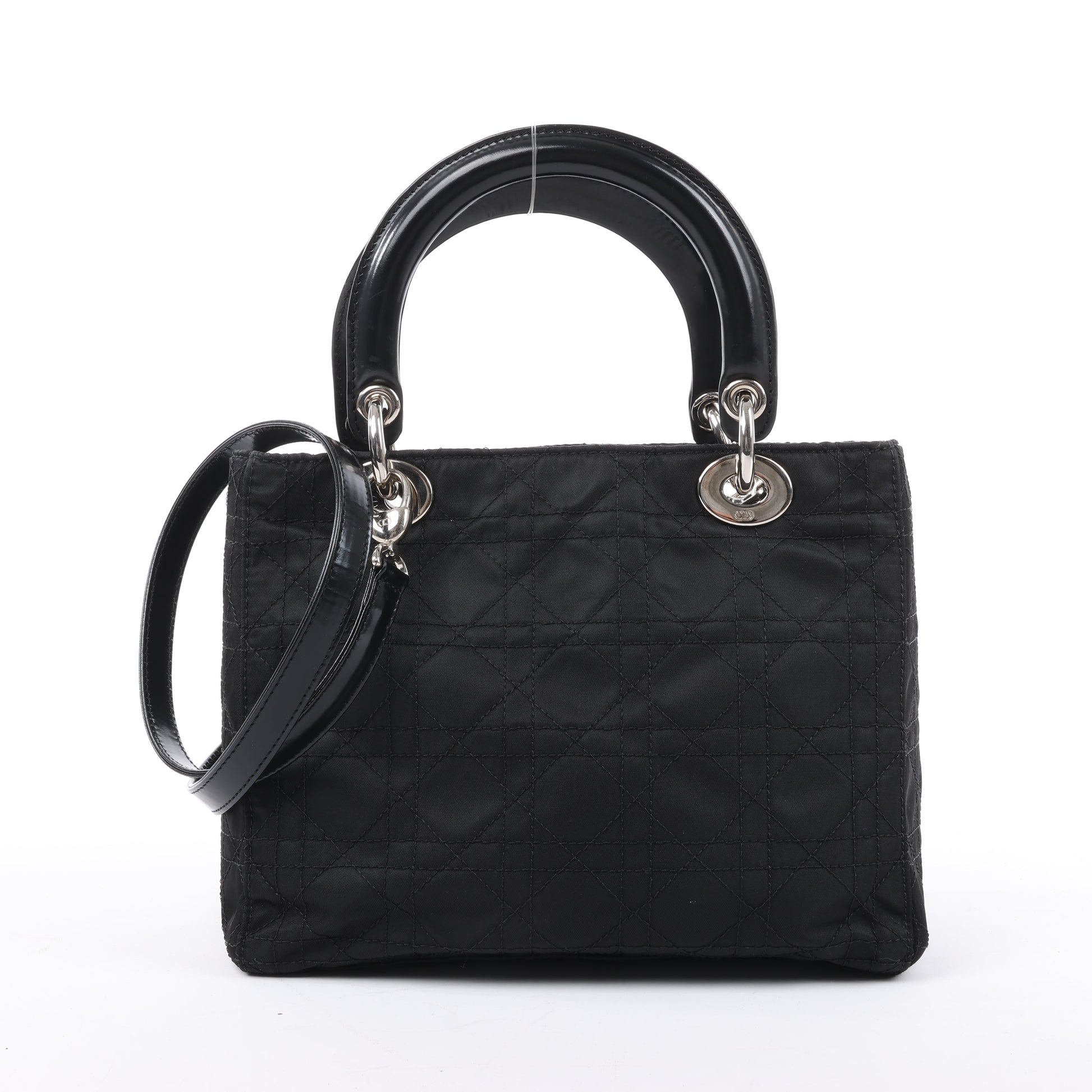 Iconic and elegant, this Dior Lady Dior handbag in black Cannage nylon features polished silver-tone hardware and signature charm detailing. A timeless piece that exudes Parisian sophistication and refined femininity.