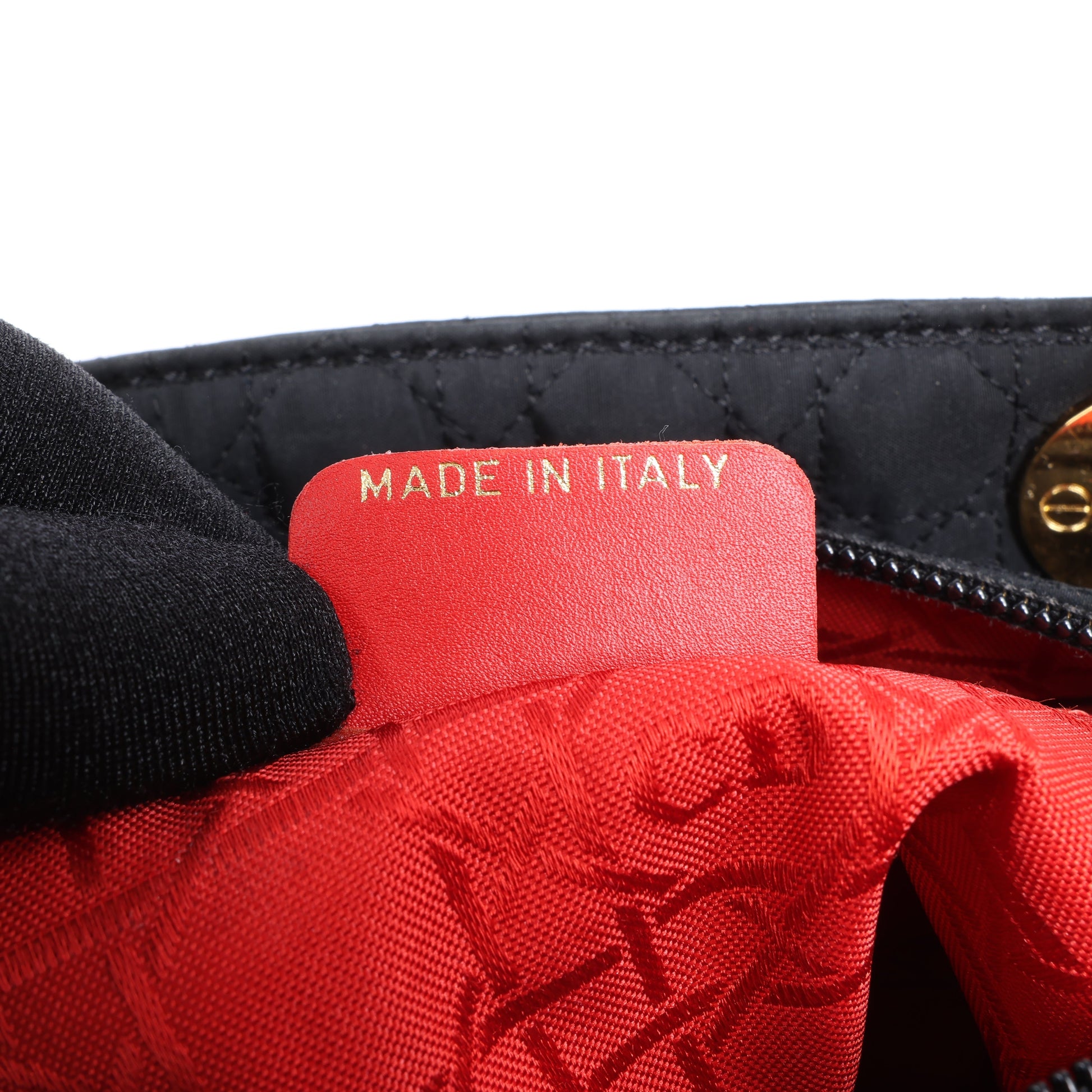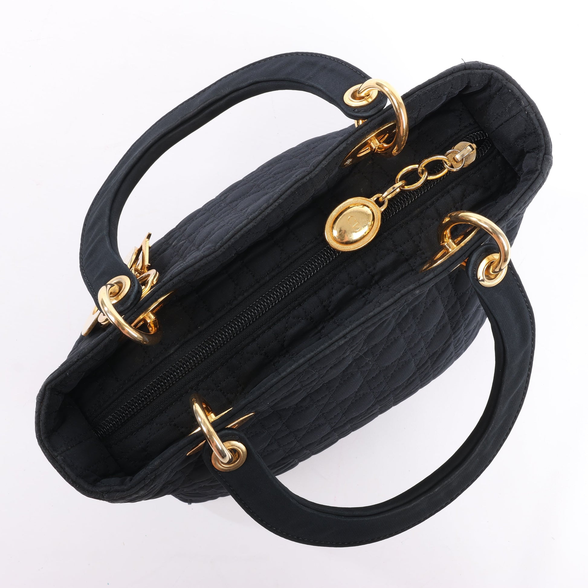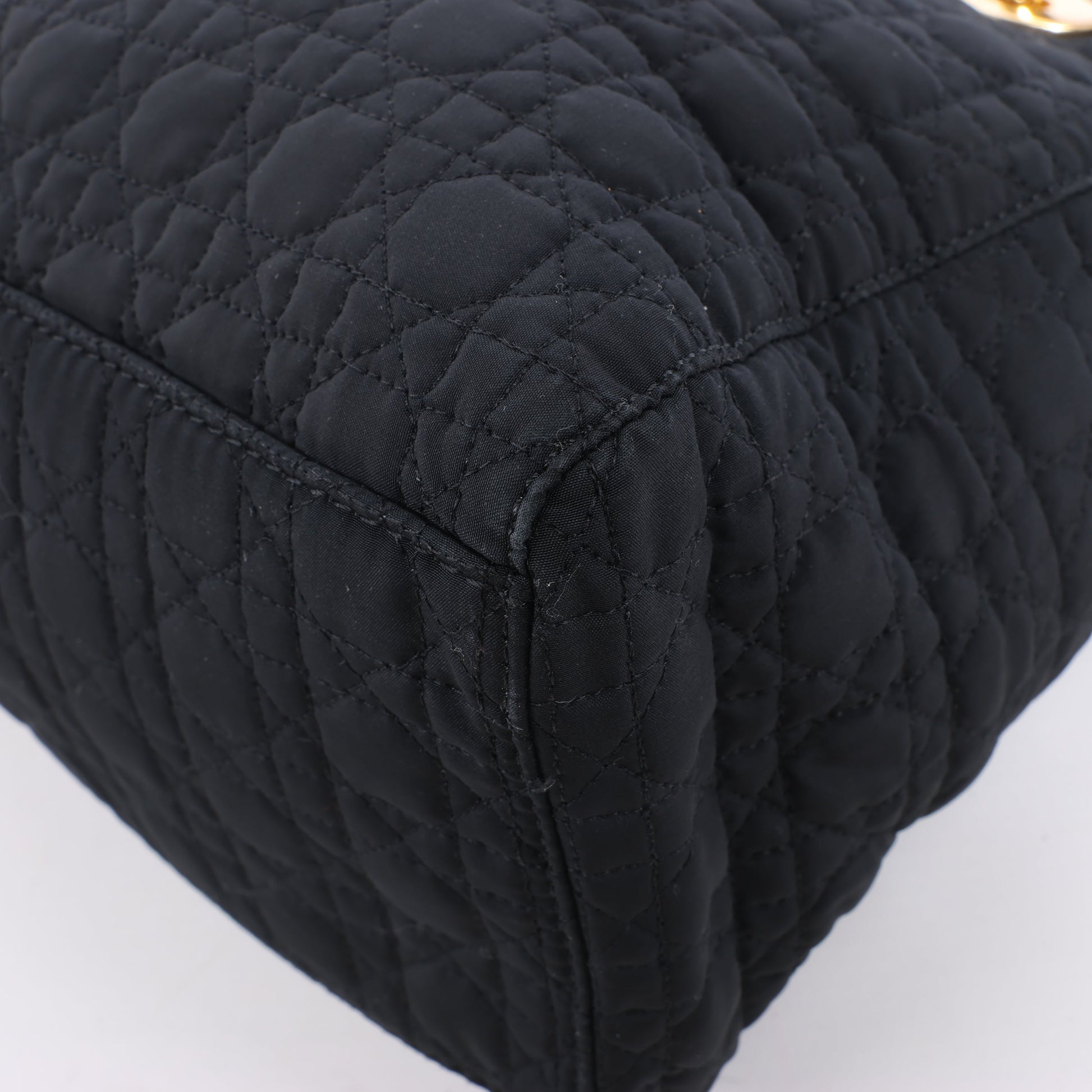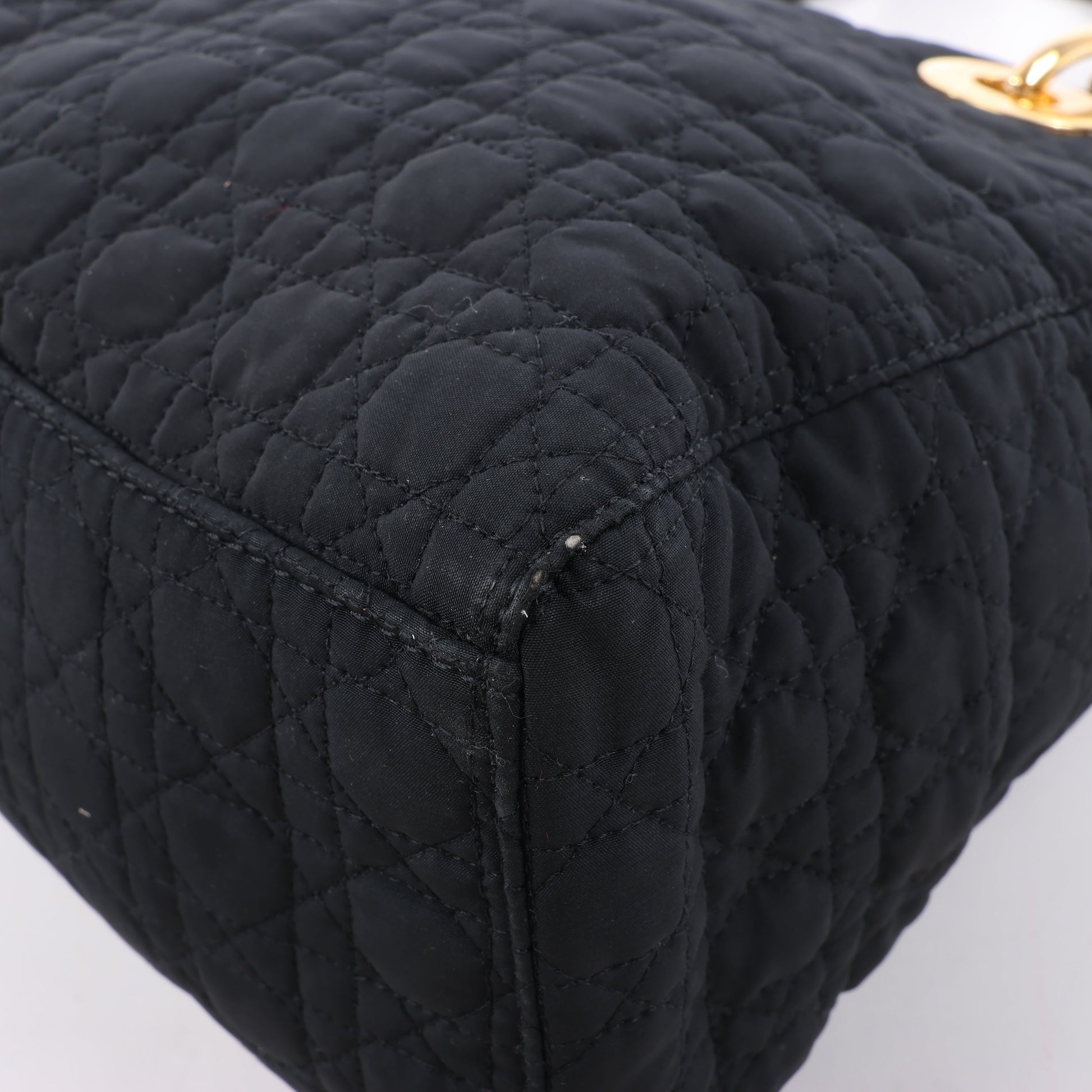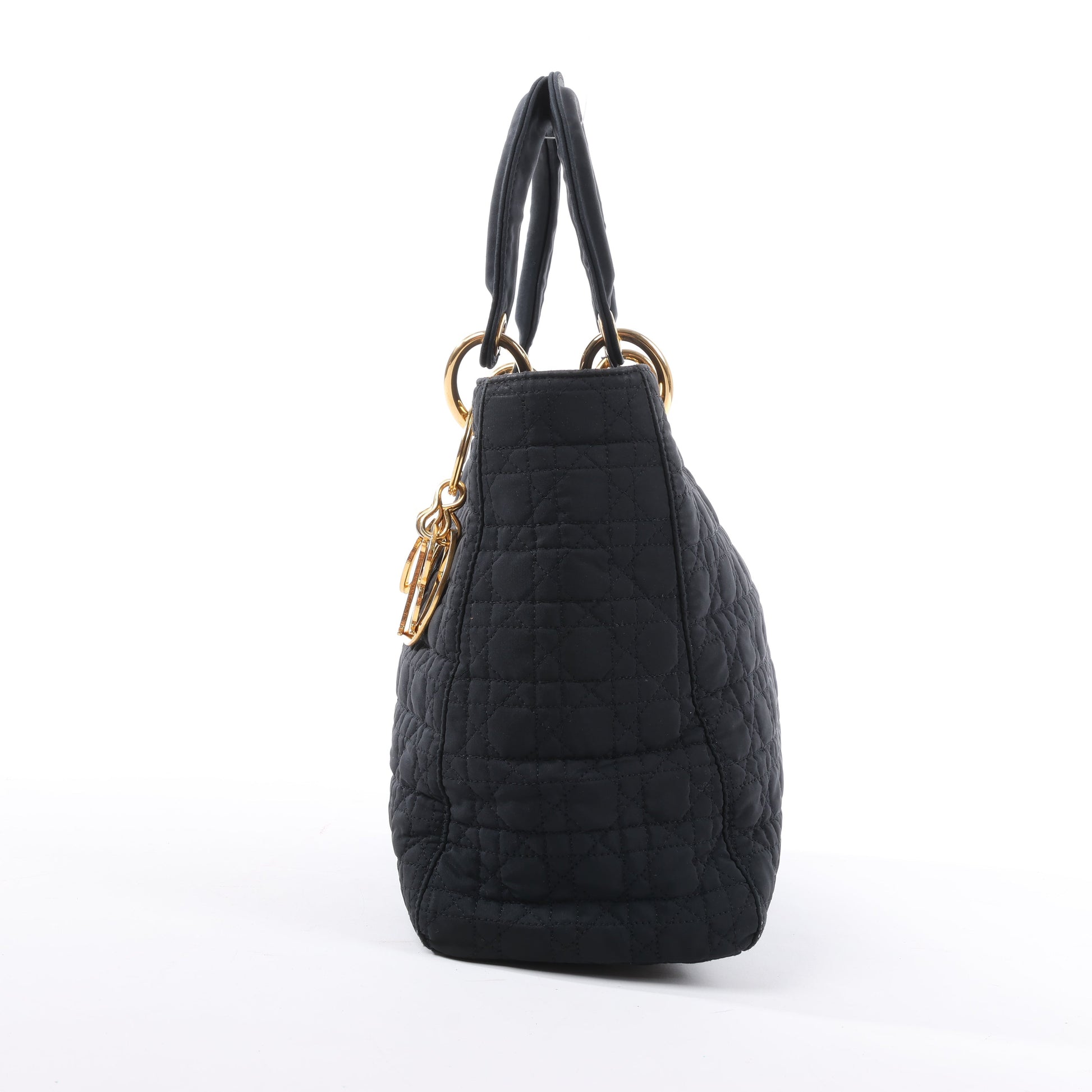 Dior Lady Dior in black Cannage nylon. Iconic top-handle silhouette with gold-tone hardware and signature DIOR charms—lightweight elegance with timeless Parisian flair.