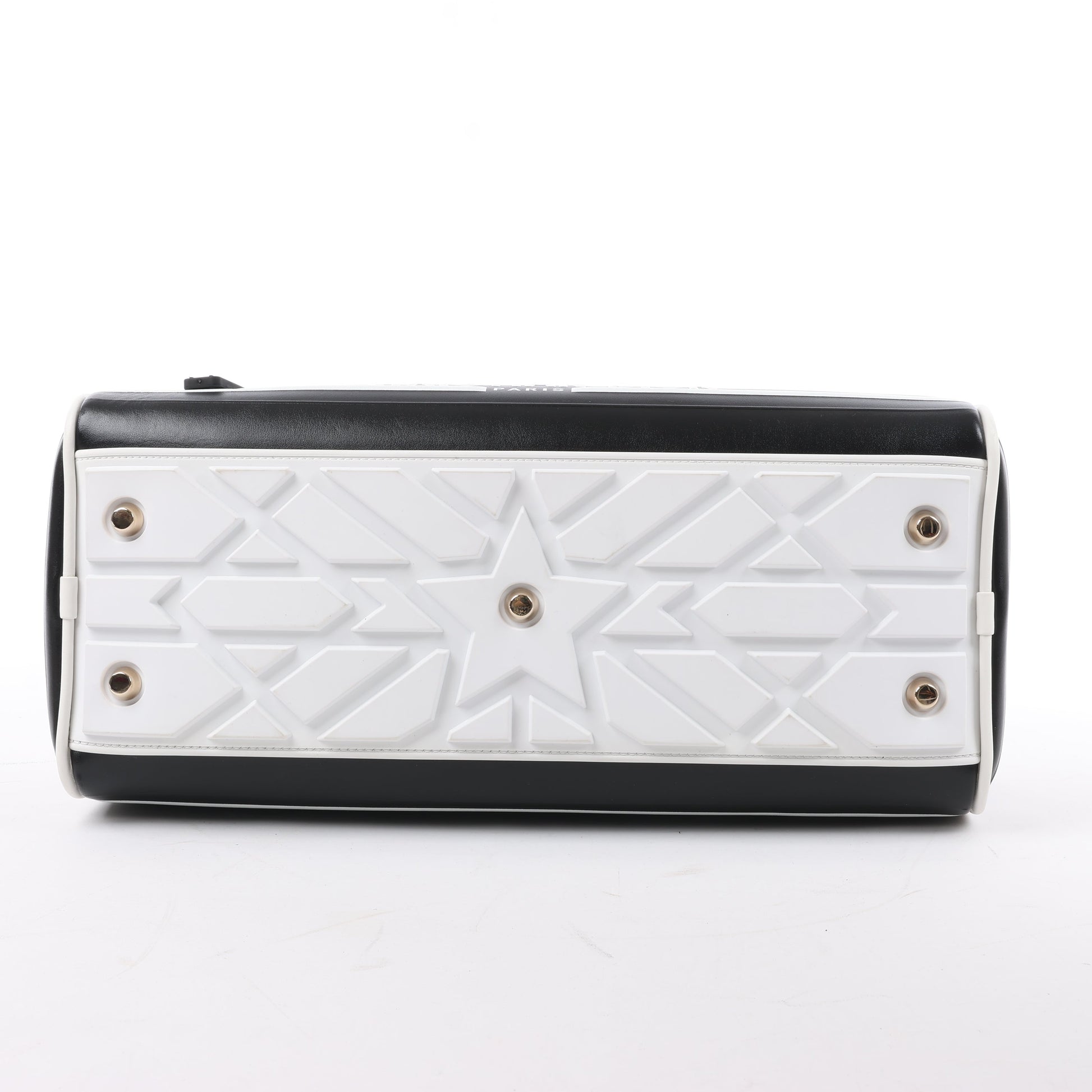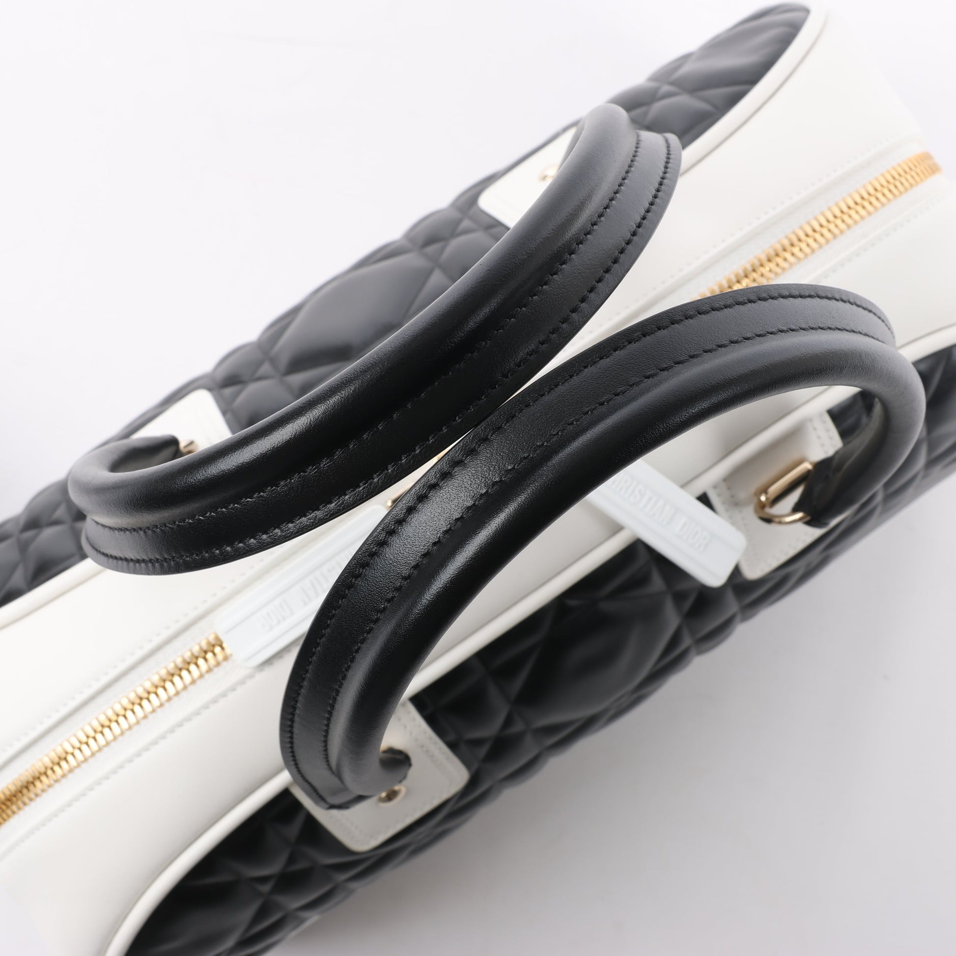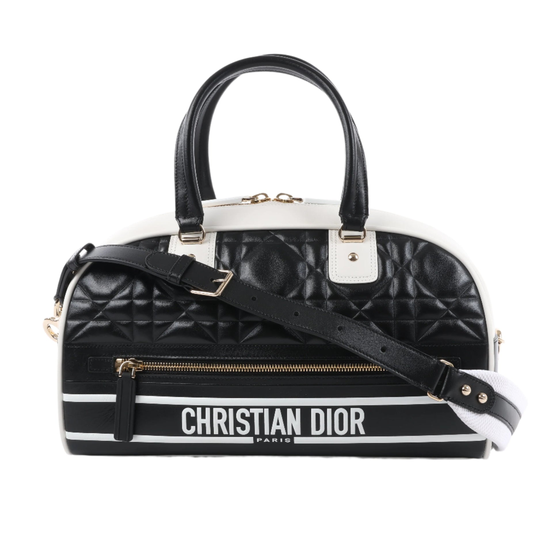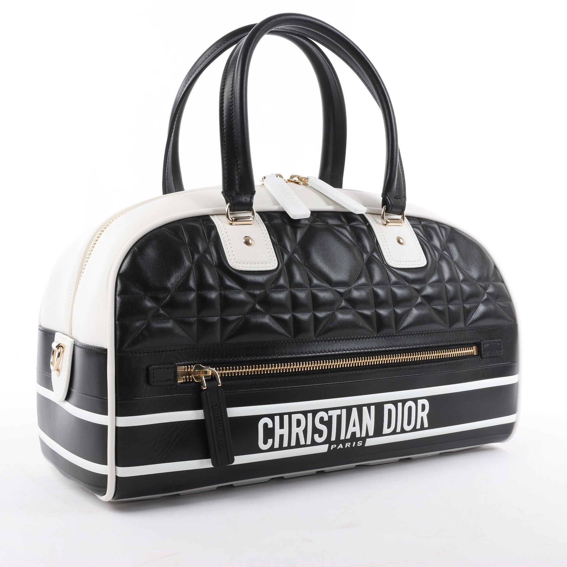 Dior Dior Vibe Zip Bowling Bag in black and white leather blends sporty chic with elegance. Featuring bold logo detailing, quilted texture, and a wide shoulder strap, it's a statement piece for modern, on-the-go luxury.