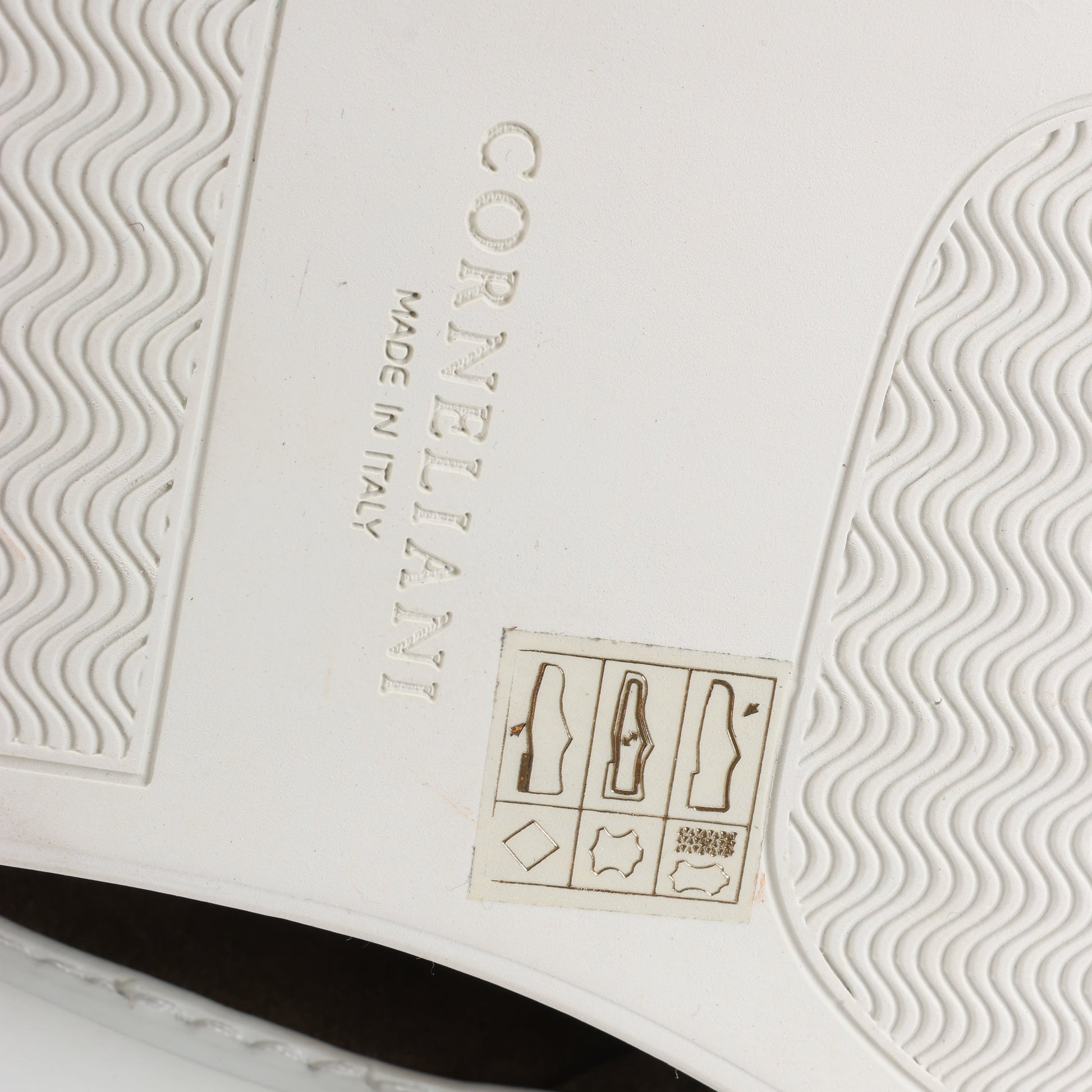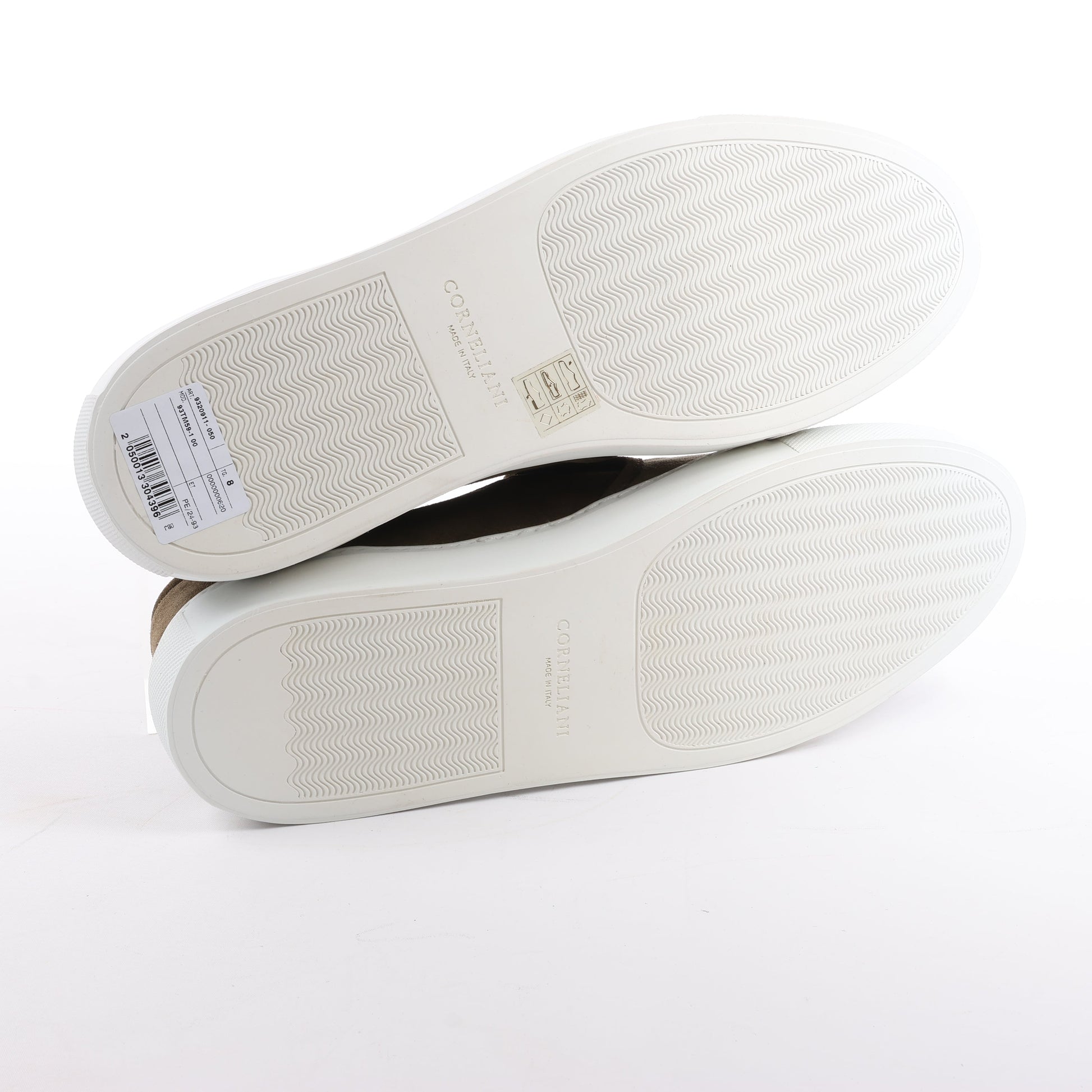 Corneliani slip-on sneakers in brown suede and cloth combine casual ease with refined Italian style. Featuring a contrast white sole and tonal paneling, this size 42.5 EU pair is a versatile staple for understated sophistication.