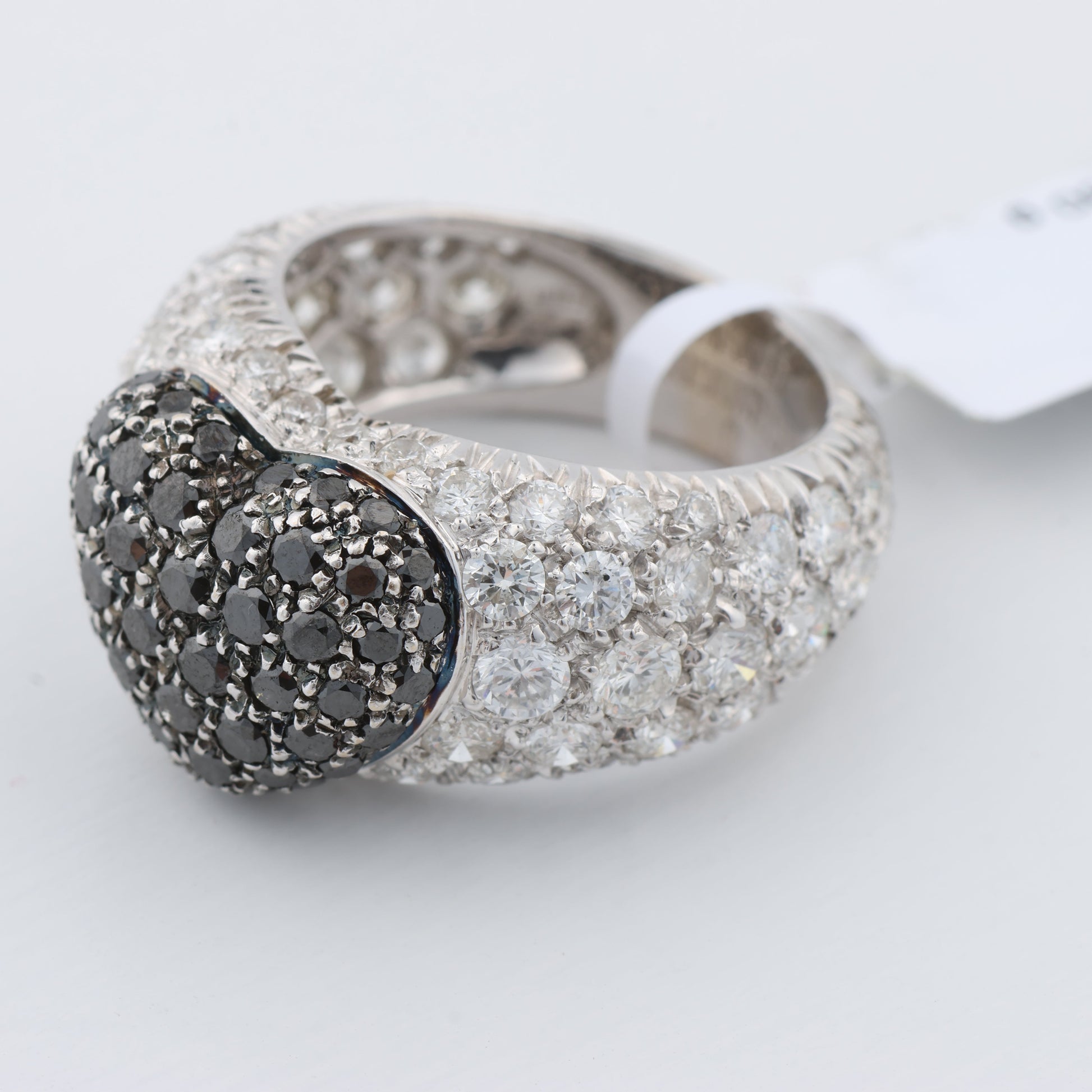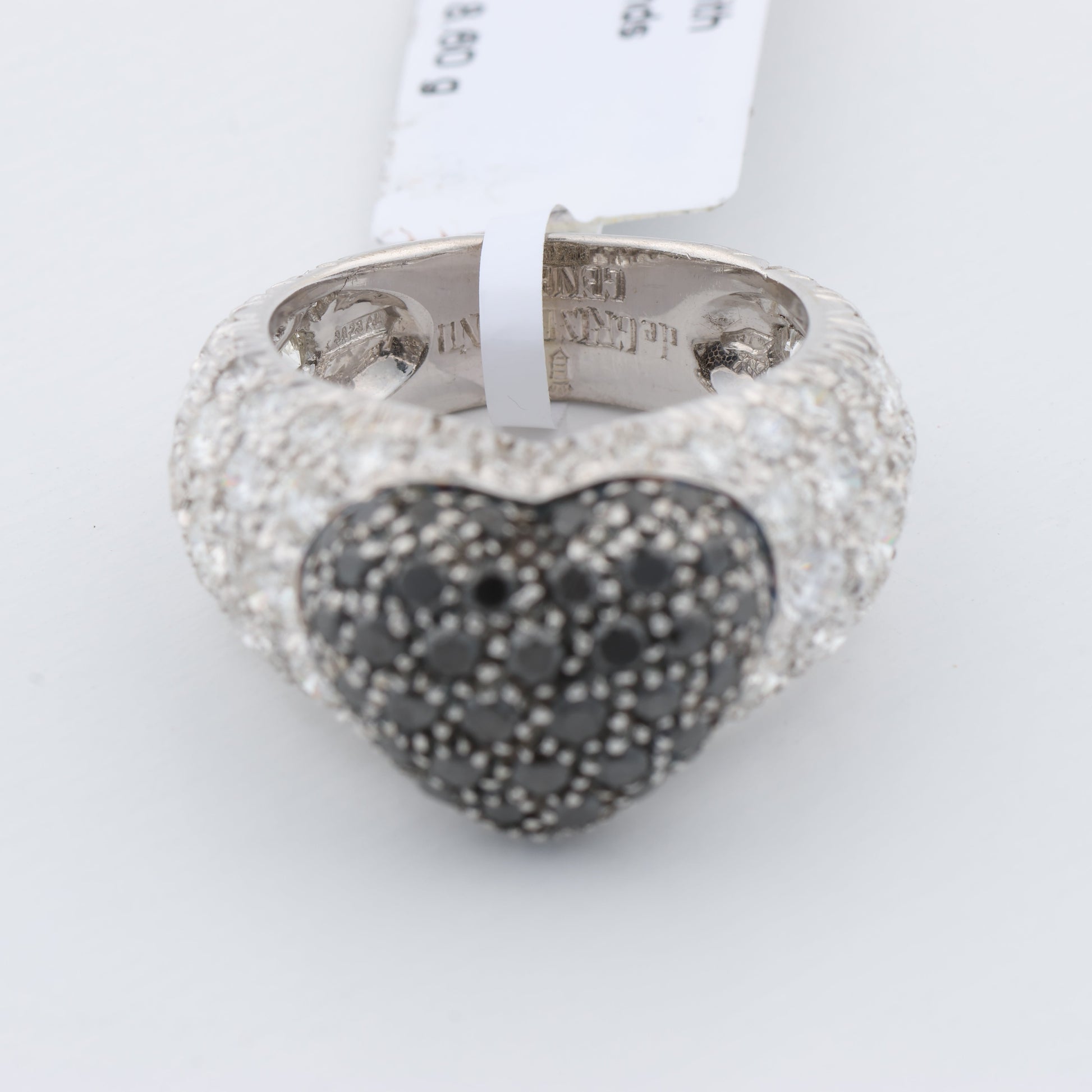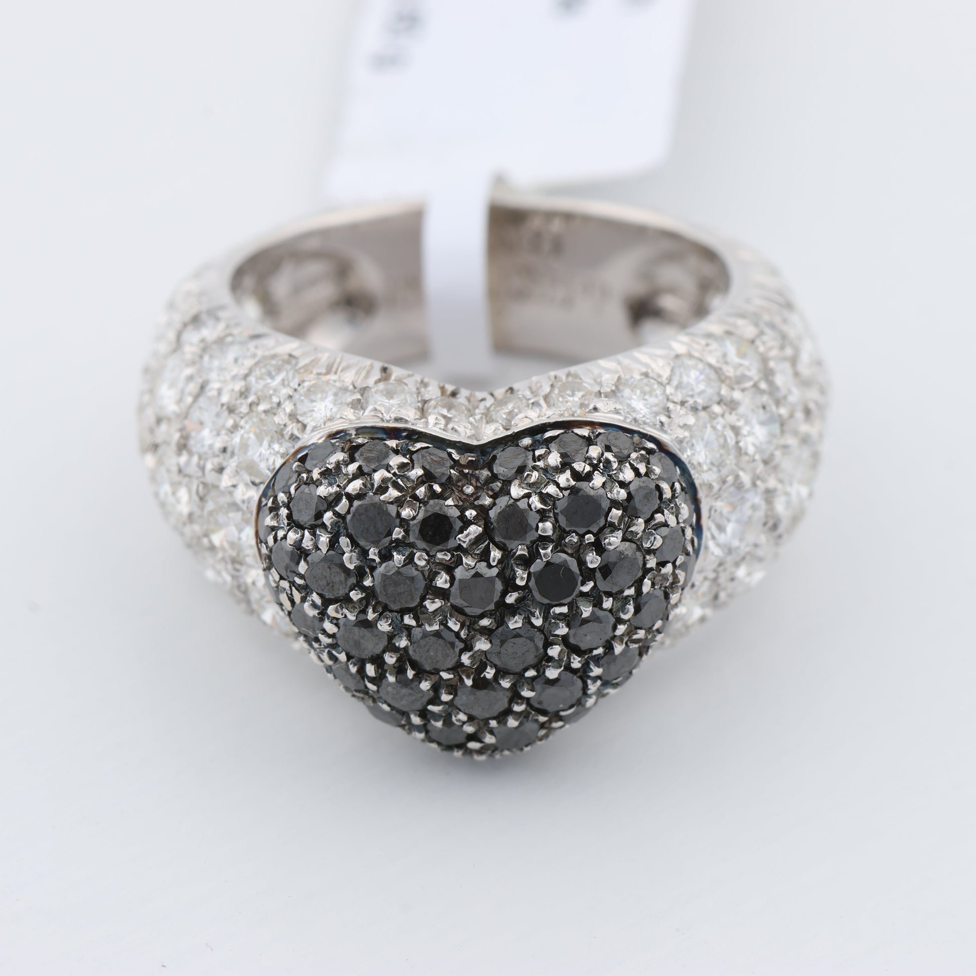 De Grisogono black diamond heart ring in 18K white gold, size 51. Featuring a dazzling pavé of 63 near-colorless diamonds and 49 black diamonds, totaling approximately 3.6 carats. A bold yet elegant statement piece with certified authenticity and expert craftsmanship.
