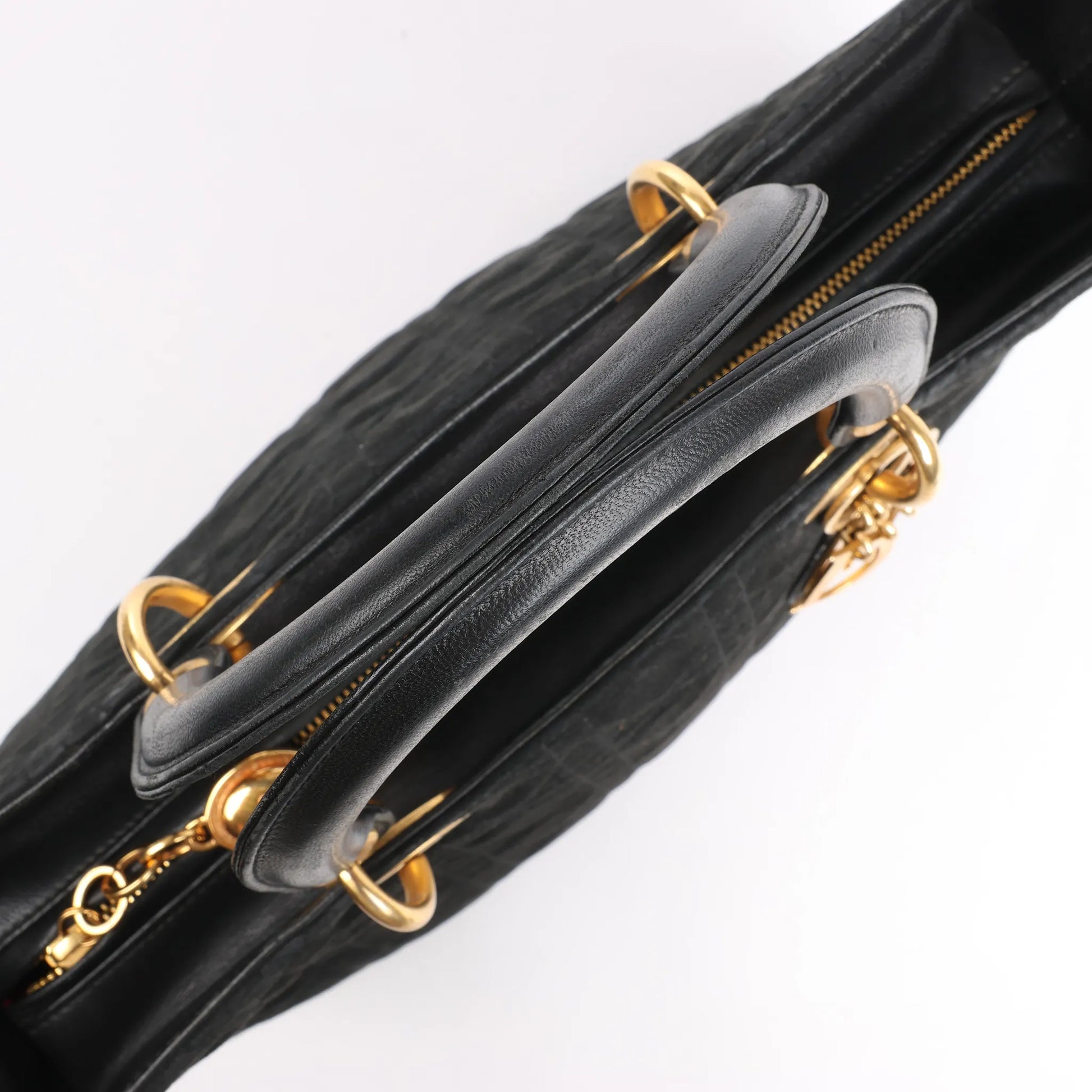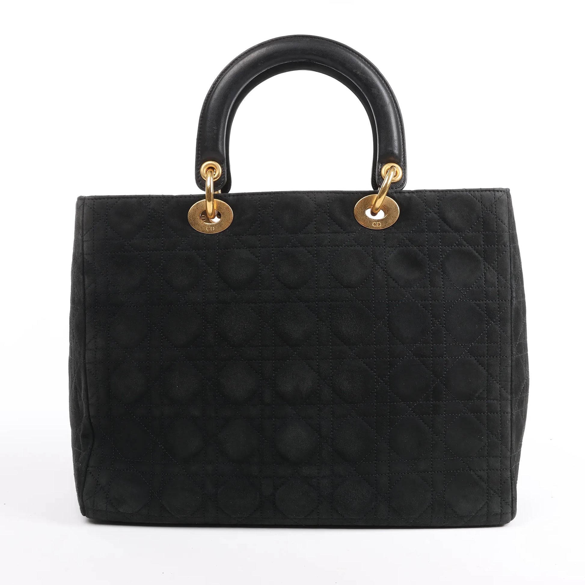 The Dior Lady Dior Cannage Large Handbag in Black blends elegance and versatility, featuring luxurious suede with leather accents and iconic cannage stitching. Gold-tone hardware and signature charms elevate this timeless must-have.