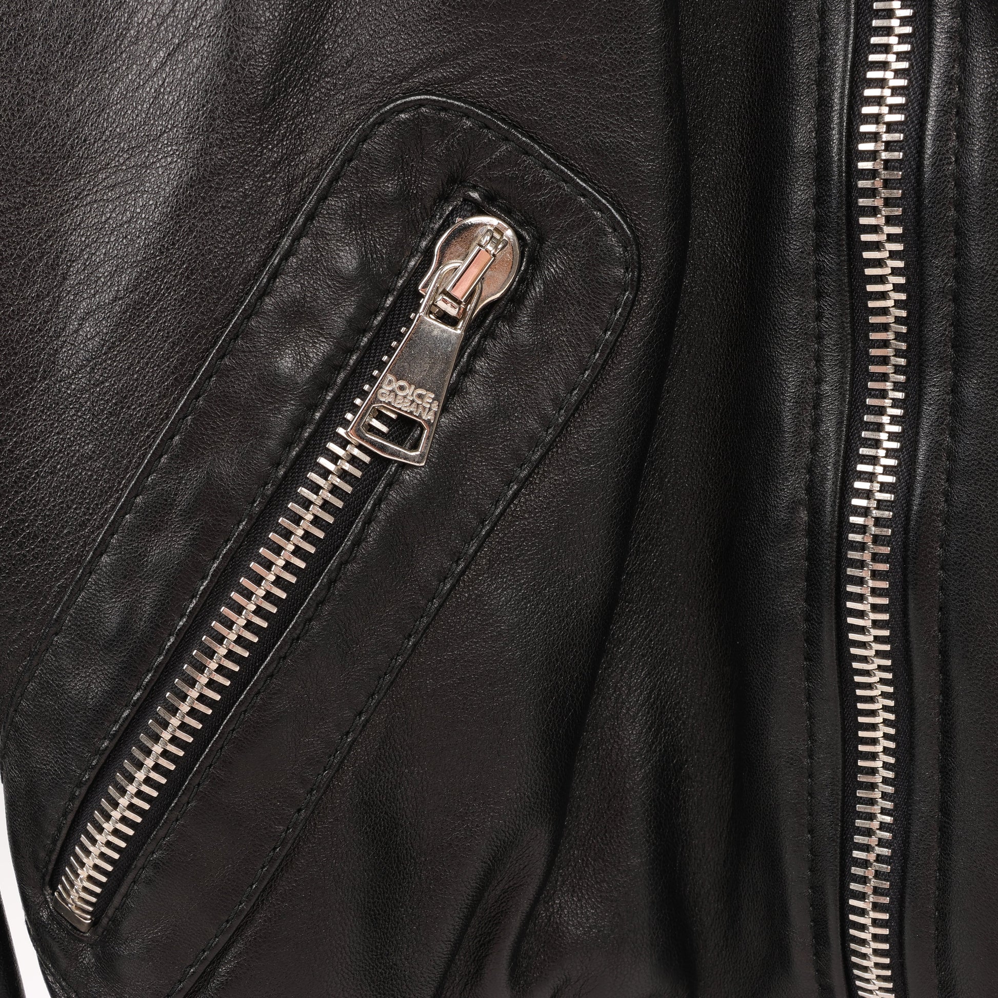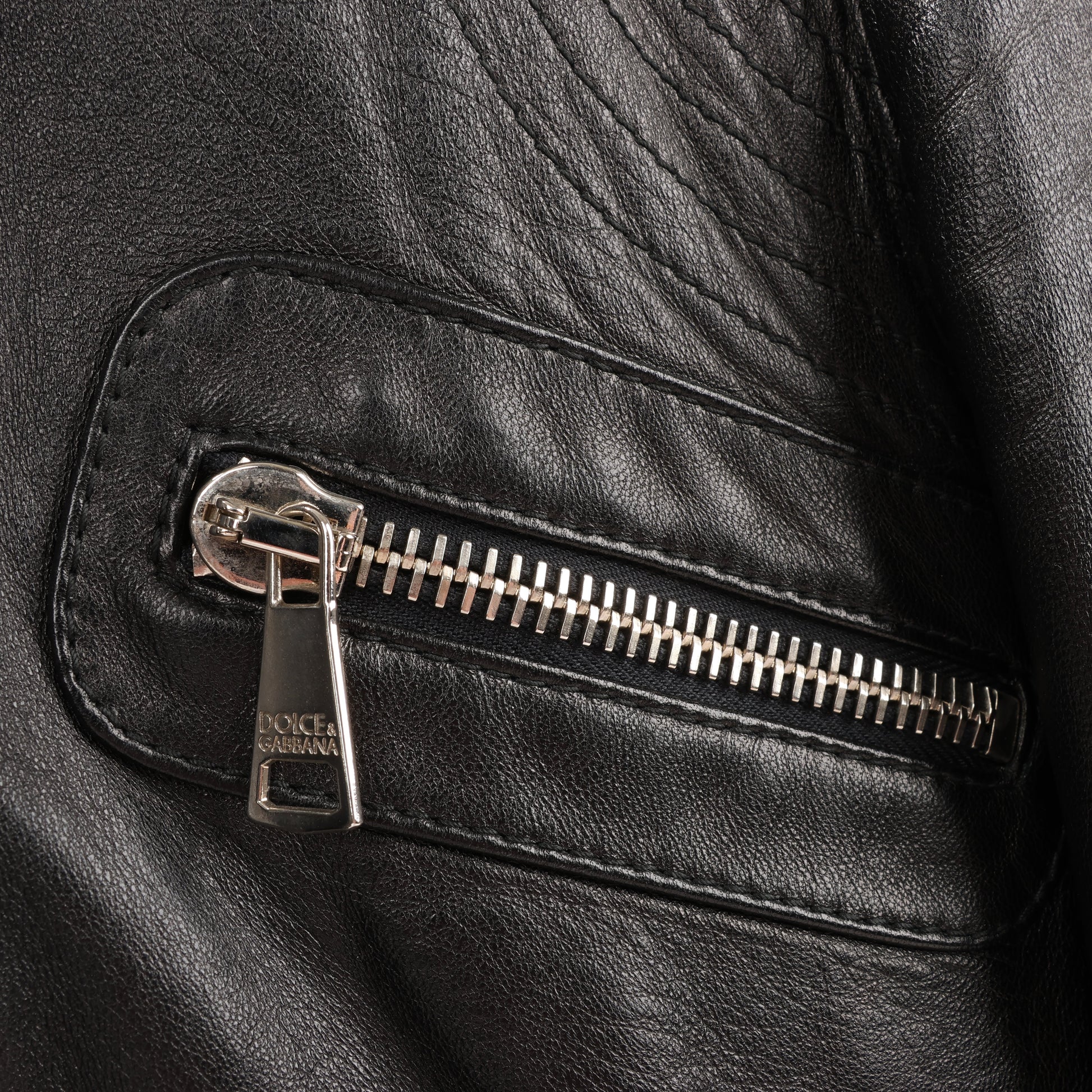 This edgy Dolce & Gabbana black leather biker jacket features multiple zippered pockets, ribbed cuffs and hem, and a snap-button collar. The interior boasts a bold leopard print lining. Made from sheepskin, this stylish piece is size 38.