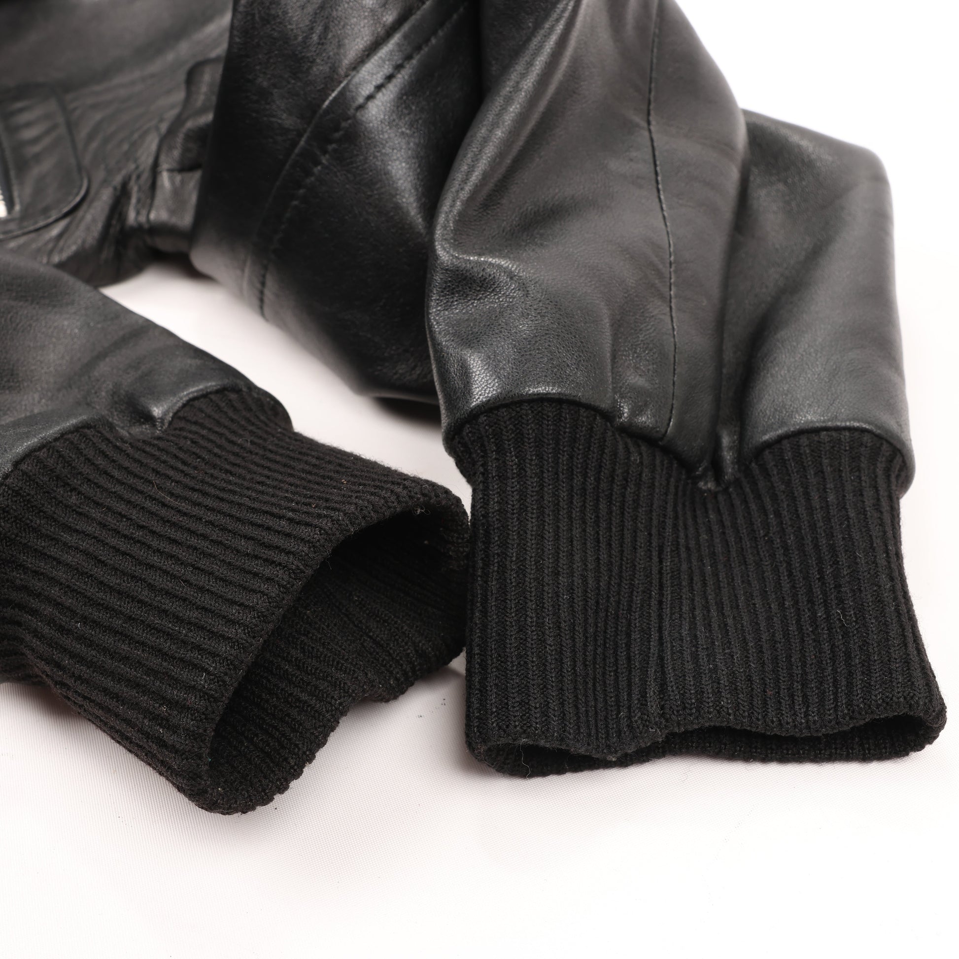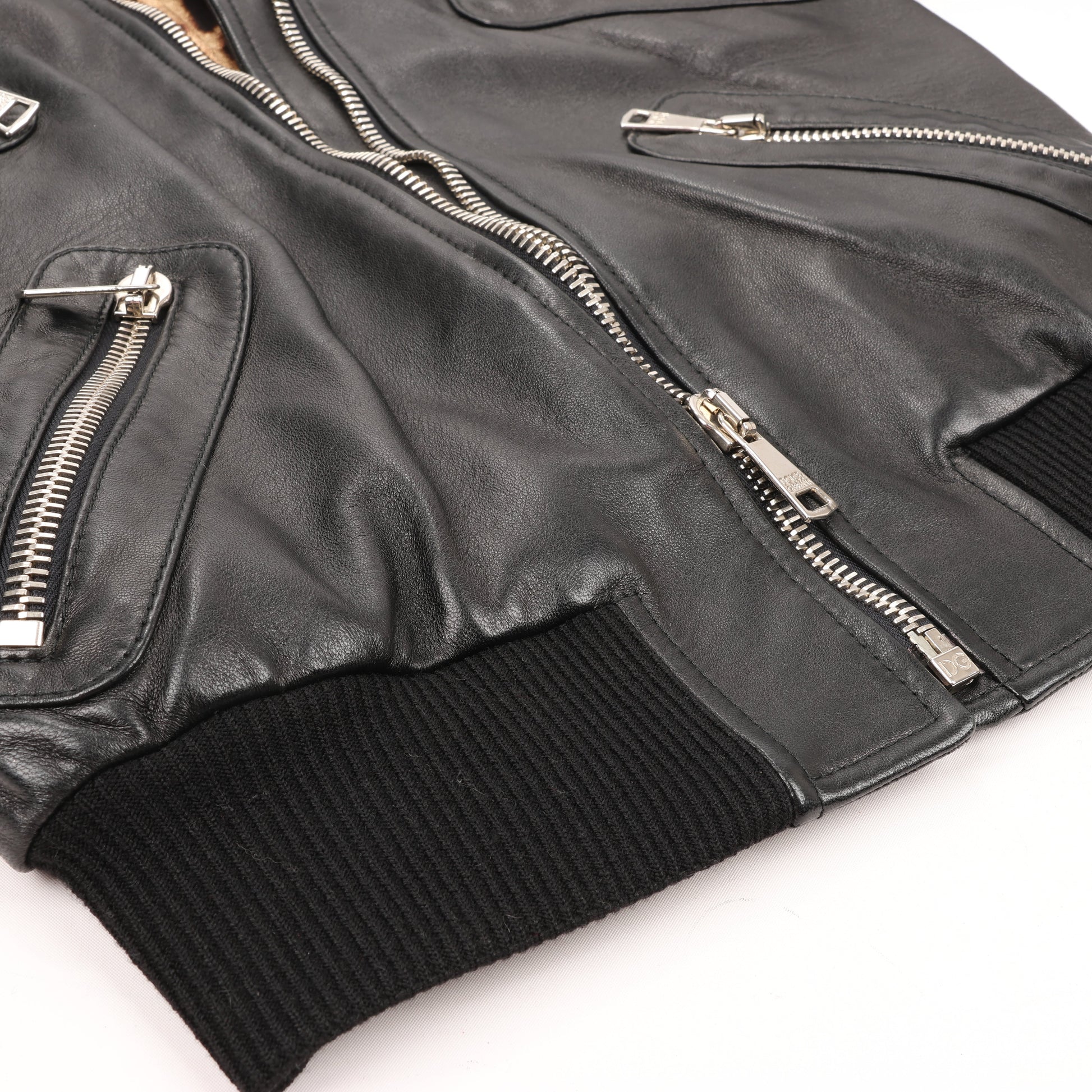 This edgy Dolce & Gabbana black leather biker jacket features multiple zippered pockets, ribbed cuffs and hem, and a snap-button collar. The interior boasts a bold leopard print lining. Made from sheepskin, this stylish piece is size 38.