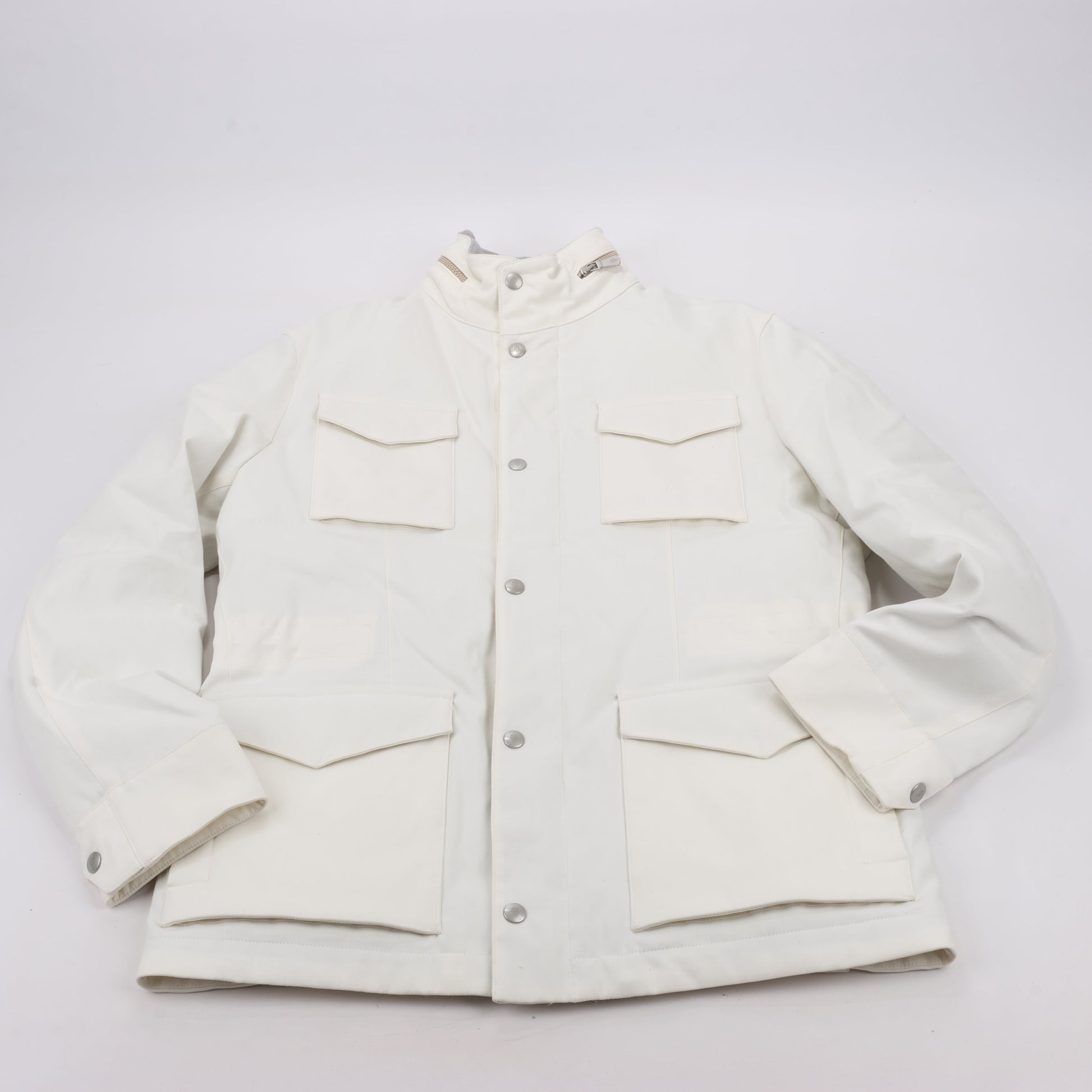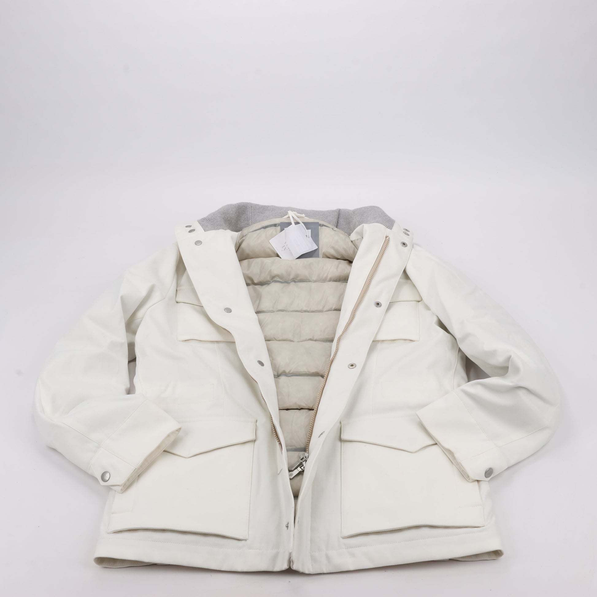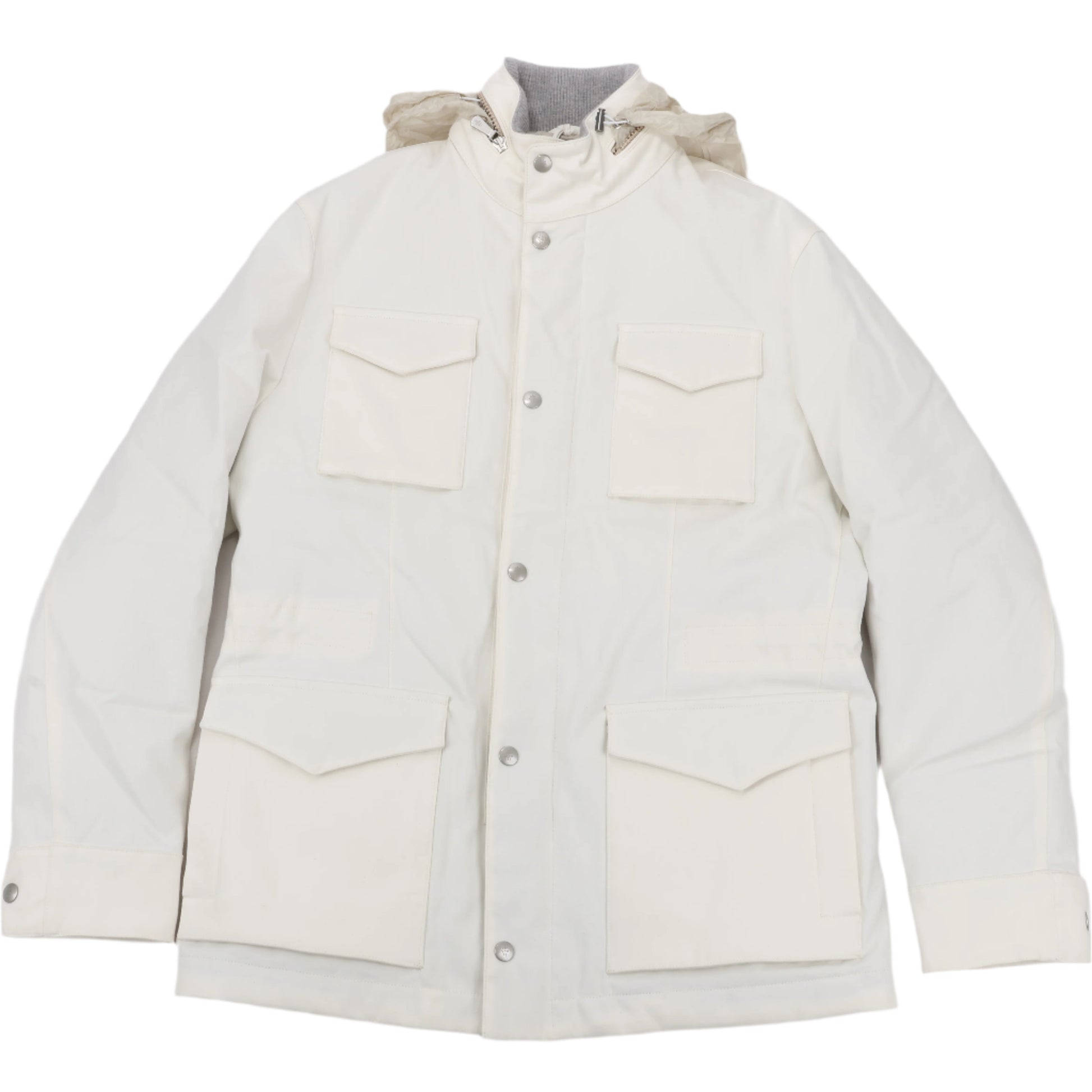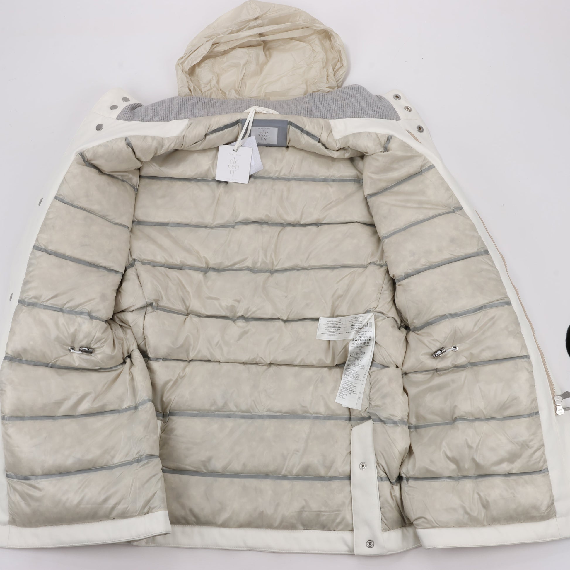 This Eleventy white jacket combines luxury with functionality, featuring multiple front pockets, a detachable hood, and a warm quilted down lining. Perfect for both urban and outdoor settings, it balances style with cold-weather protection.
