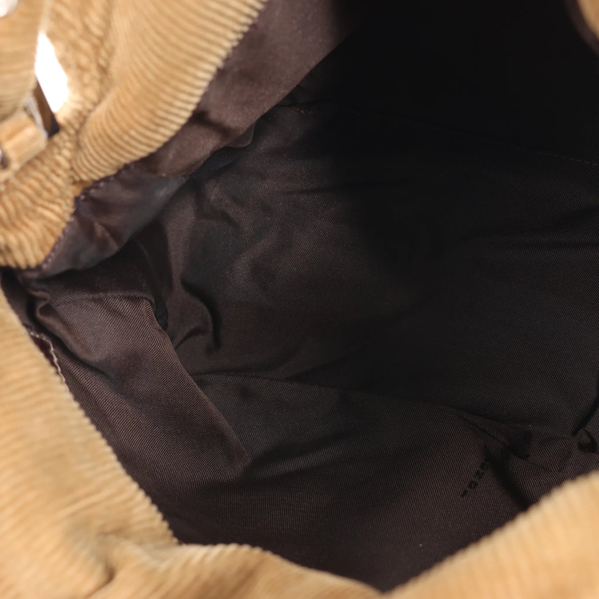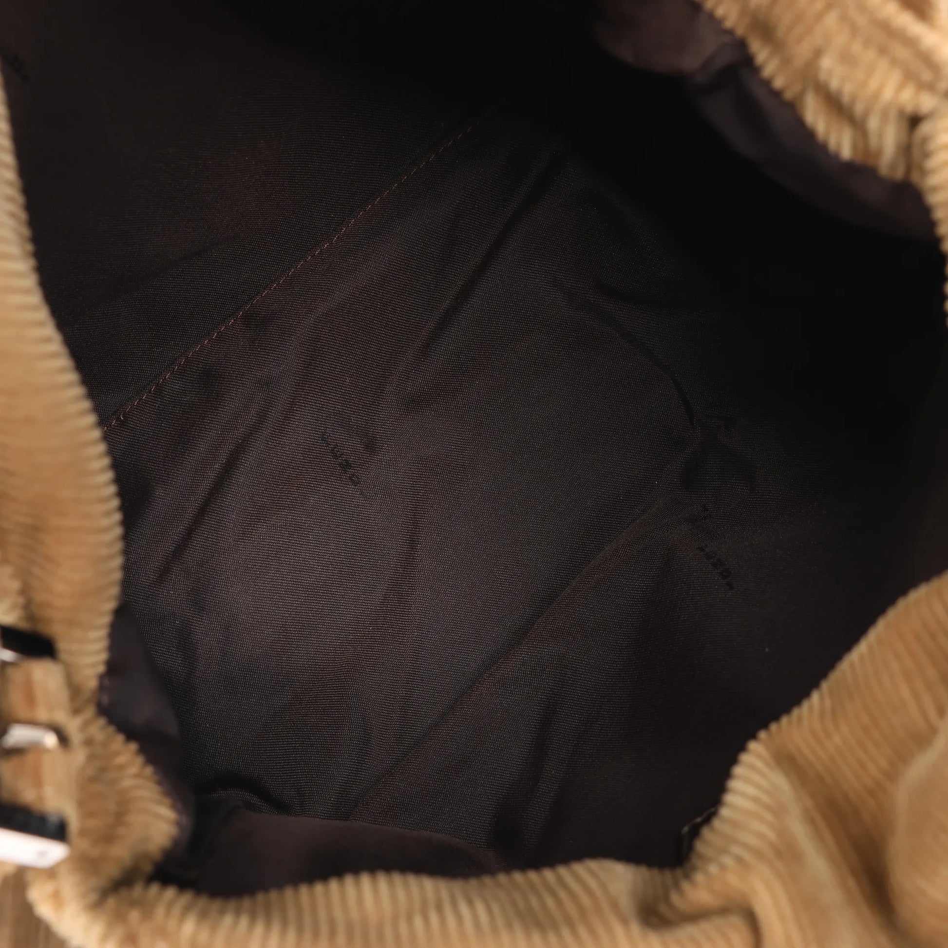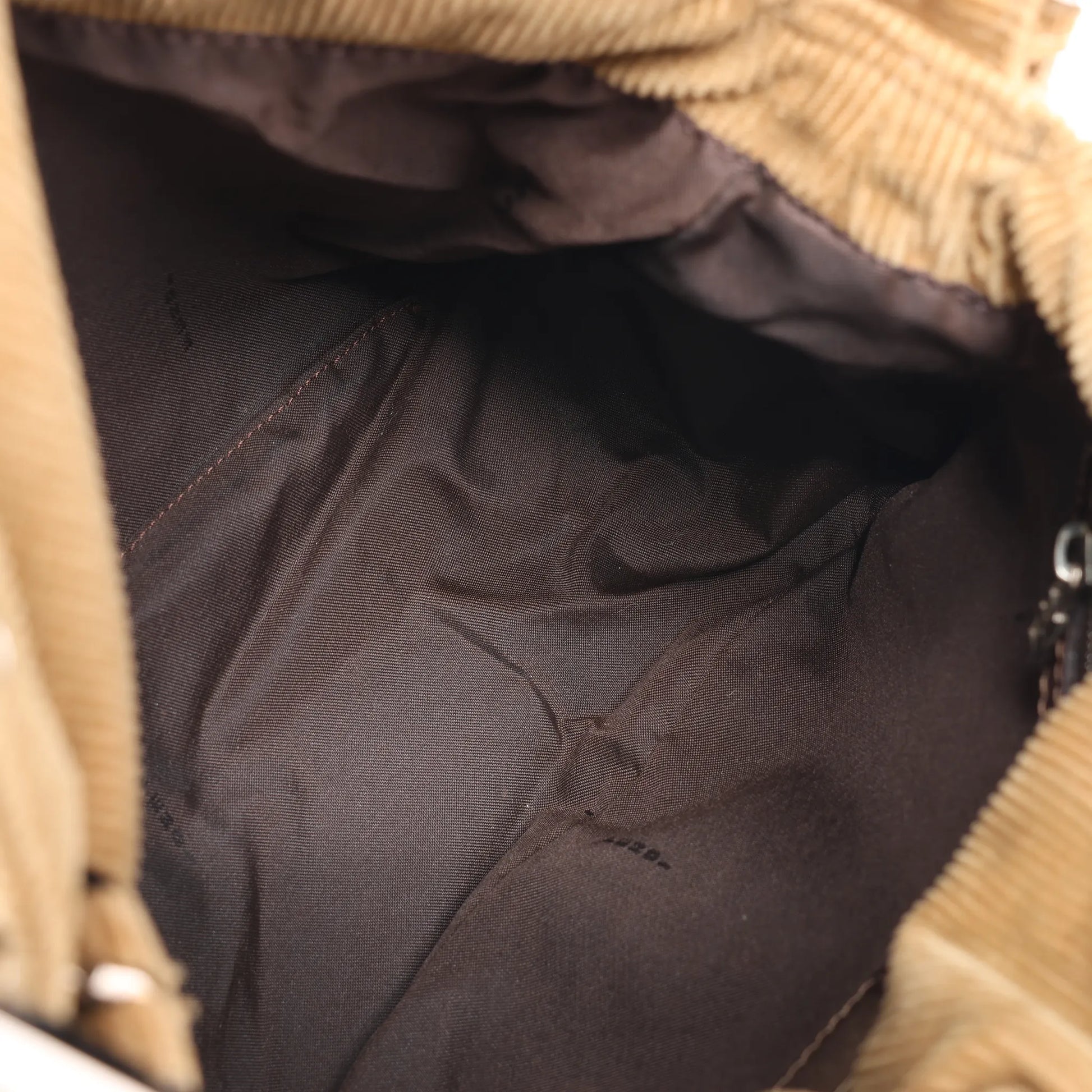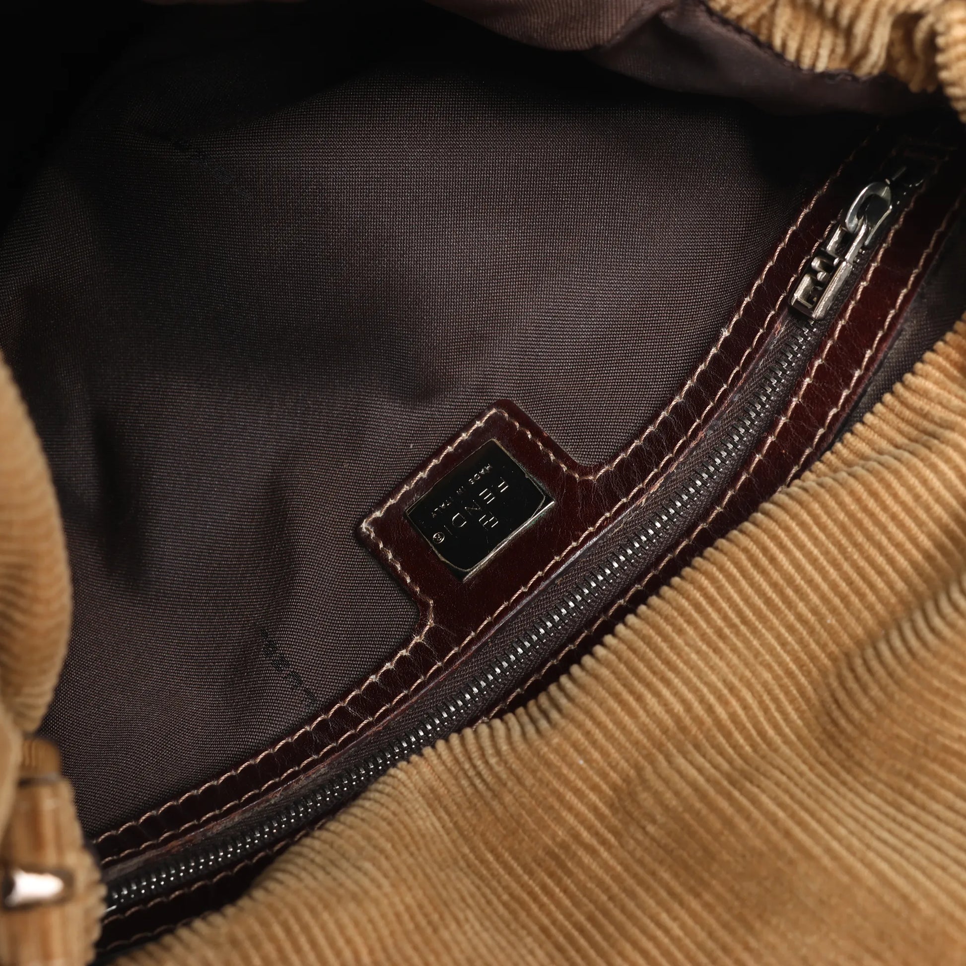 The FENDI Corduroy Double Flap Baguette Shoulder Bag 26426 in camel offers a cozy, retro-inspired twist on an iconic silhouette. Crafted from soft corduroy with a silver-tone FF buckle, it's the perfect casual-luxe accessory for everyday chic.