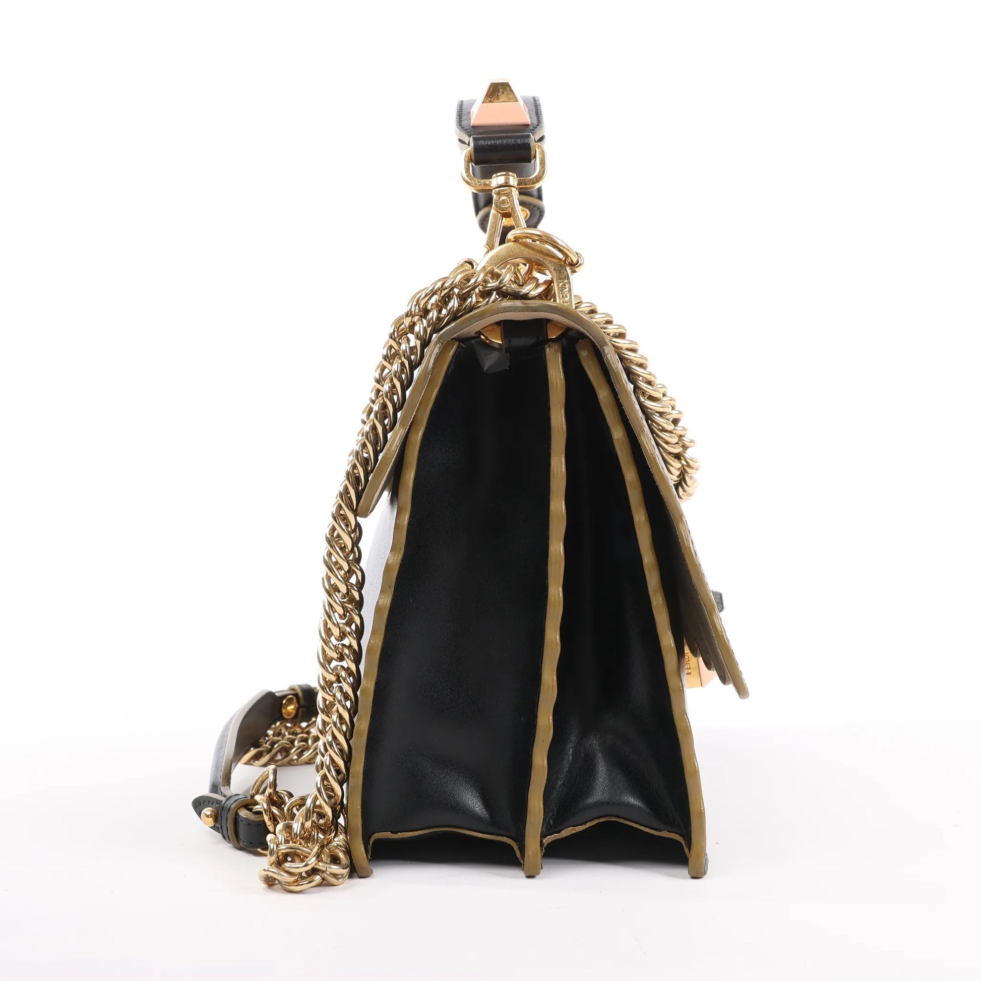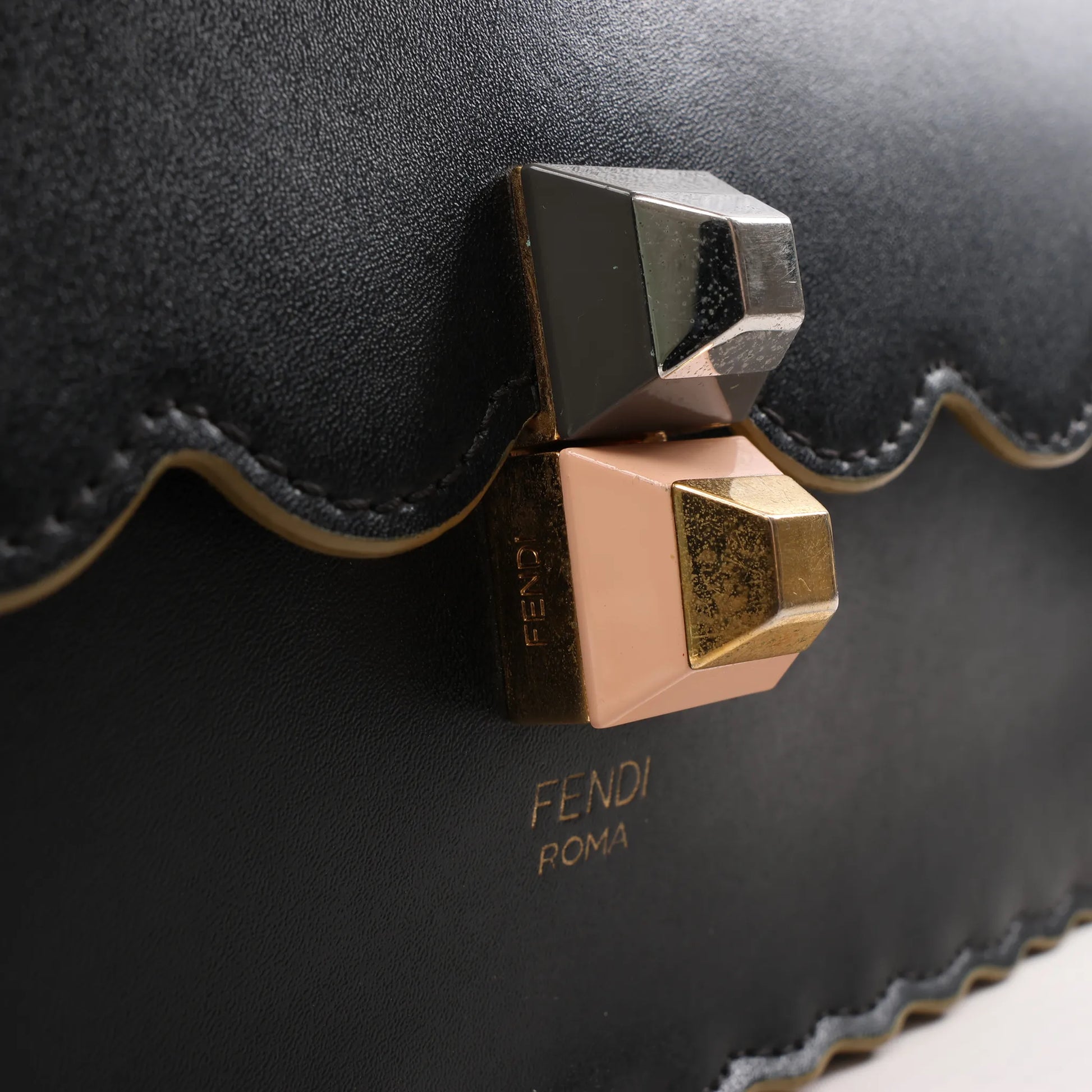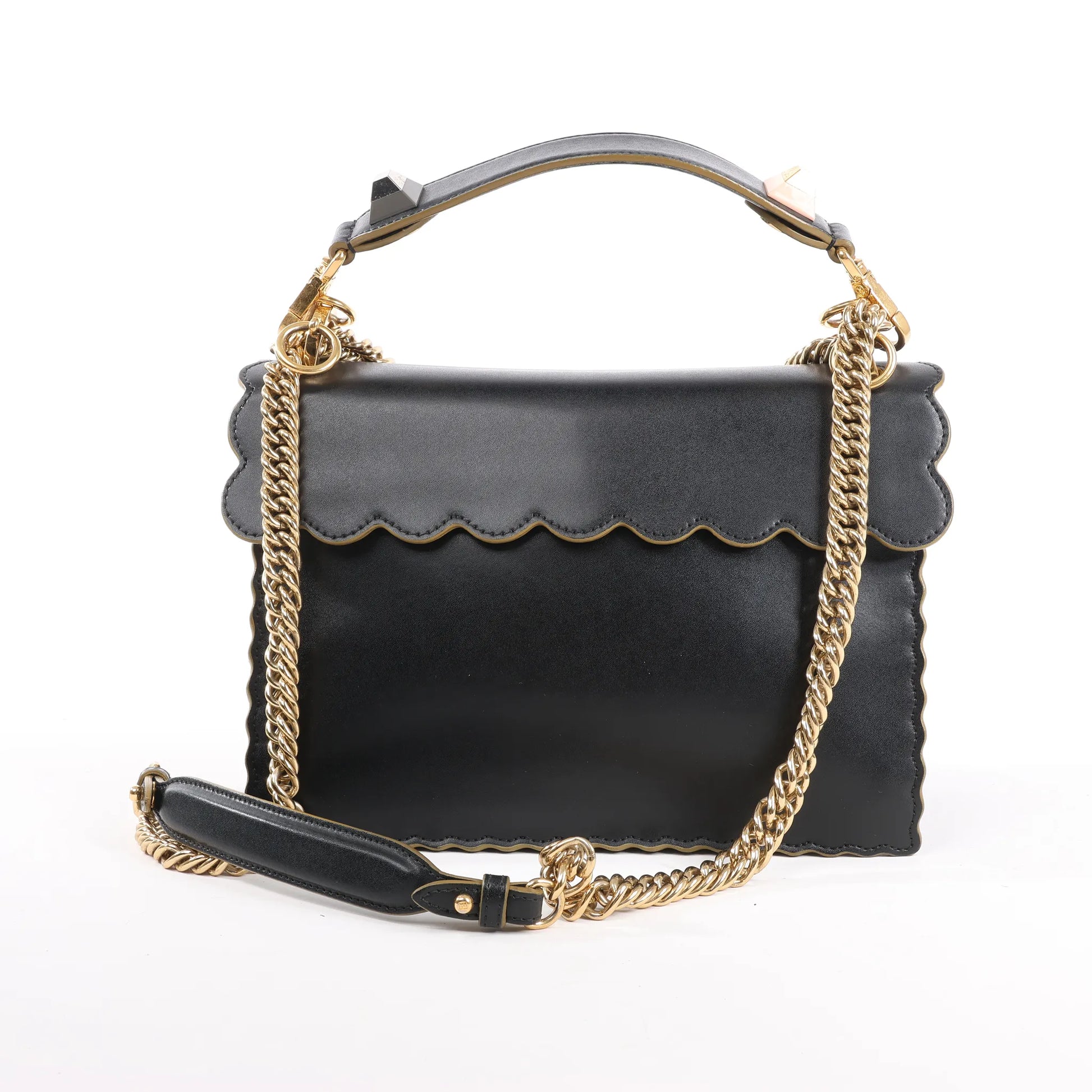 Elevate your elegance with the FENDI Kan I 2Way Handbag 8BT283 in sleek black leather. Featuring a signature scalloped edge, bold gold-tone chain strap, and iconic pyramid stud clasp, this structured piece is perfect for refined day-to-night styling.