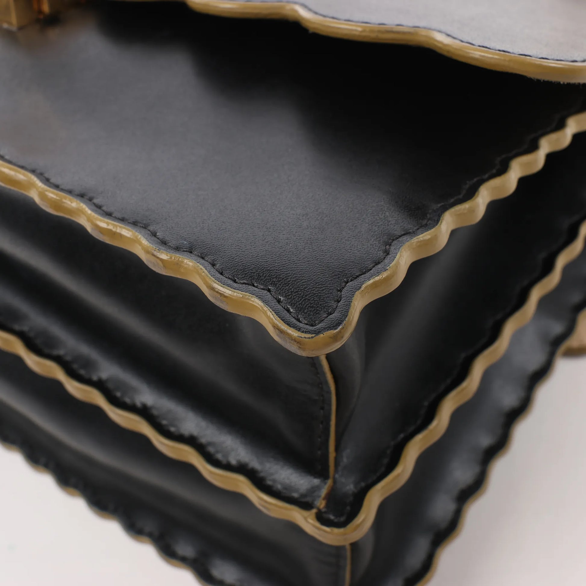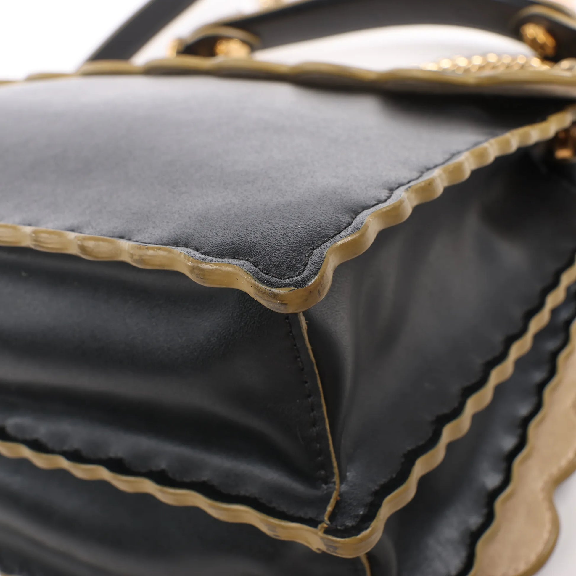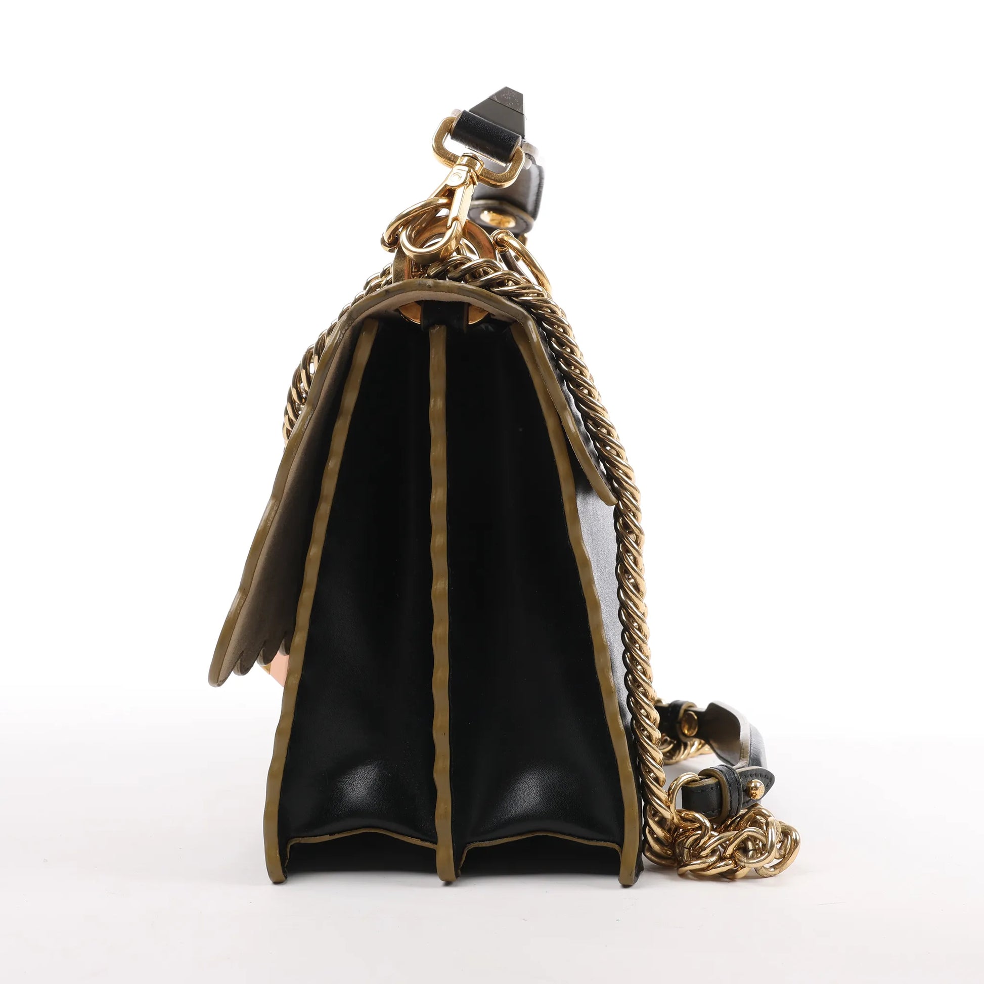 Elevate your elegance with the FENDI Kan I 2Way Handbag 8BT283 in sleek black leather. Featuring a signature scalloped edge, bold gold-tone chain strap, and iconic pyramid stud clasp, this structured piece is perfect for refined day-to-night styling.