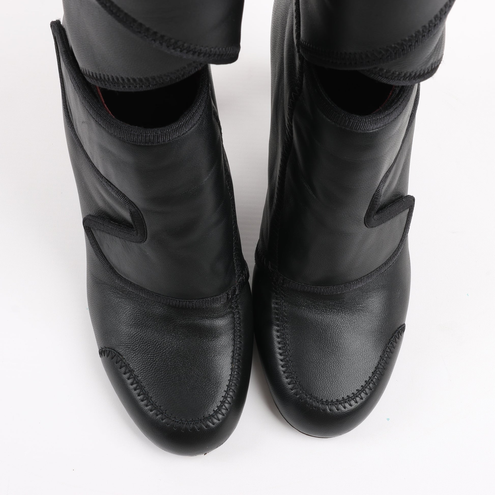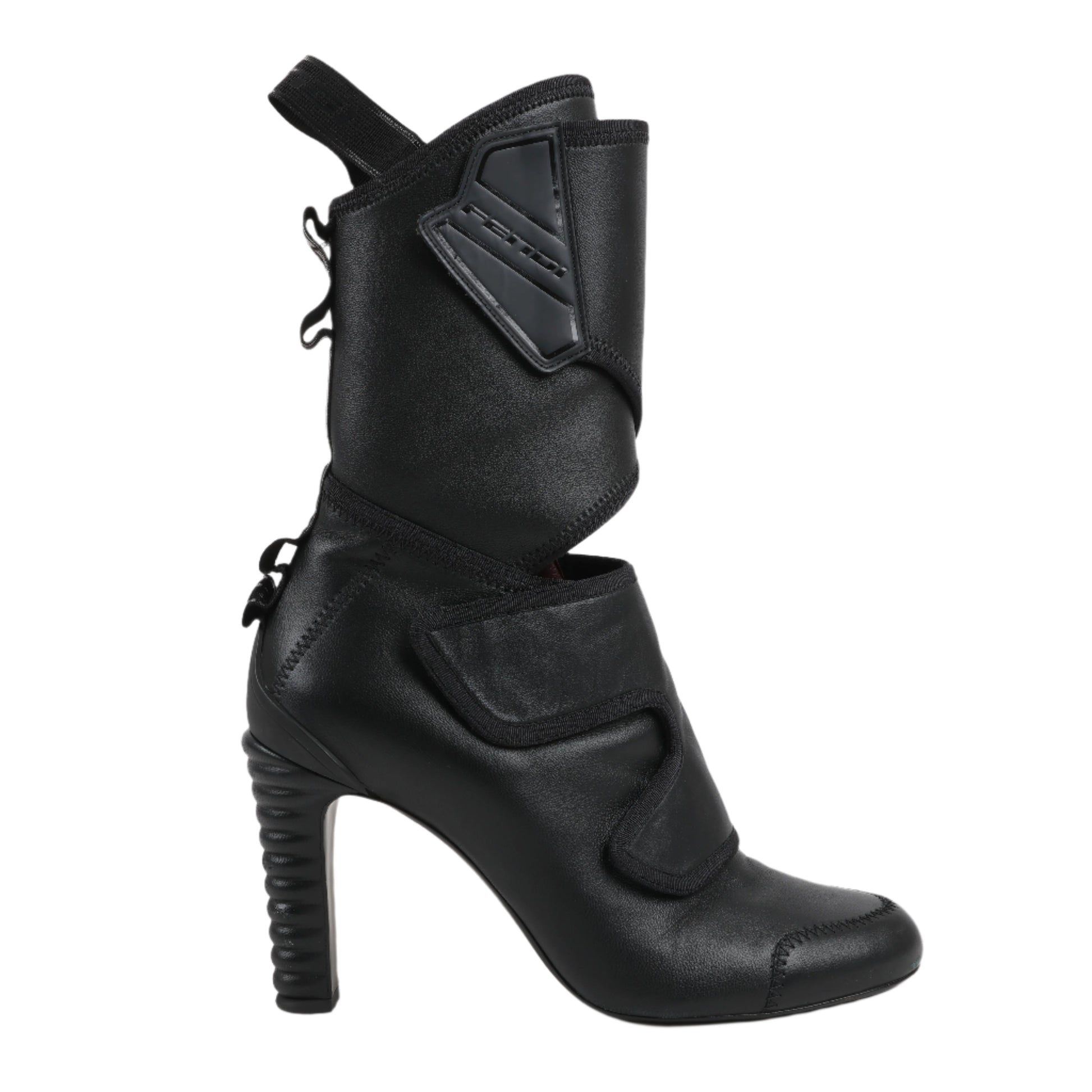 Edgy and sophisticated, these Fendi black leather ankle boots in size 38 EU feature a futuristic design with layered panels, bold stitching, and a sculpted heel. A statement piece that blends luxury with avant-garde style—perfect for elevating any look!
