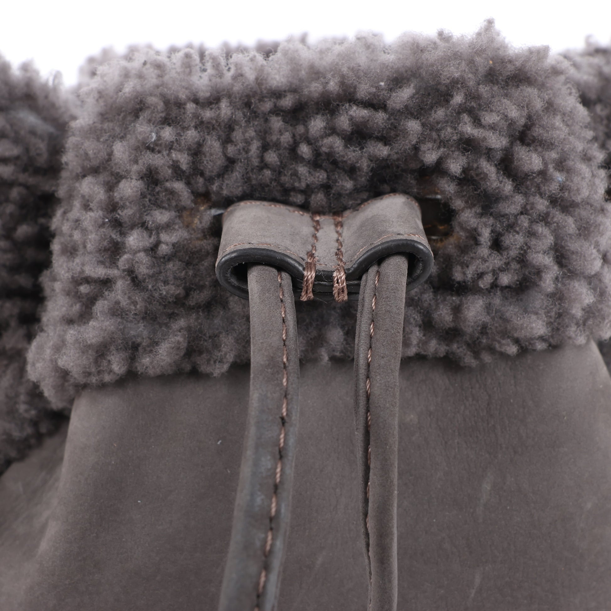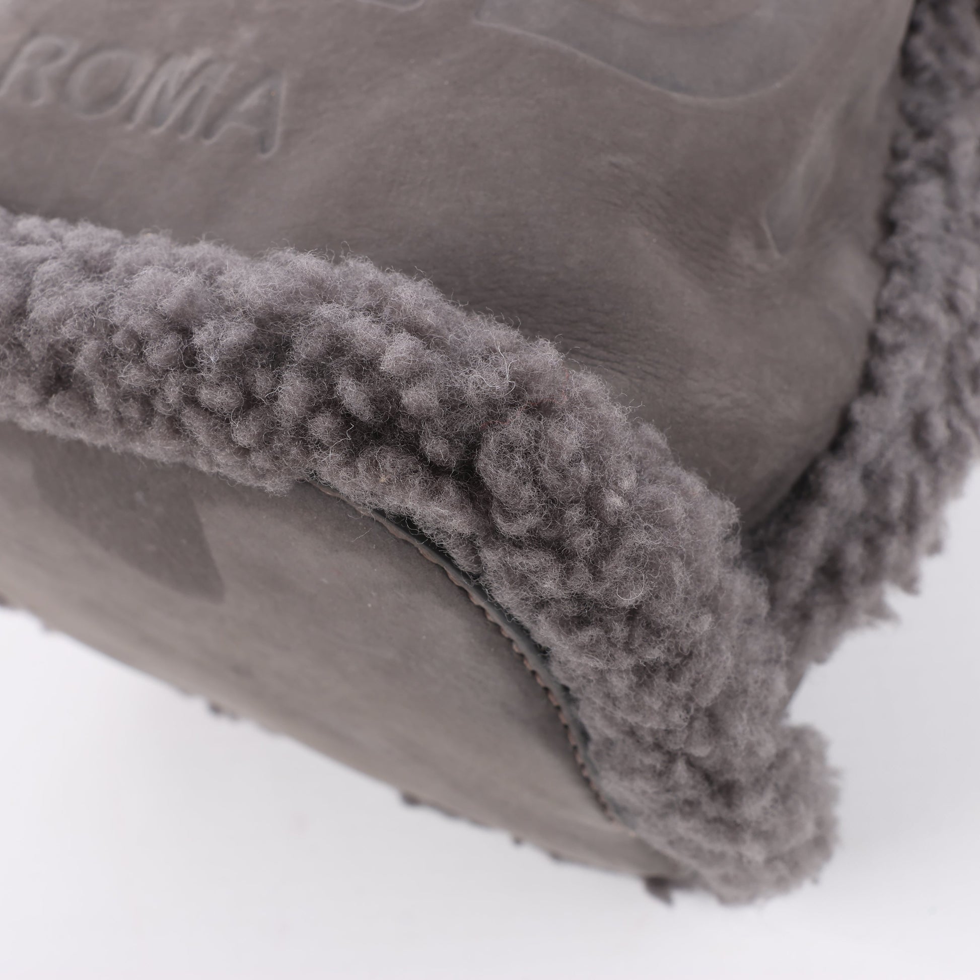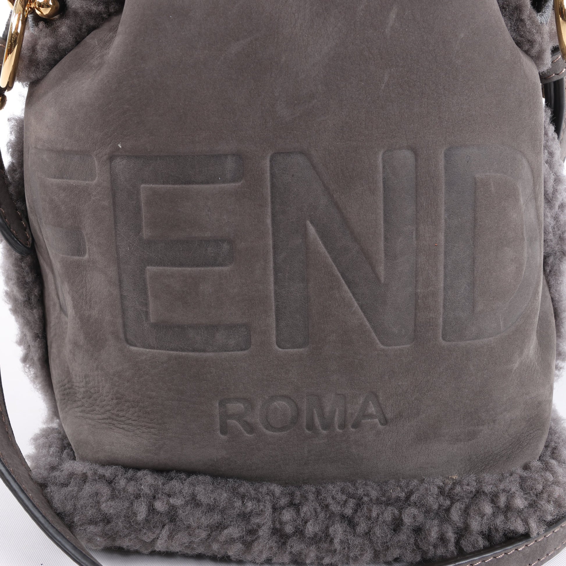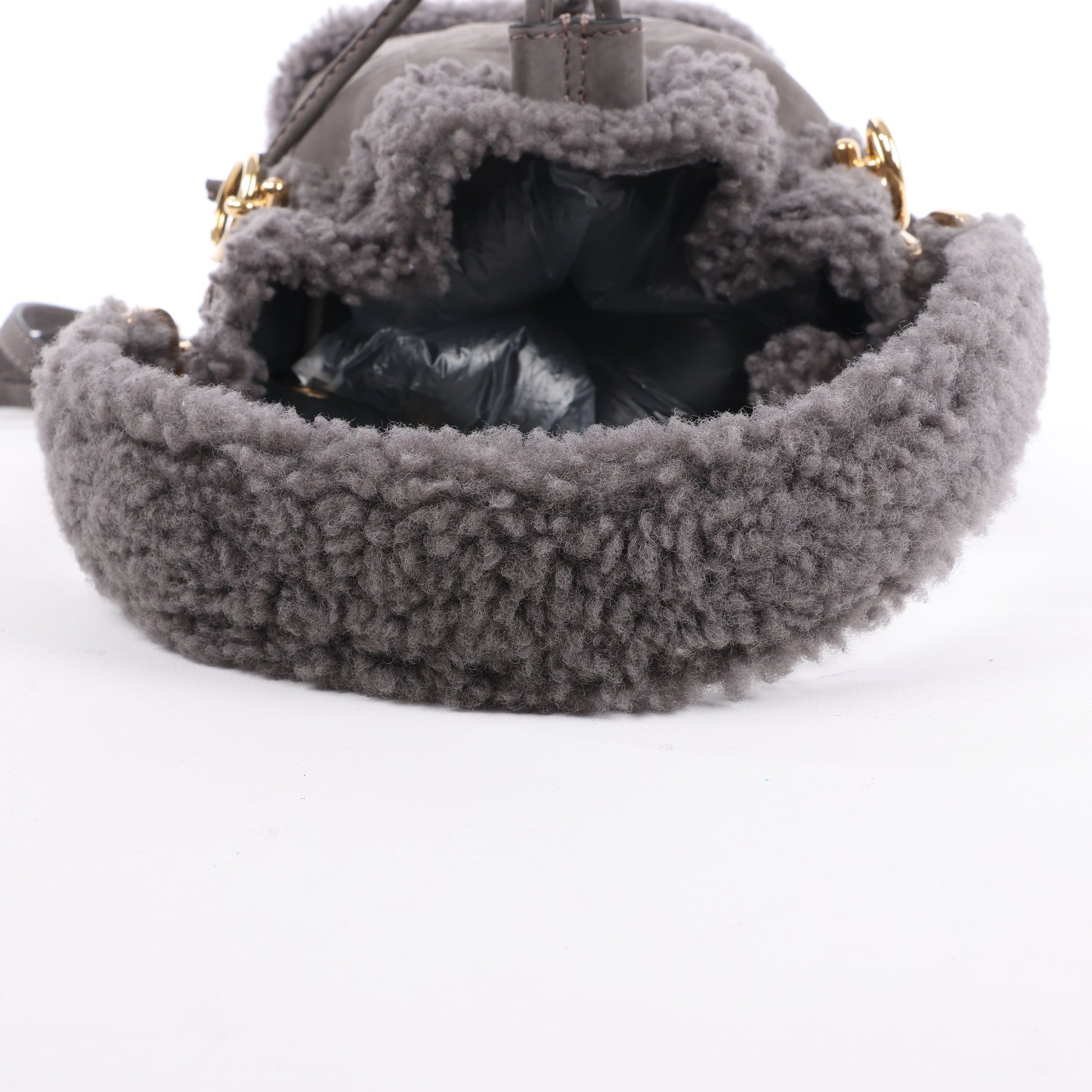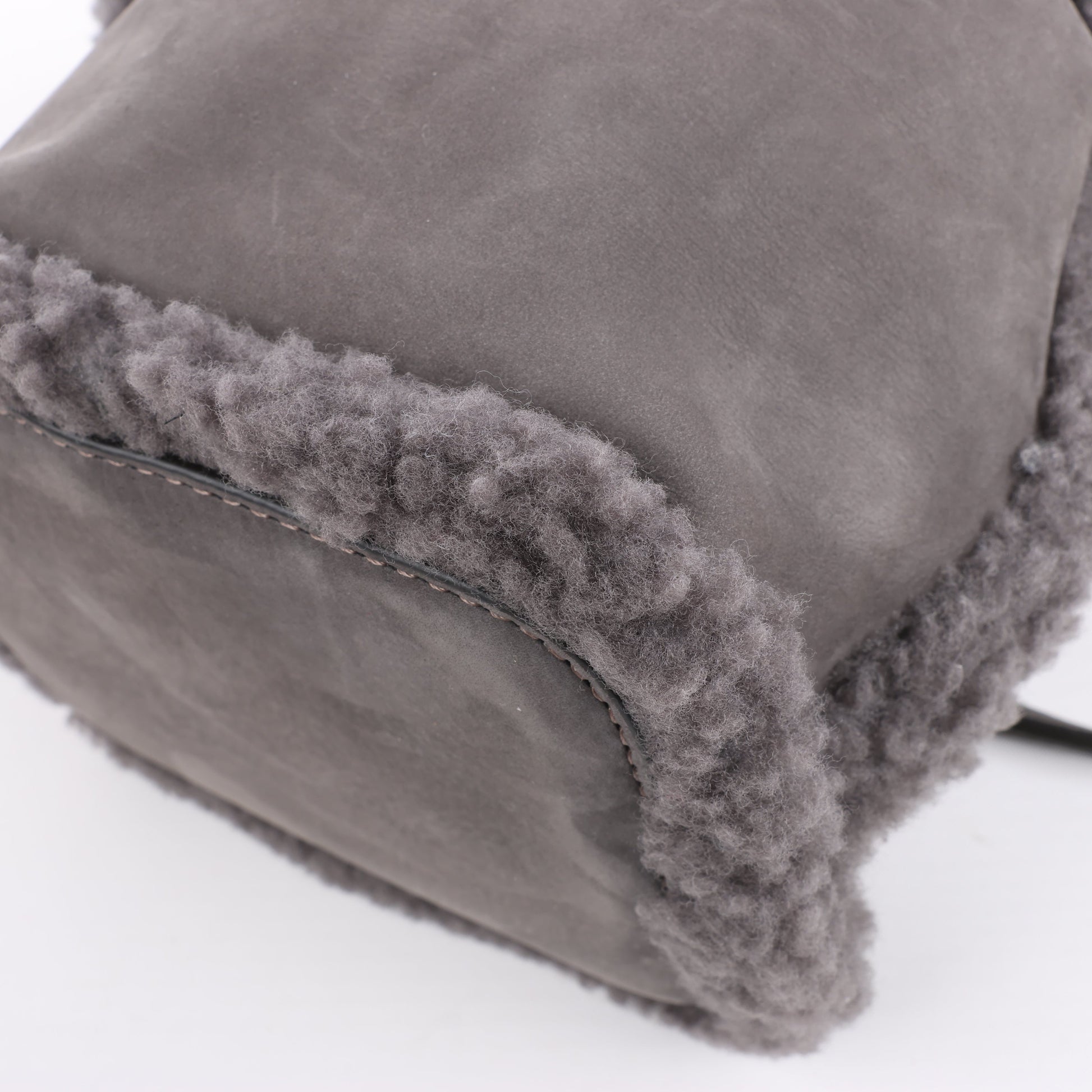 Fendi Mon Tresor Mini 2Way Bag 8BS010 in gray suede and boa. Cozy meets chic with soft mouton trim, embossed logo, and gold-tone accents—perfect for stylish cold-weather charm.
