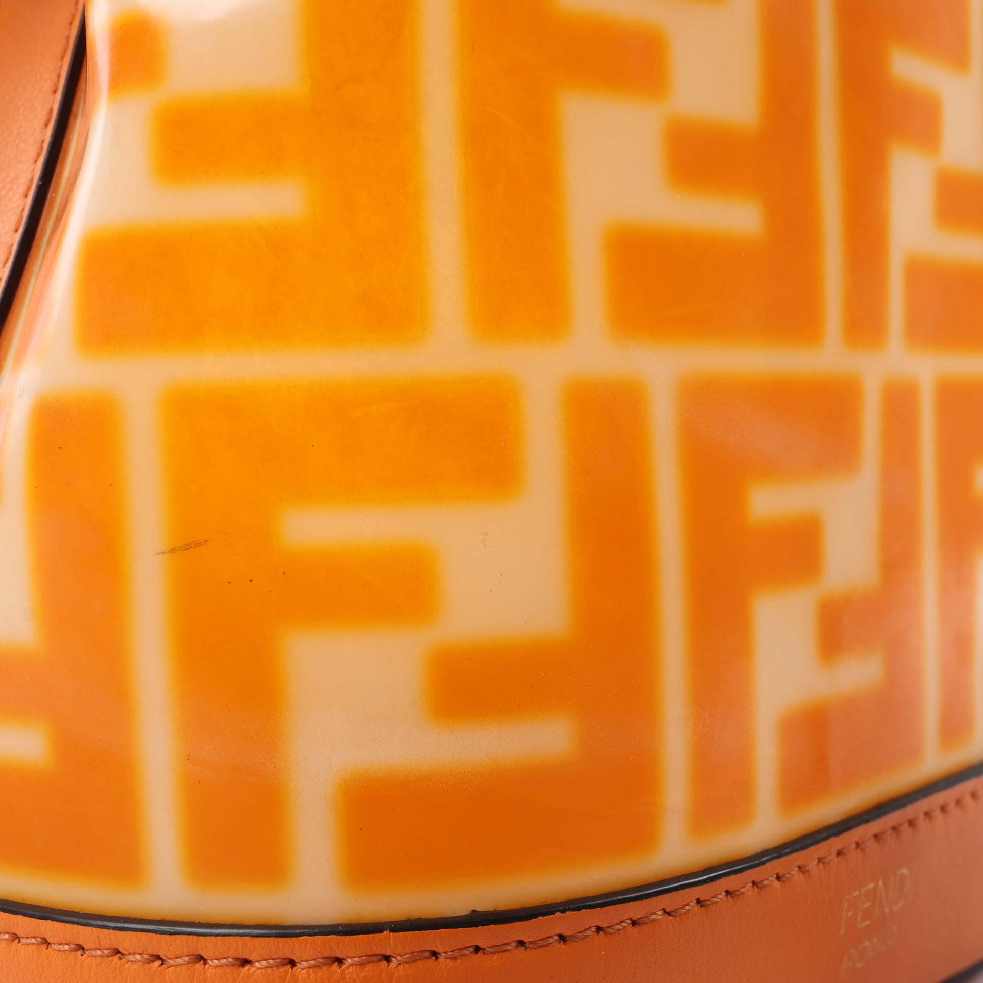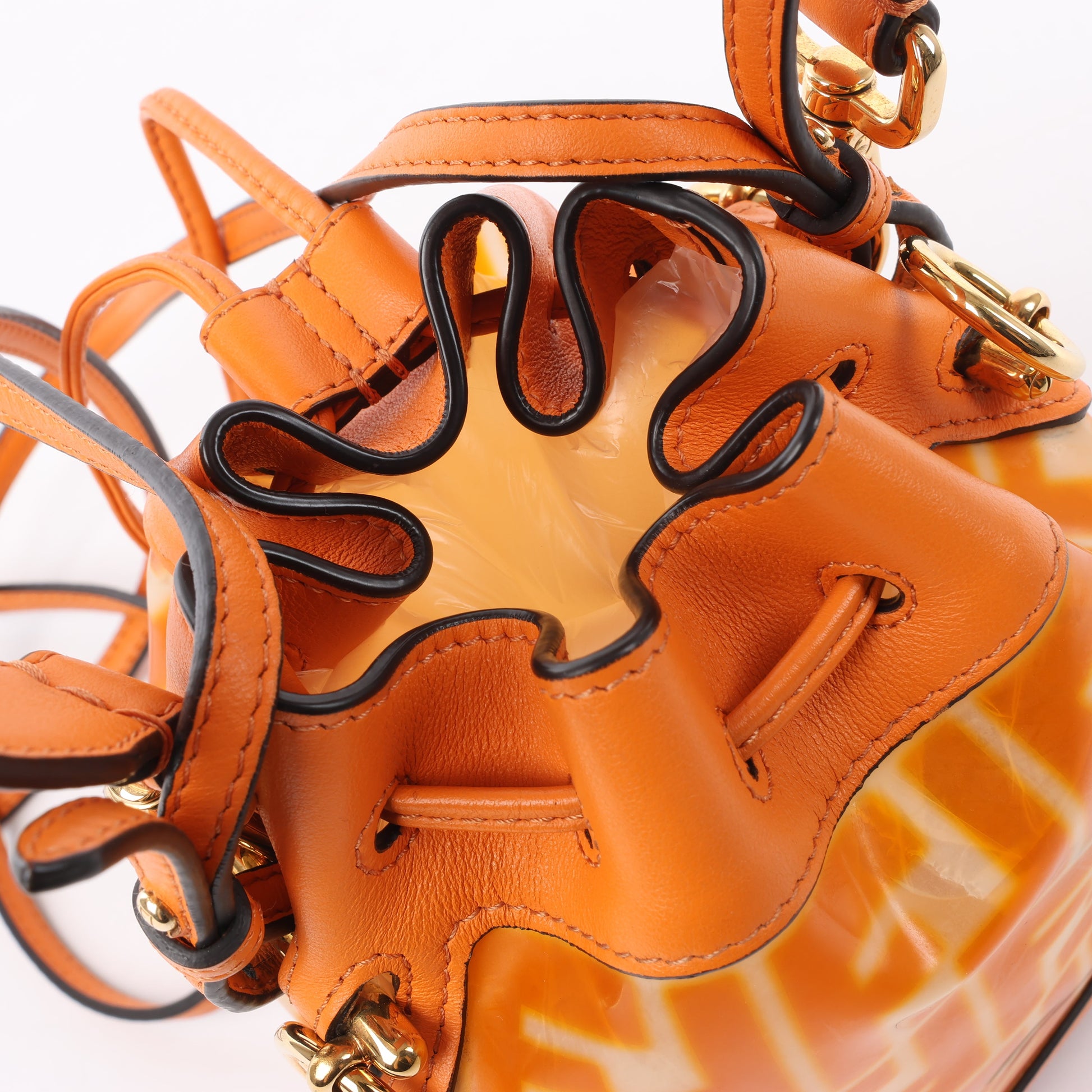 Vibrant and playful, this FENDI Mon Tresor Mini bag in orange PVC and leather features the bold FF motif, gold-tone hardware, and dual carry options. A standout mini bucket for chic, on-the-go style.