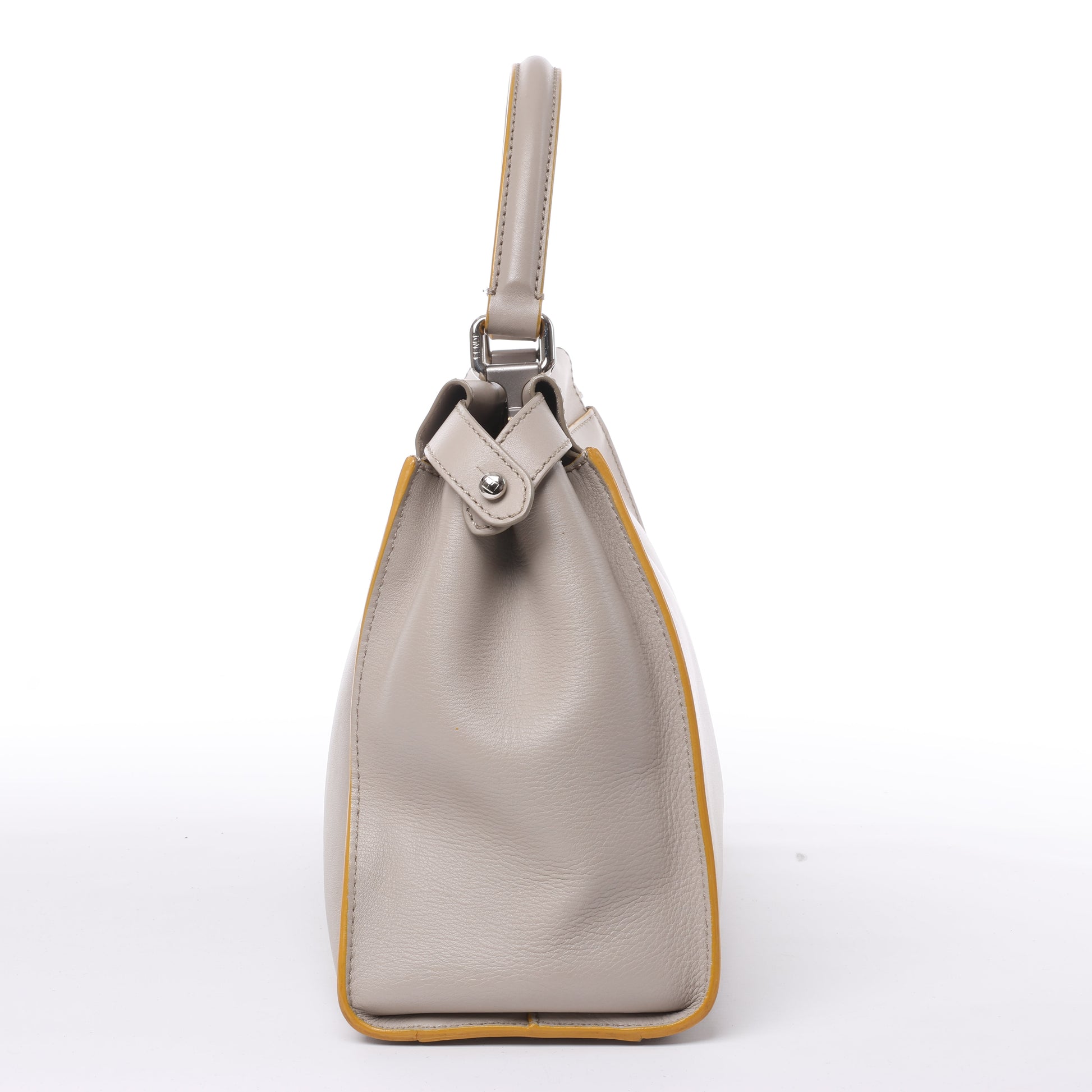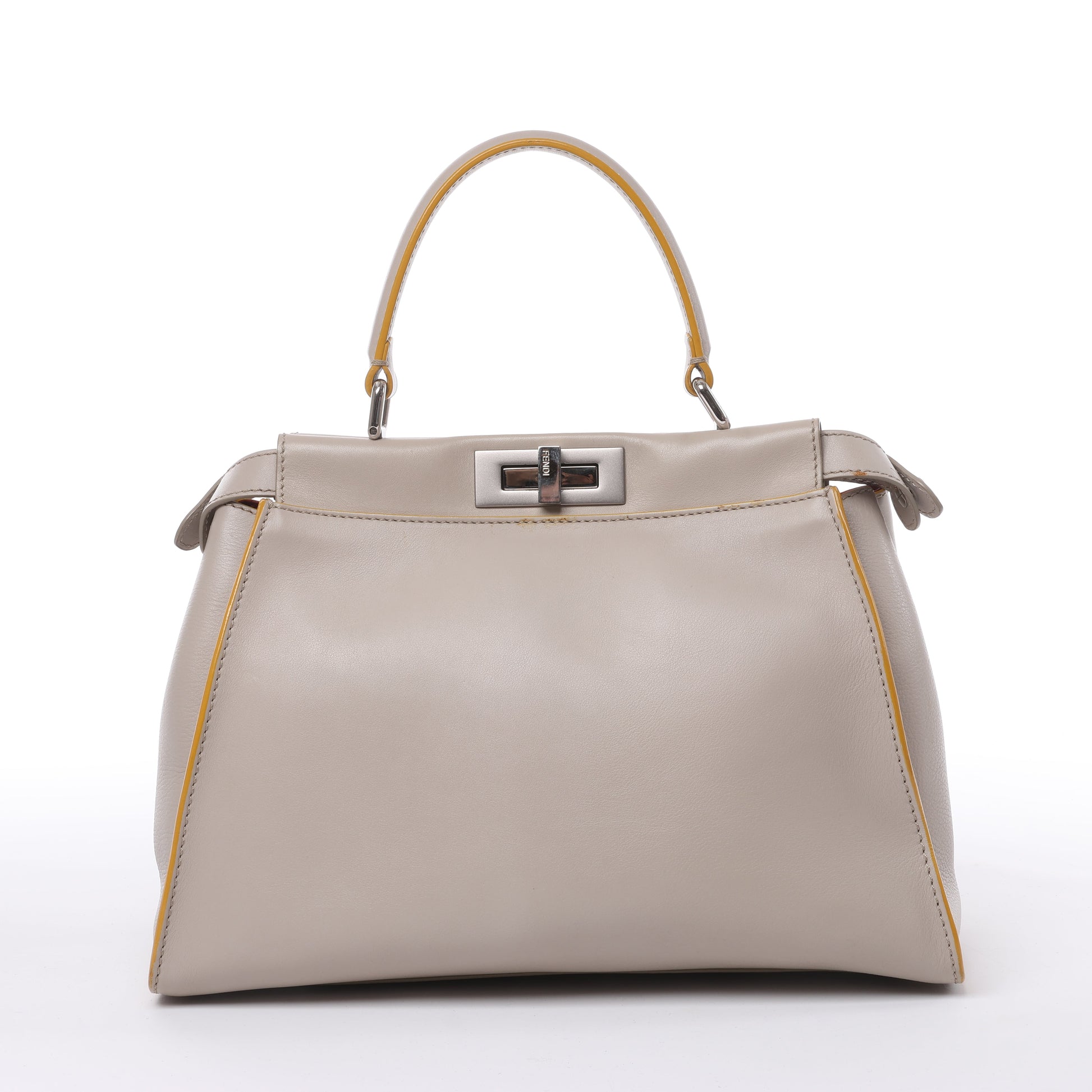 Fendi Peekaboo Regular in smooth grey leather with vibrant yellow piping—an elegant twist on a house icon. Beloved for its discreet luxury and clever construction, it’s a refined companion for elevated daily style.
