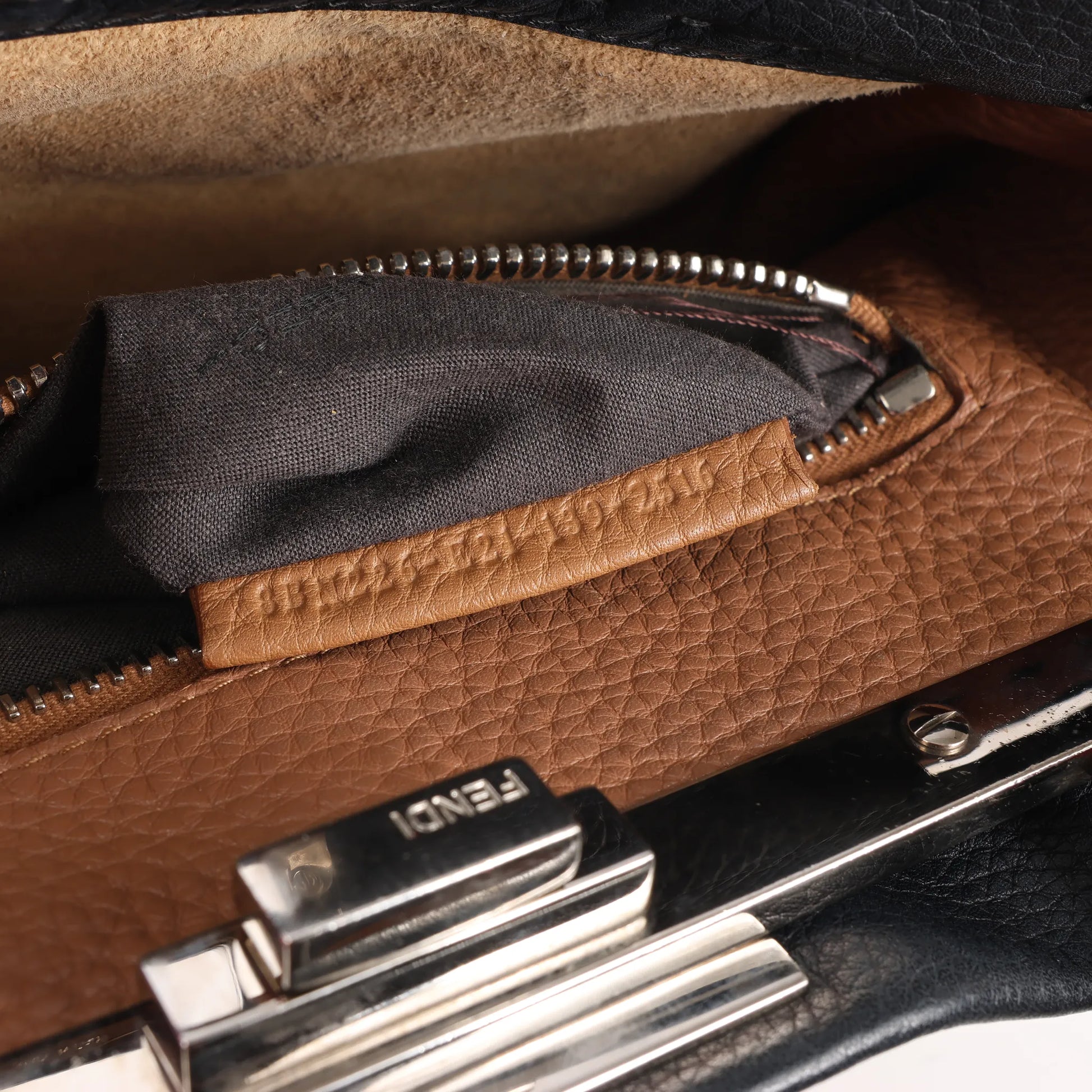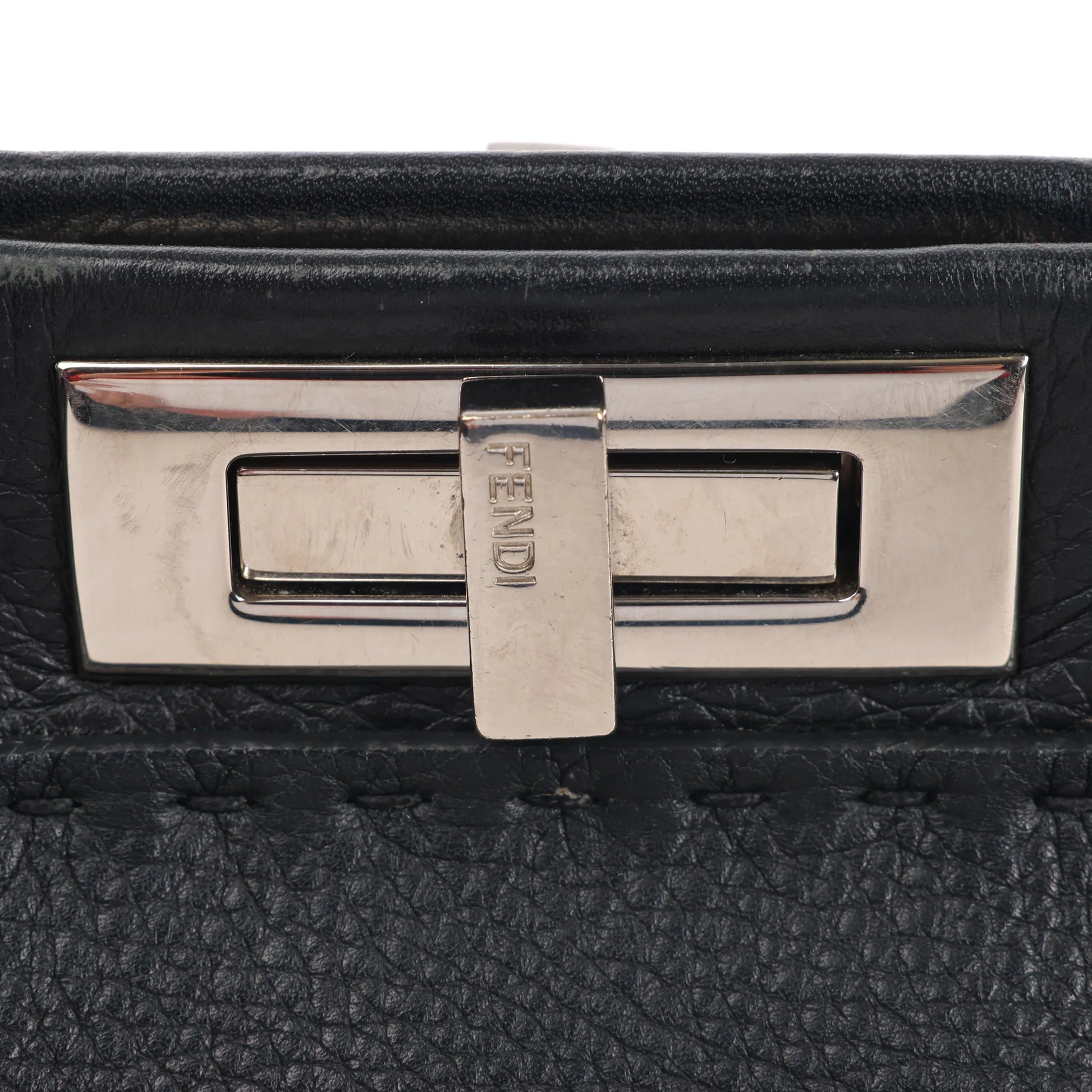 The Fendi Peekaboo Regular Selleria Handbag 8BN226 in black grained leather is a timeless icon—crafted in Italy with signature turn-lock closure and top handle elegance.