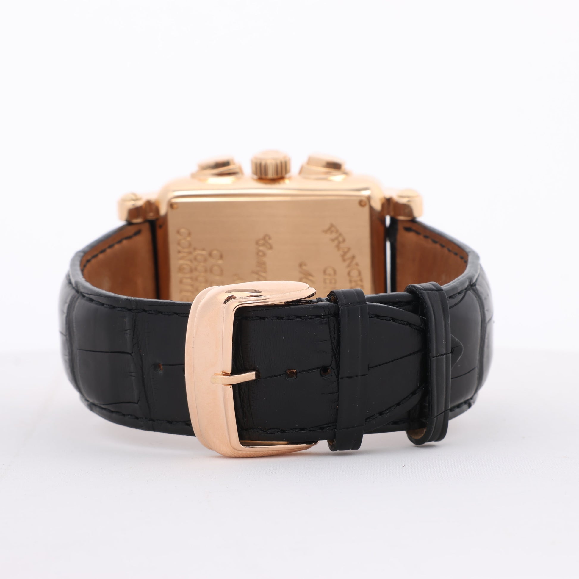 Franck Muller Conquistador Cortez 10000 H CC features a bold square rose gold case, silver dial with oversized numerals, and chronograph function. Paired with a black leather strap, it’s a striking blend of power and elegance.