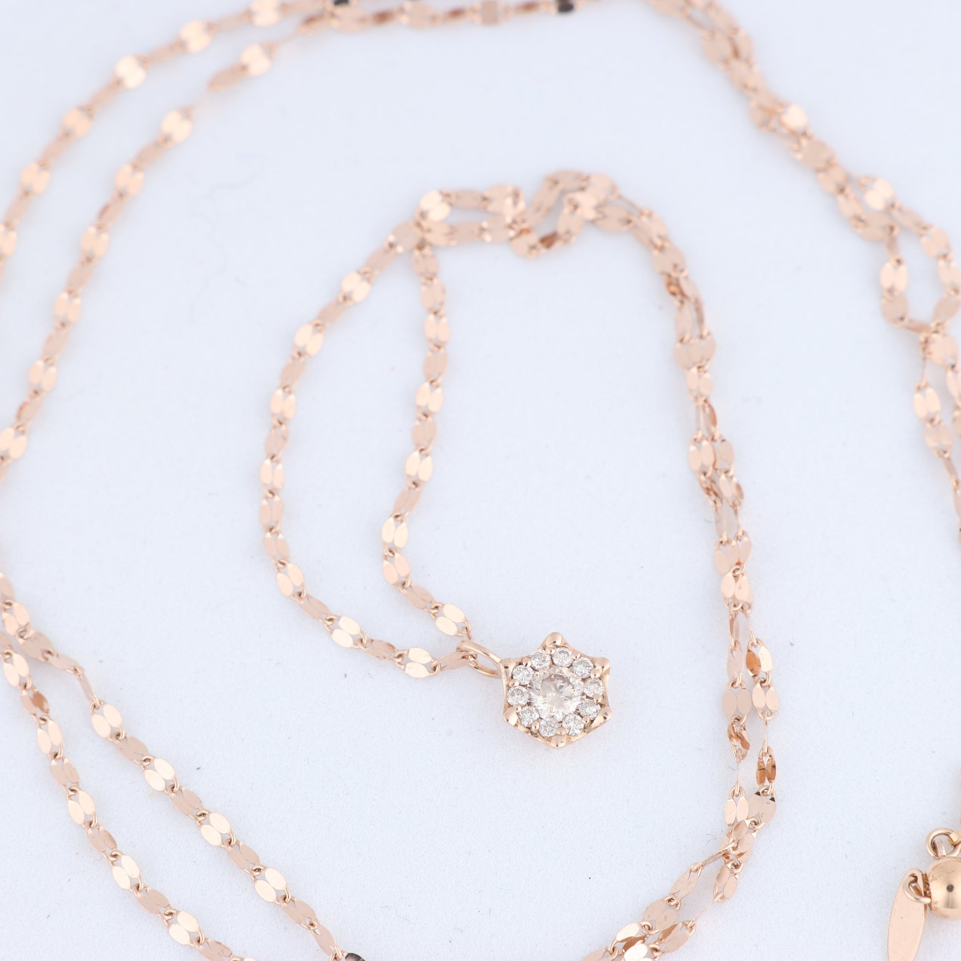 Elegant and timeless, this unsigned 18k rose gold chain features a hexagon pendant set with 11 sparkling natural diamonds. A refined jewelry piece perfect for adding sophistication to any occasion