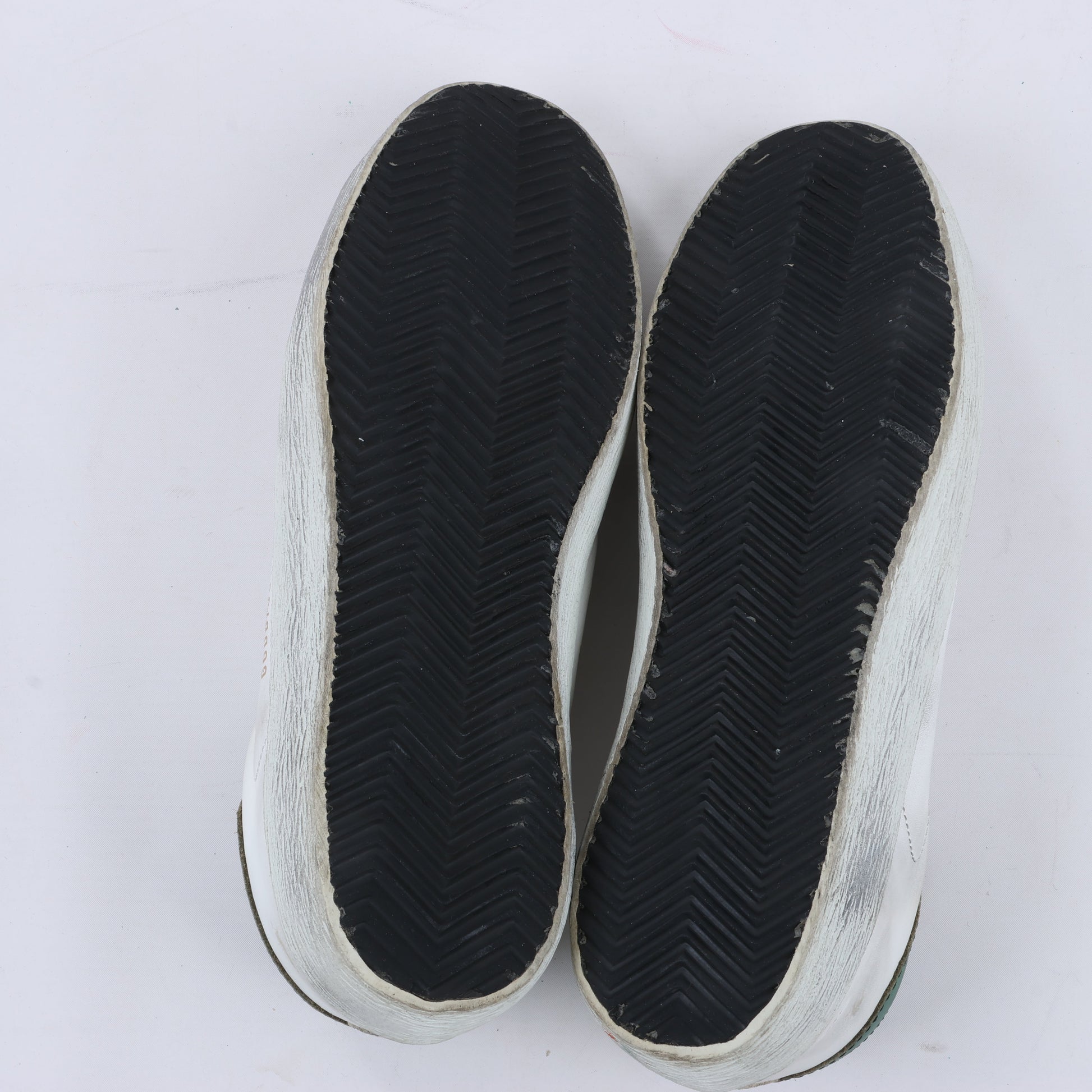 Stylish Golden Goose Superstar sneakers in size 40 EU, crafted in white leather with signature distressed details. Accented by a green heel tab and grey suede toe cap for a casual yet refined look. Perfect for adding a touch of effortless cool to everyday outfits!