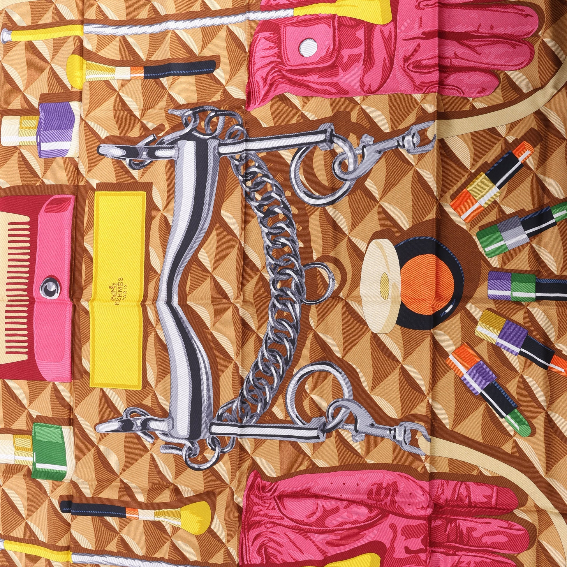 Playful and chic, this Hermès Carré 90 "Beauté Composée" handkerchief in orange silk features a bold composition of makeup, gloves, and equestrian bits—blending fashion and whimsy in a vibrant, graphic design.