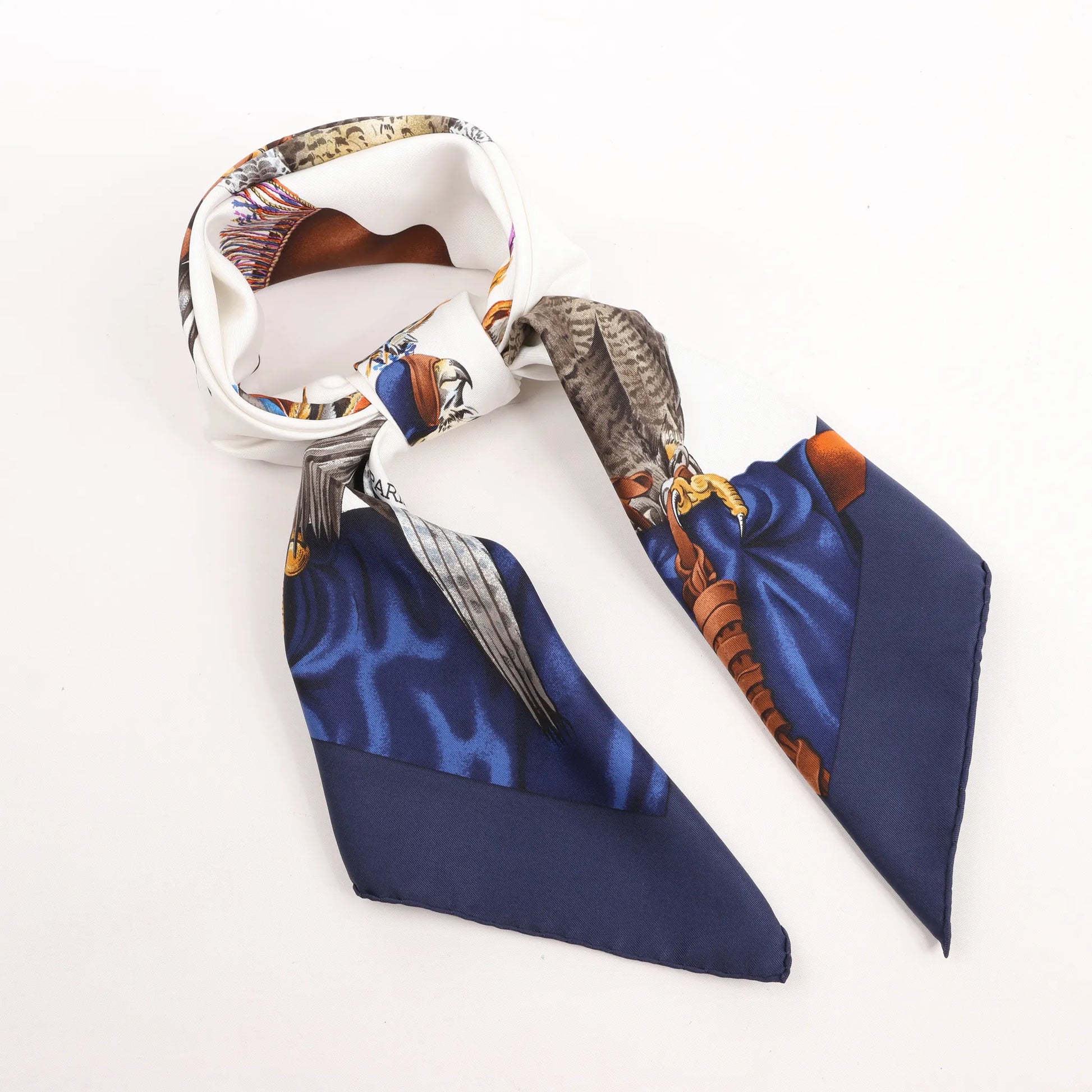 The Hermès Carré 90 "Chasse à Vol" in navy blue is a majestic tribute to the art of falconry. Featuring detailed illustrations of falcons perched on gloved hands and adorned with colorful hoods, this elegant silk scarf blends heritage sport with regal design elements.