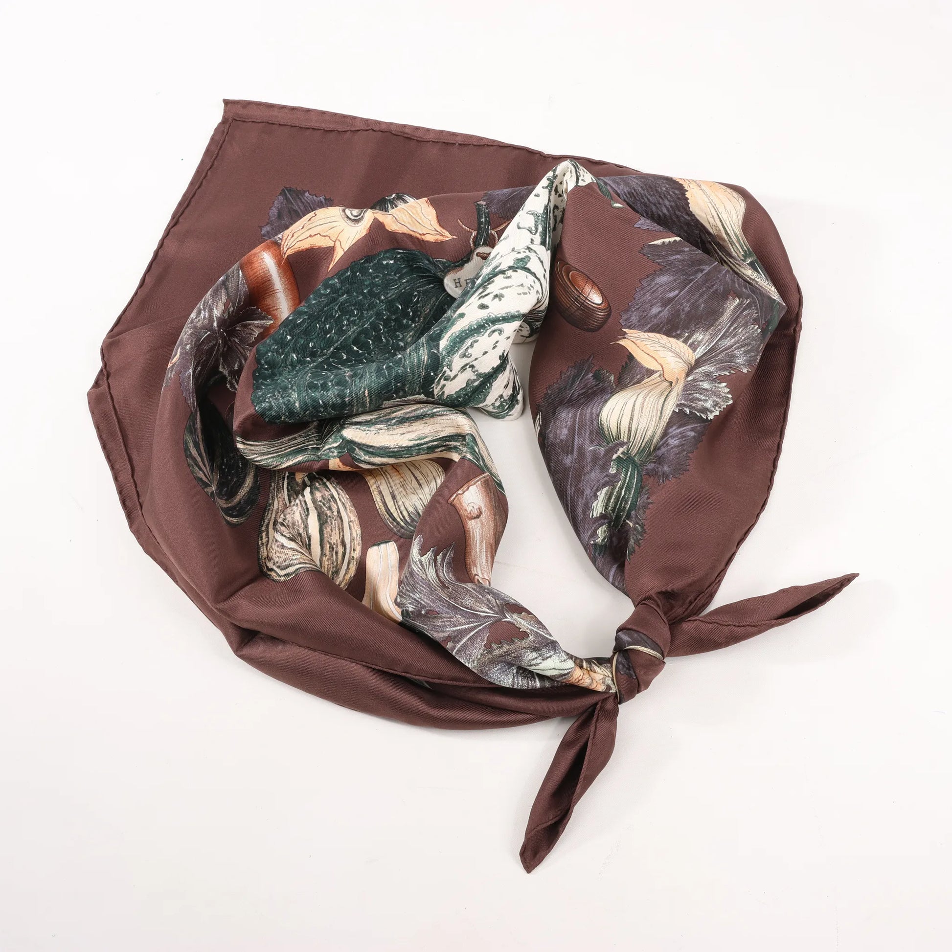 Hermès Carré 90 "Citrouilles & Coloquintes" scarf in rich brown silk showcases a detailed botanical design of gourds and foliage. A whimsical, earthy classic with artistic flair.