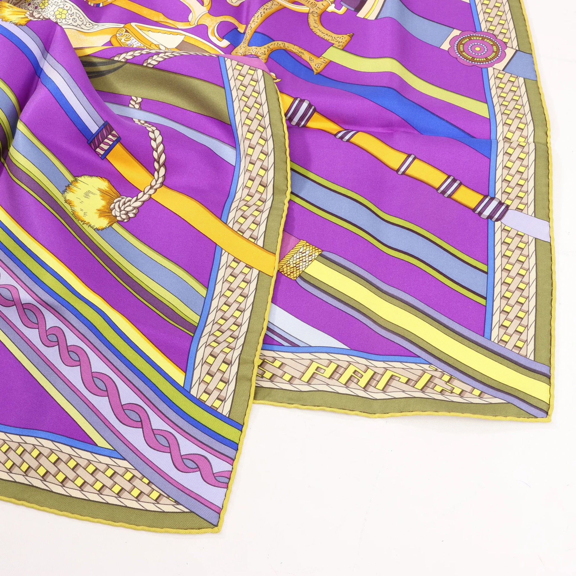 Hermès Carré 90 "Concours d'Étriers Etelier" in rich purple silk features a detailed equestrian motif in gold tones. Luxurious, collectible, and iconic French craftsmanship.