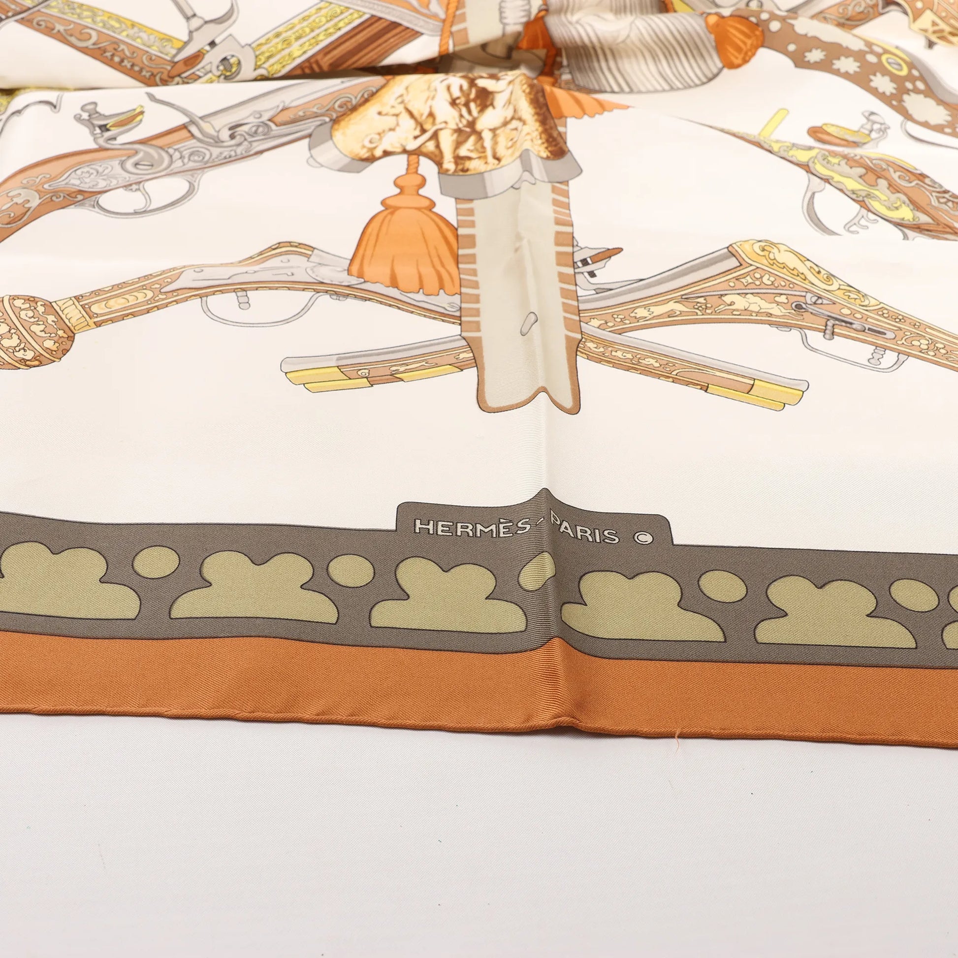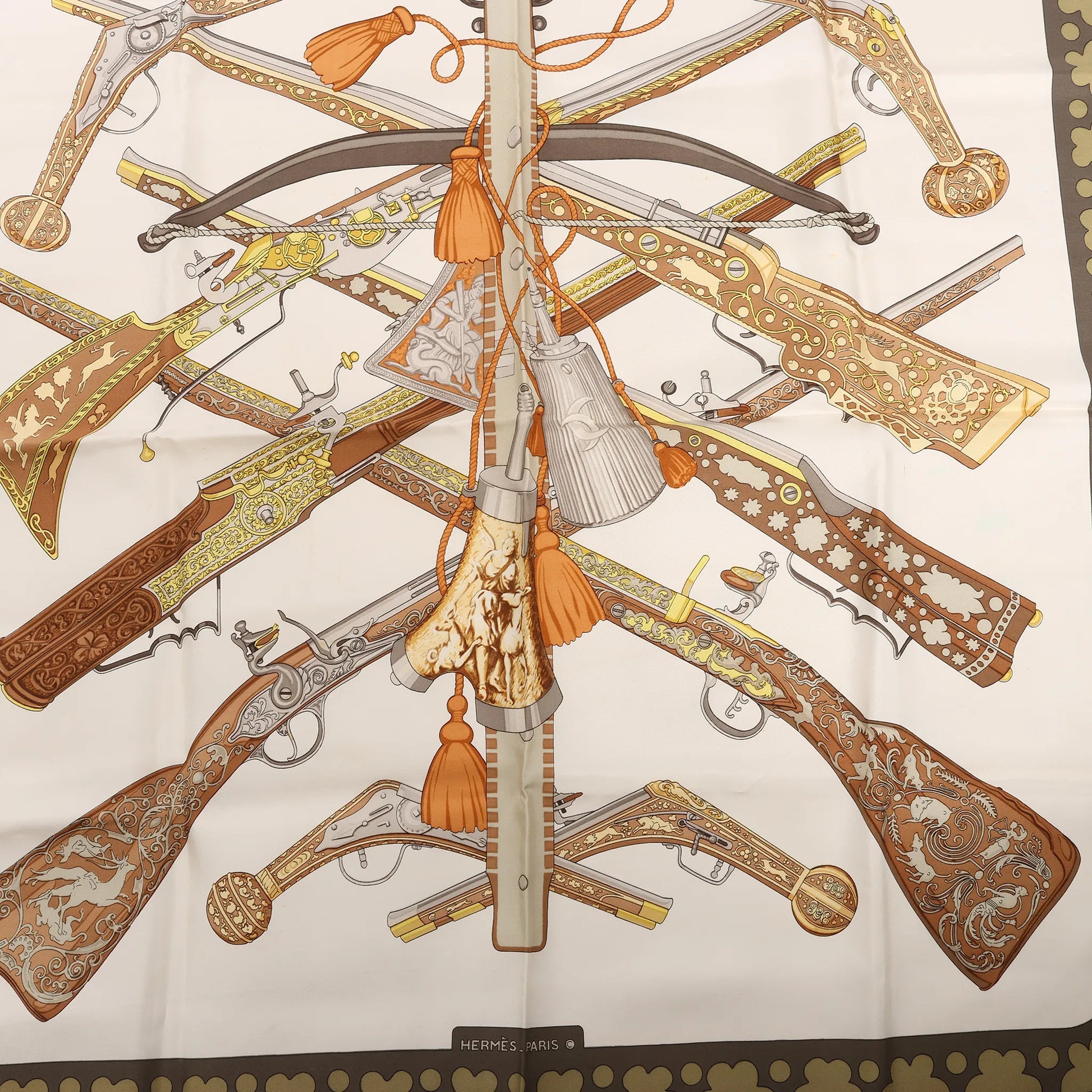 The Hermès Carré 90 "Diane Gunshot" silk handkerchief in brown showcases an elegant array of intricately designed vintage firearms. Made from 100% silk, this bold and artistic accessory makes a statement with its historical charm and luxurious feel.