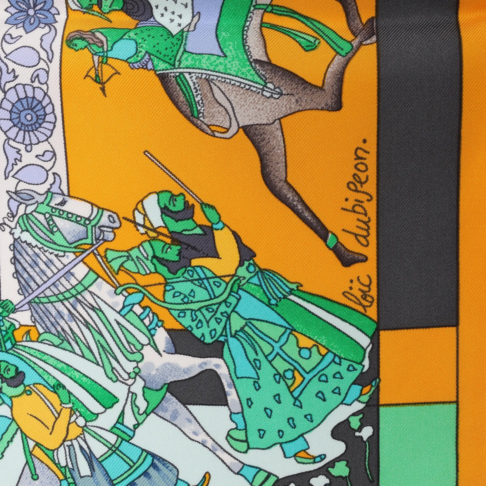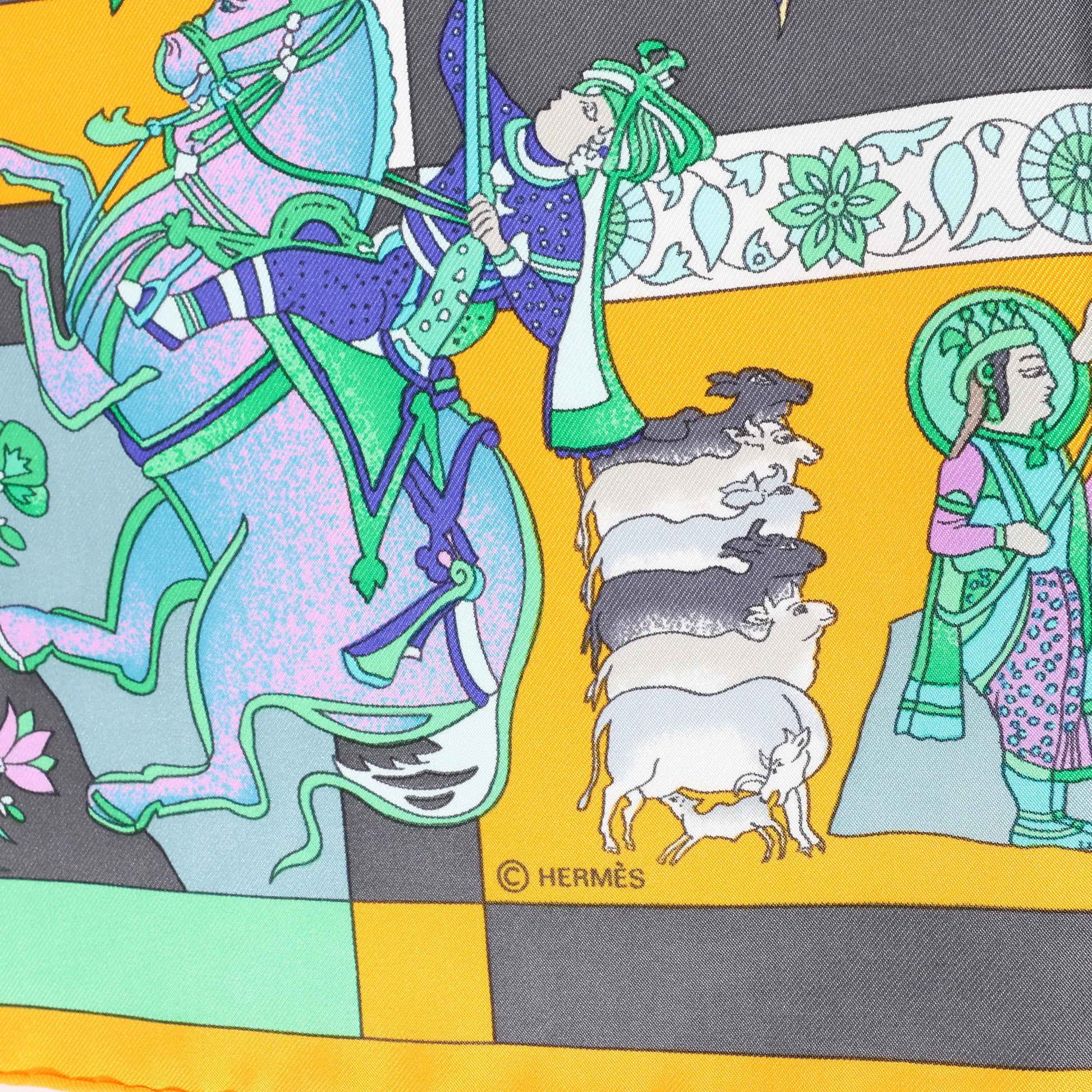 Celebrate vibrant artistry with the Hermès Carré 90 "Fantaisies Indiennes" silk scarf in navy blue and yellow. Adorned with intricate floral and Indian-inspired motifs, this luxurious accessory showcases Hermès’ exquisite craftsmanship and cultural flair.