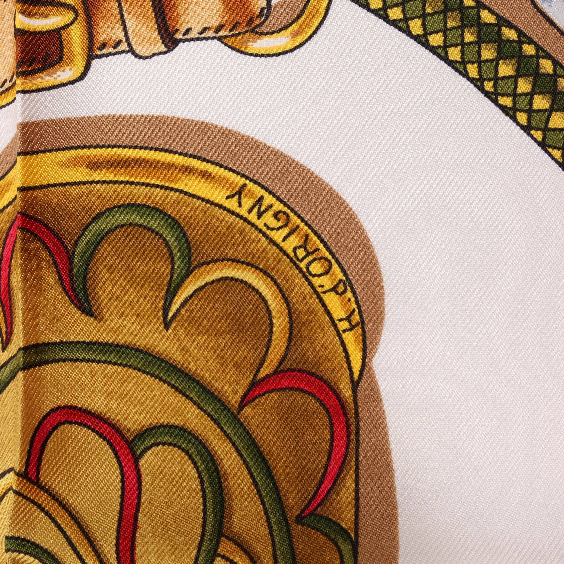 The Hermès Carré 90 "Festival des Amazones" in red celebrates the elegance of equestrian tradition with ornate saddles, bridles, and decorative tack. Set against a vibrant red border, this silk scarf features intricate floral and baroque patterns in bold colors, paying homage to the spirit of horsewomen.