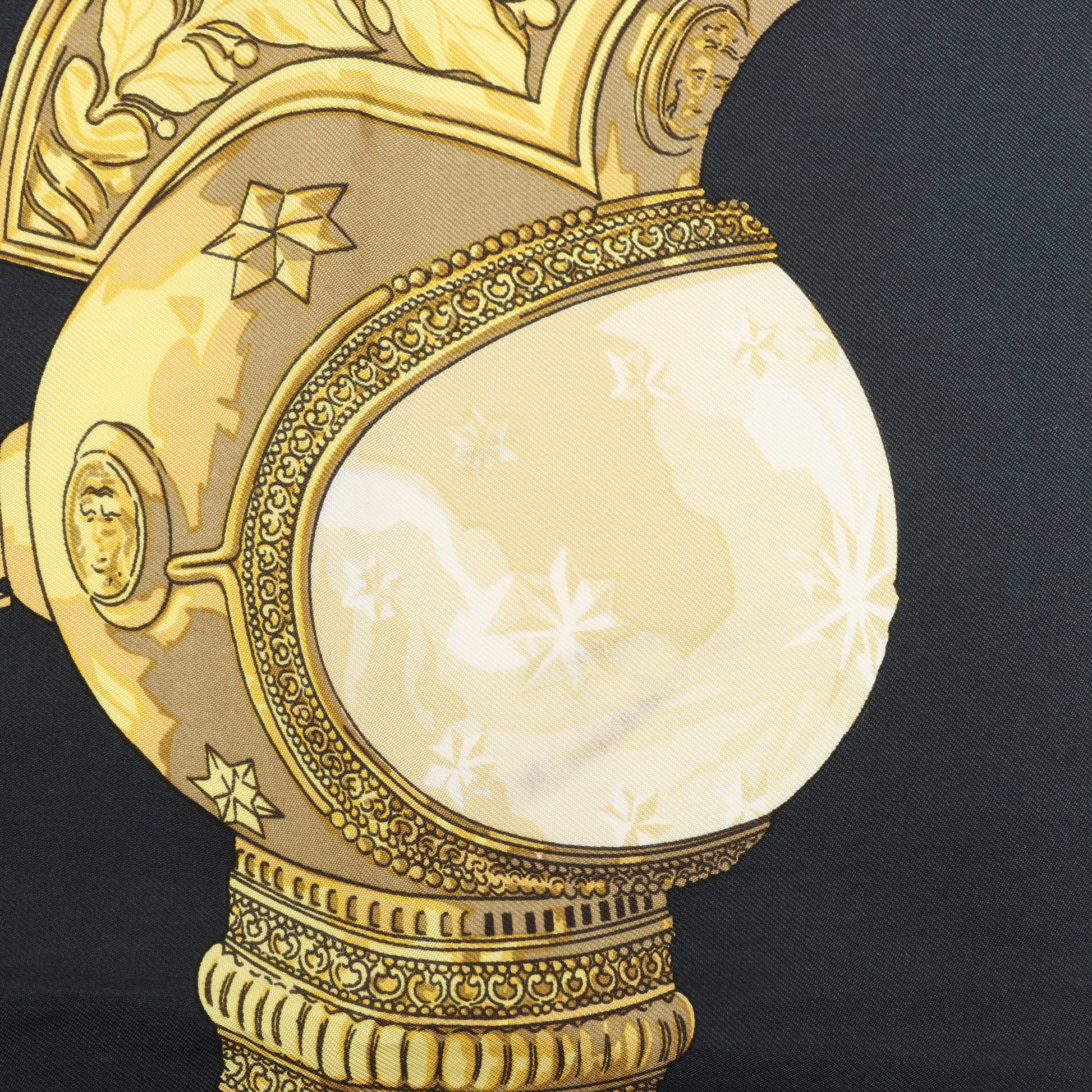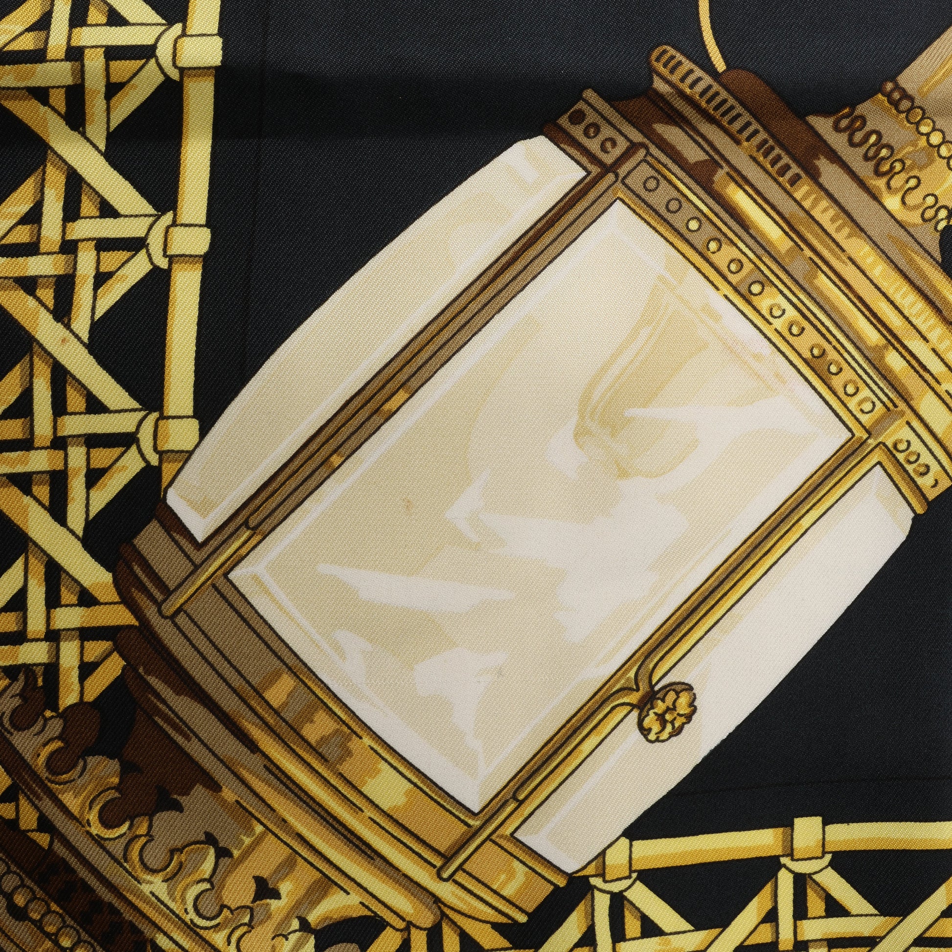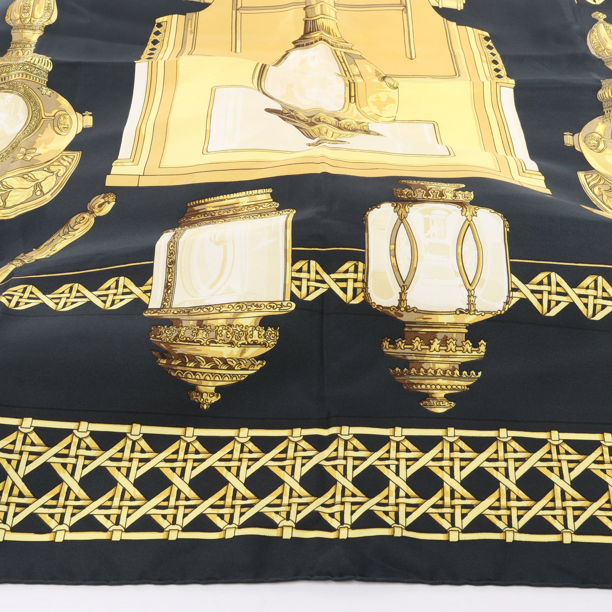 Hermès Carré 90 "Feux de Route" scarf in black and gold silk features ornate carriage lanterns in a symmetrical, luminous design. A bold, elegant statement piece that channels vintage luxury and timeless Parisian flair.