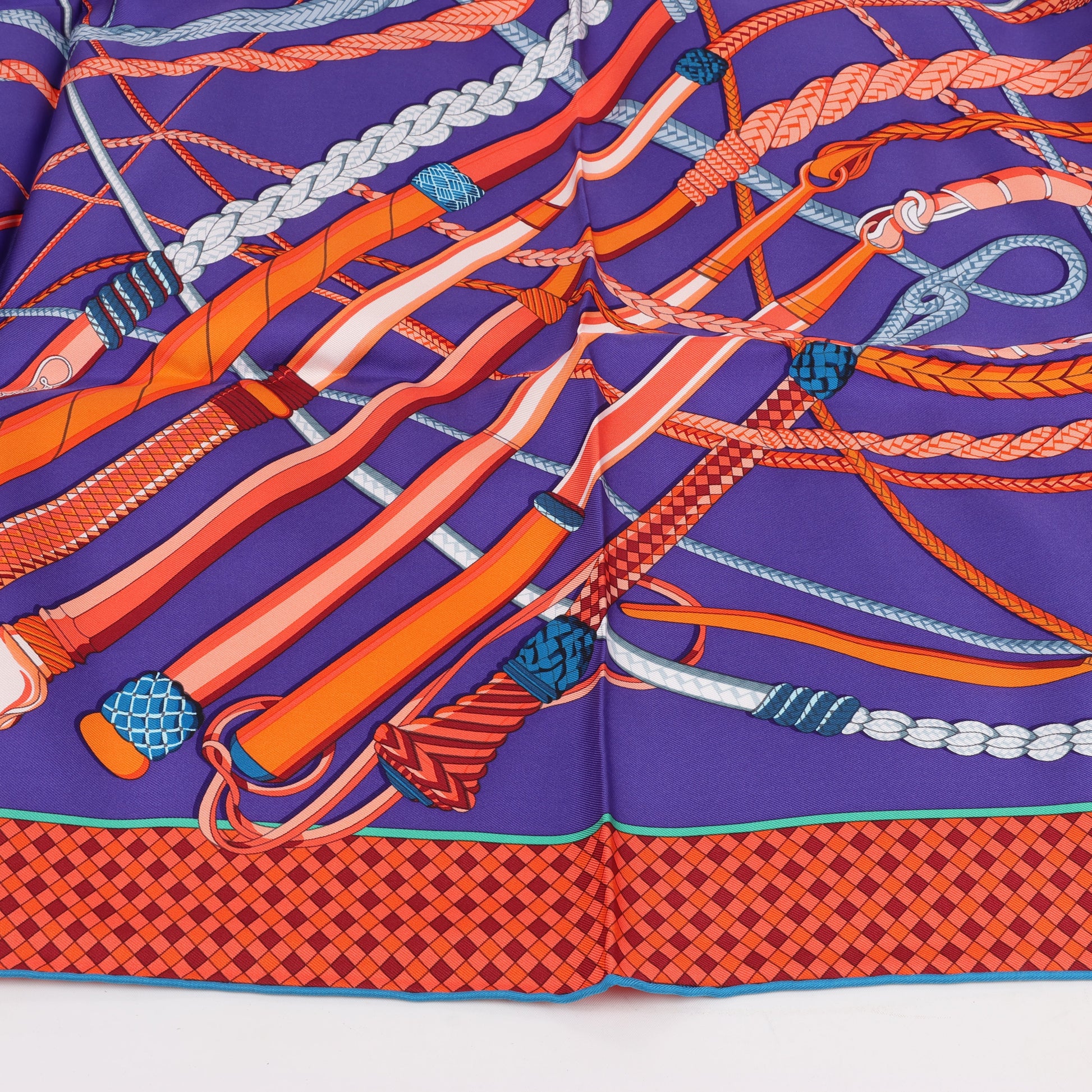 The Hermès Carré 90 "Fouets et Badines" scarf in 100% silk is a striking homage to equestrian elegance. Featuring an intricate composition of braided whips and riding crops in vibrant orange and blue against a deep purple background, this design is bold, sophisticated, and timeless.