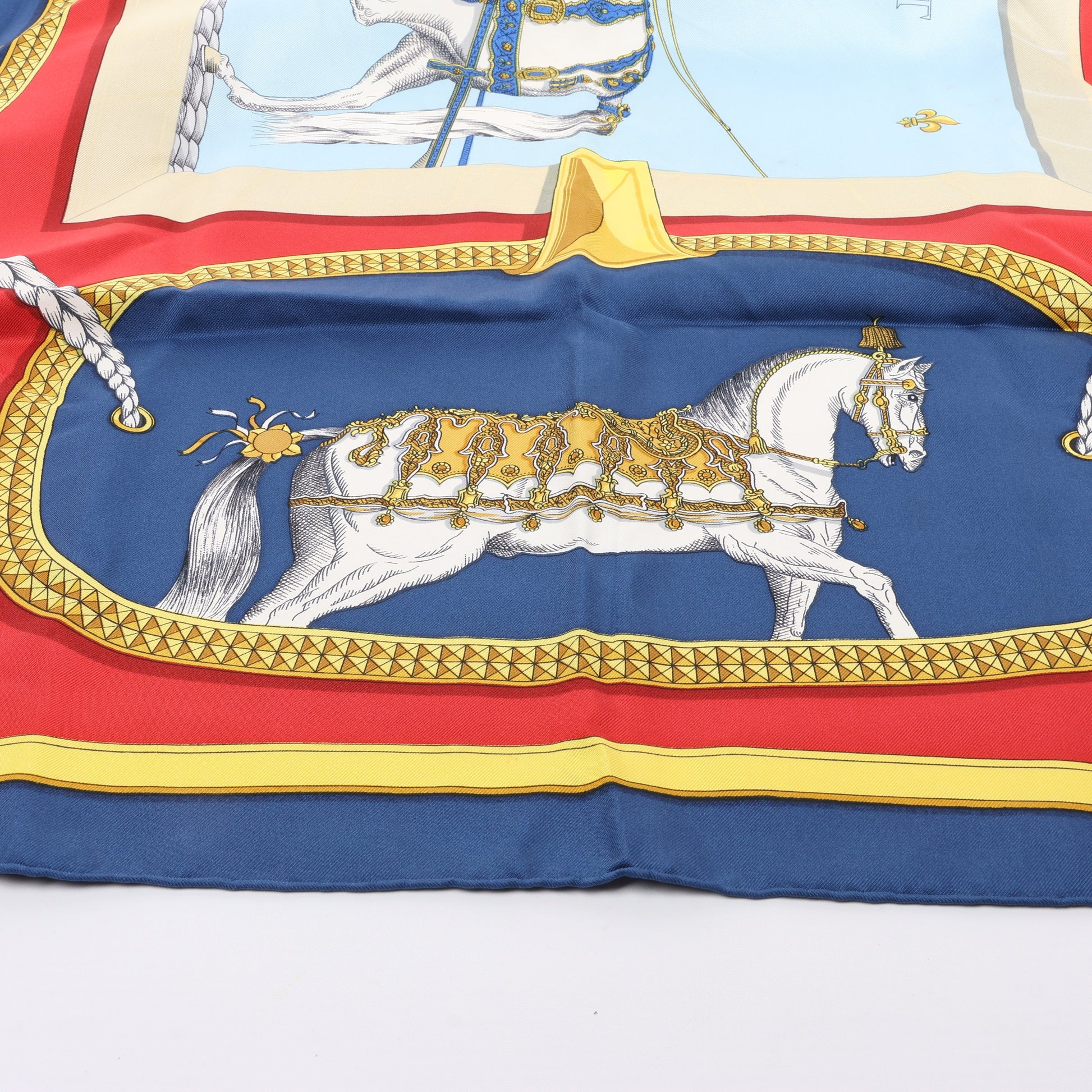 Hermès Carré 90 “Grand Apparat” silk scarf in navy and red features regal horses adorned in golden harnesses. A statement of equestrian elegance, it brings classic sophistication and heritage charm to your collection.