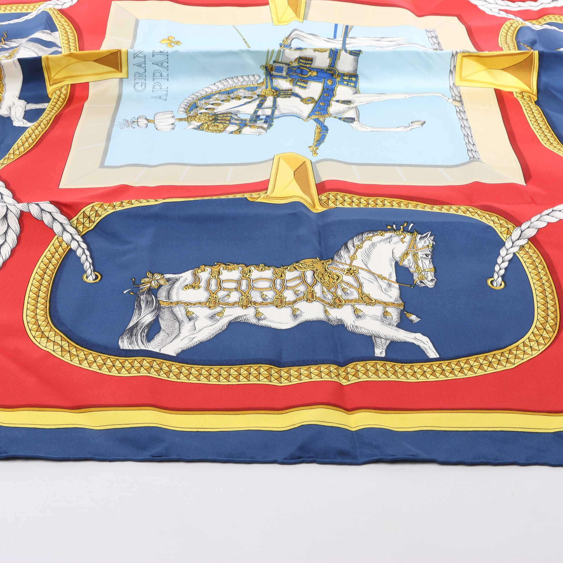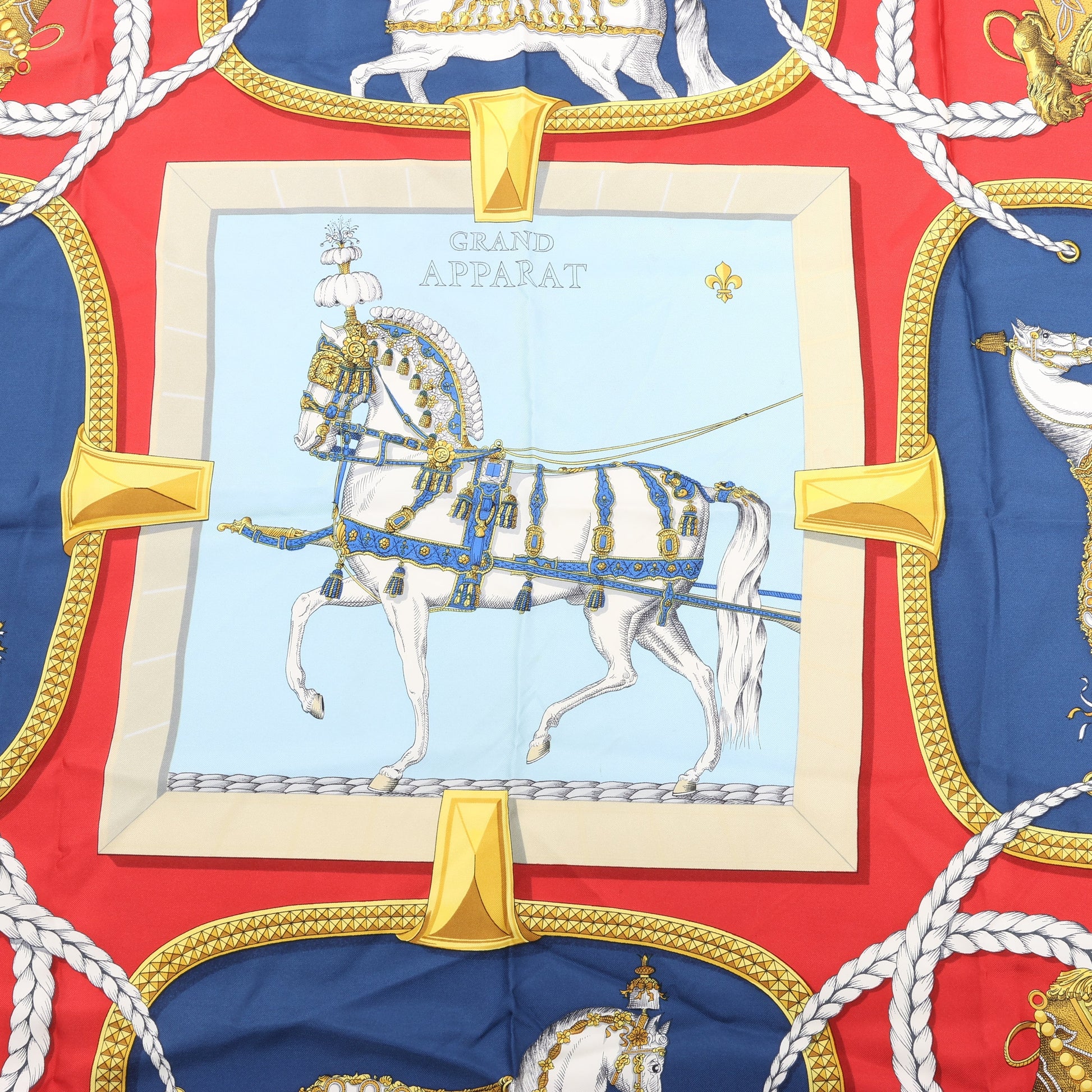 Hermès Carré 90 "GRAND APPARAT" 100% Silk Scarf in Navy x Red
