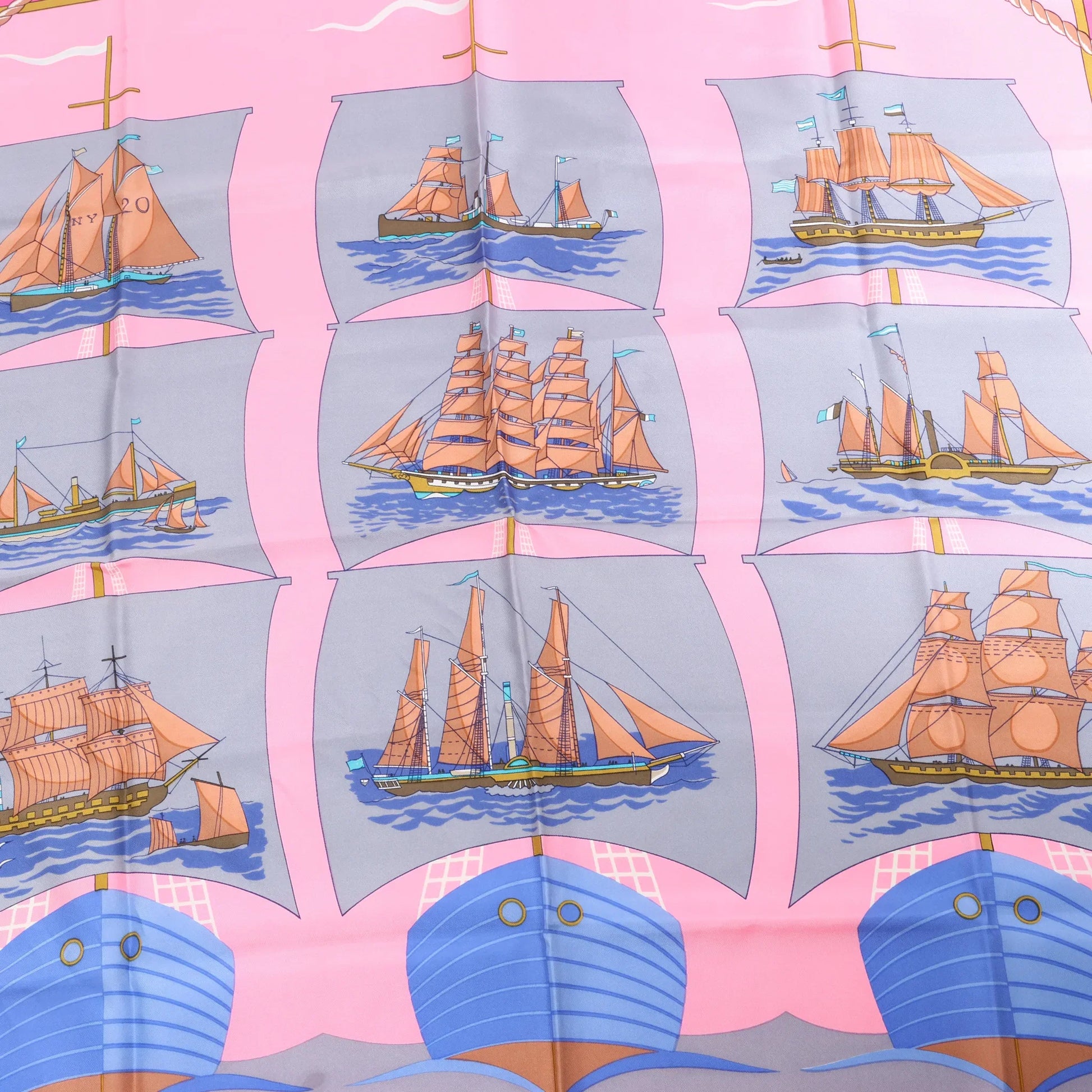 Set sail in style with the Hermès Carré 90 "GRAND LARGUE" silk handkerchief in pink. Crafted from luxurious silk, this nautical-themed scarf features vintage sailing ships and maritime details—perfect for collectors and fashion lovers alike.