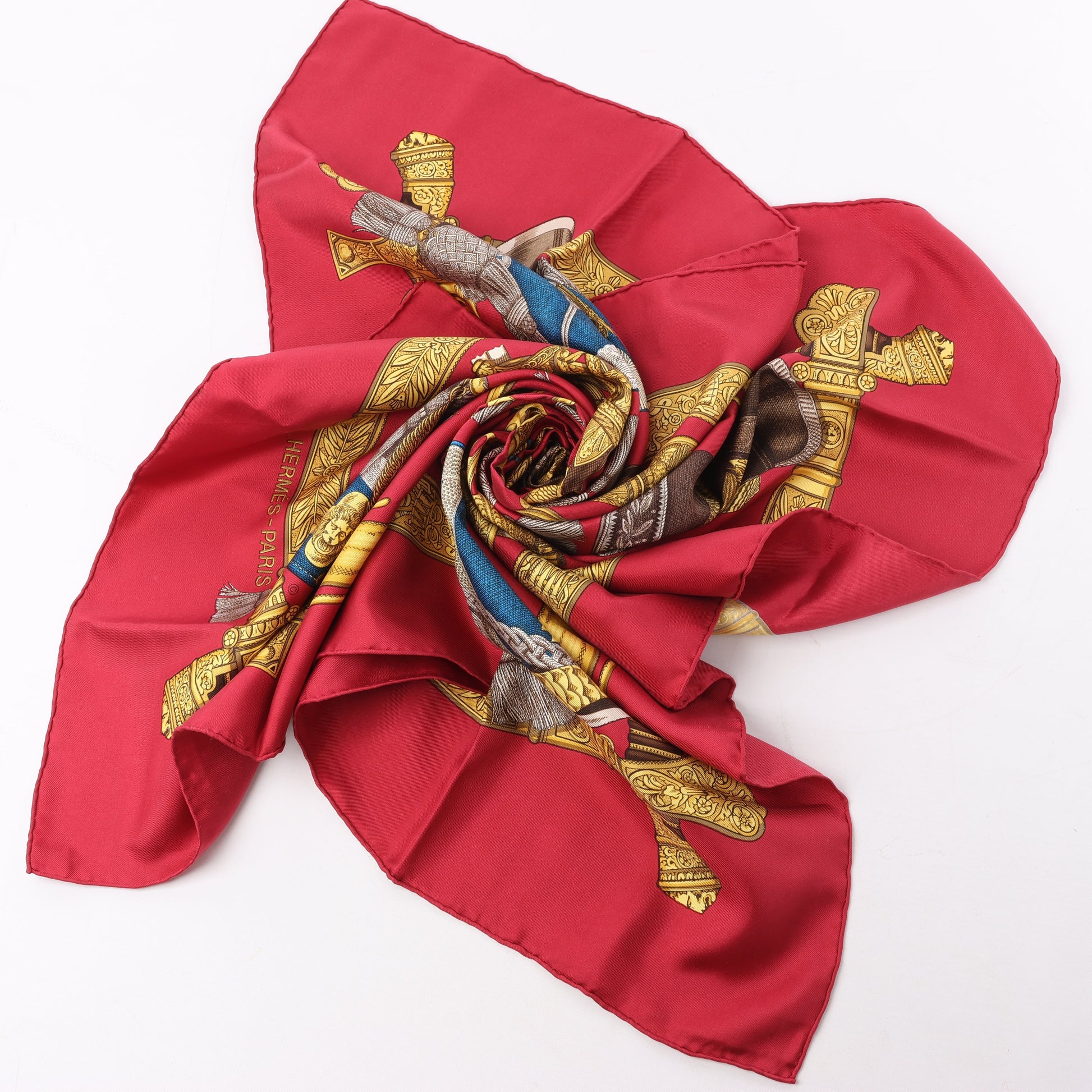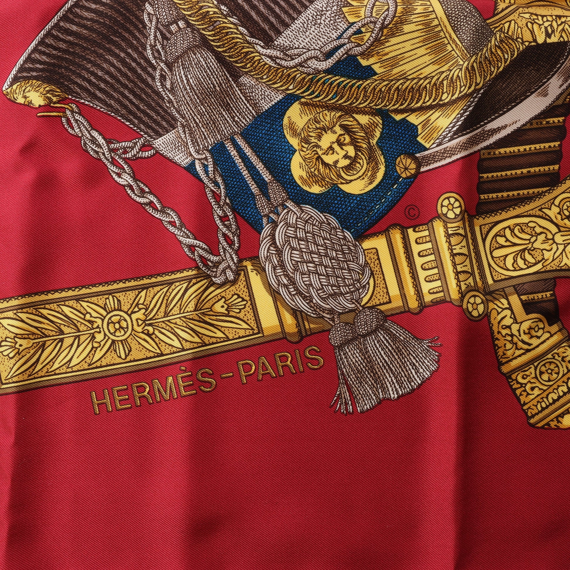 Hermès Carré 90 “Grand Uniforme” silk scarf in rich burgundy, adorned with golden regalia and military motifs. A stately, elegant accessory that blends timeless French heritage with luxurious craftsmanship.