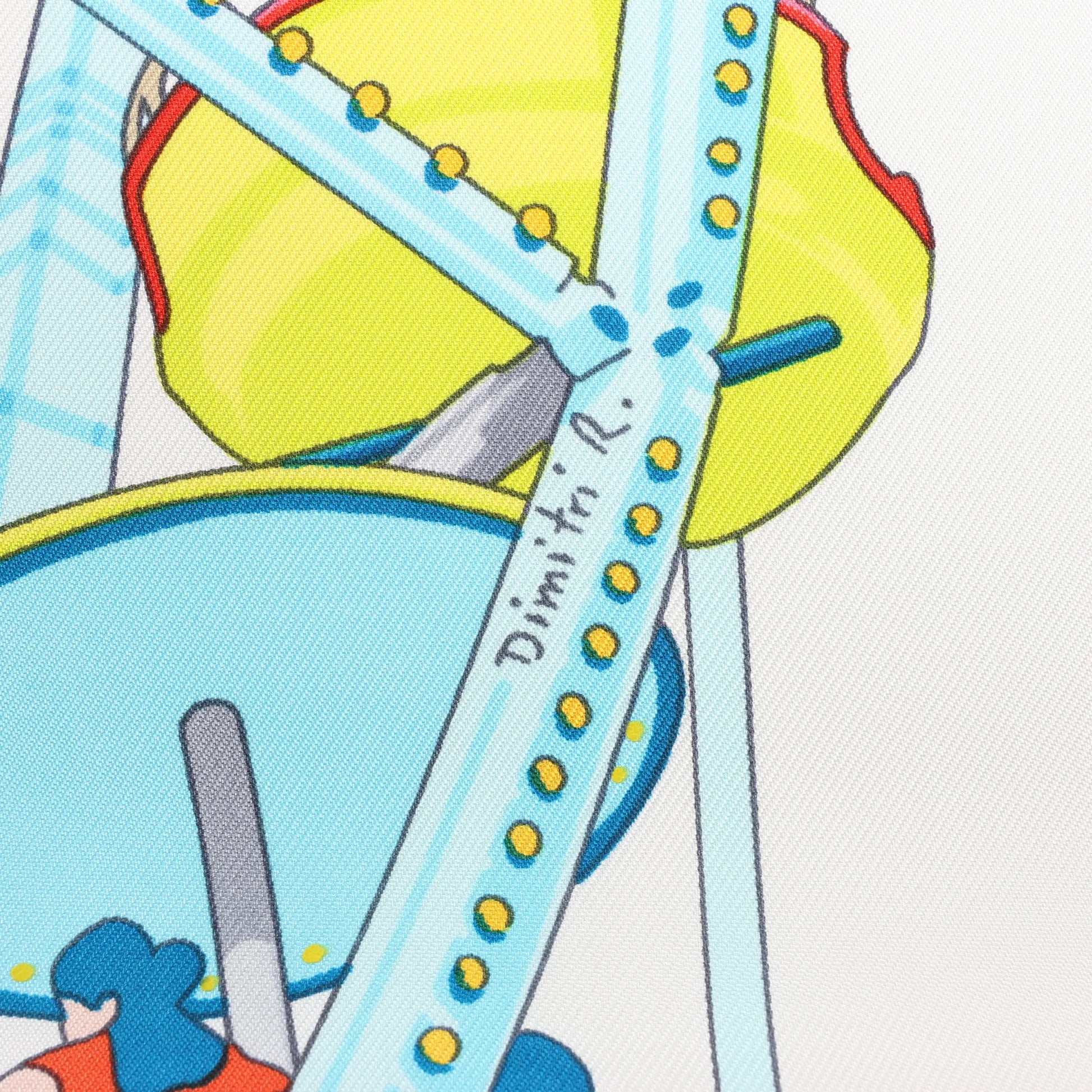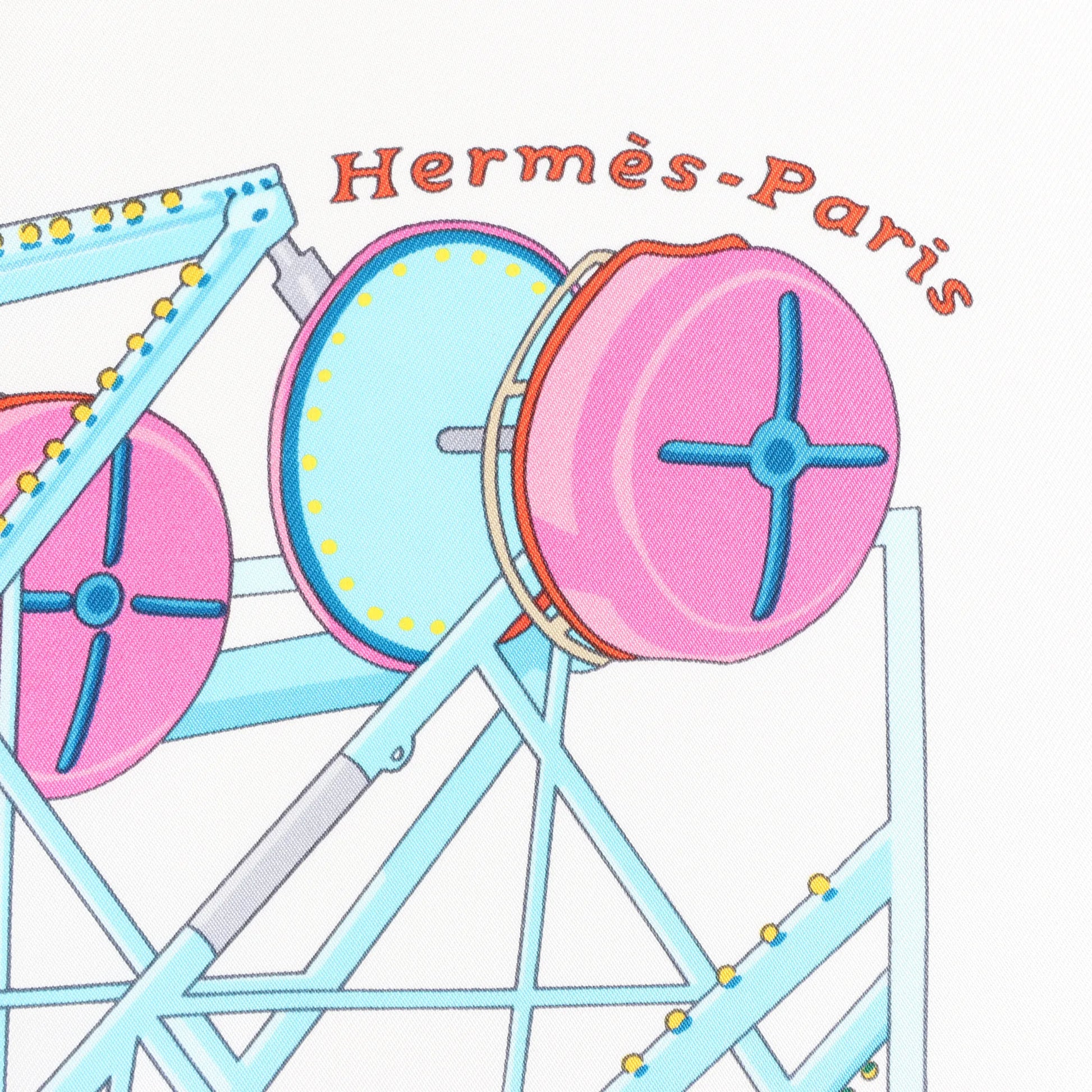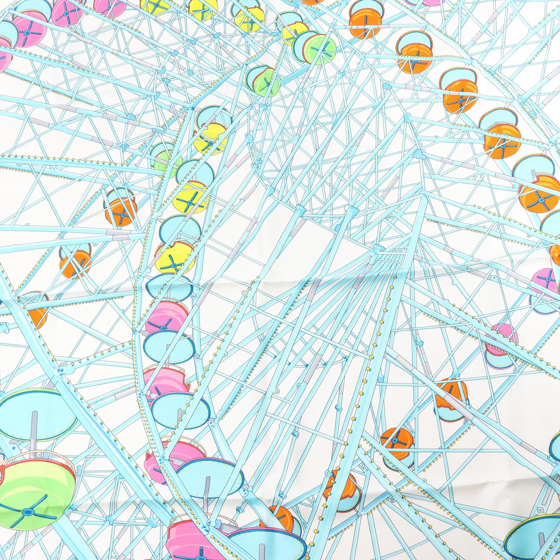 The Hermès Carré 90 "Grande Roue" in white and blue captures the whimsical charm of a Ferris wheel in motion. Crafted from luxurious silk, this vibrant scarf features pastel-colored gondolas and intricate structural details—perfect for playful, modern styling.
