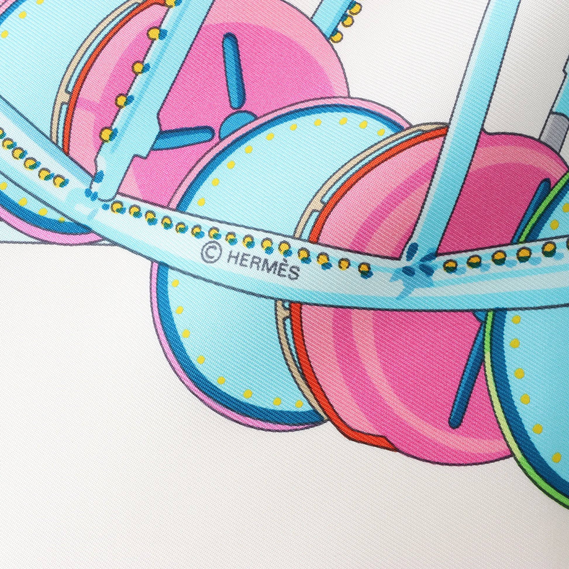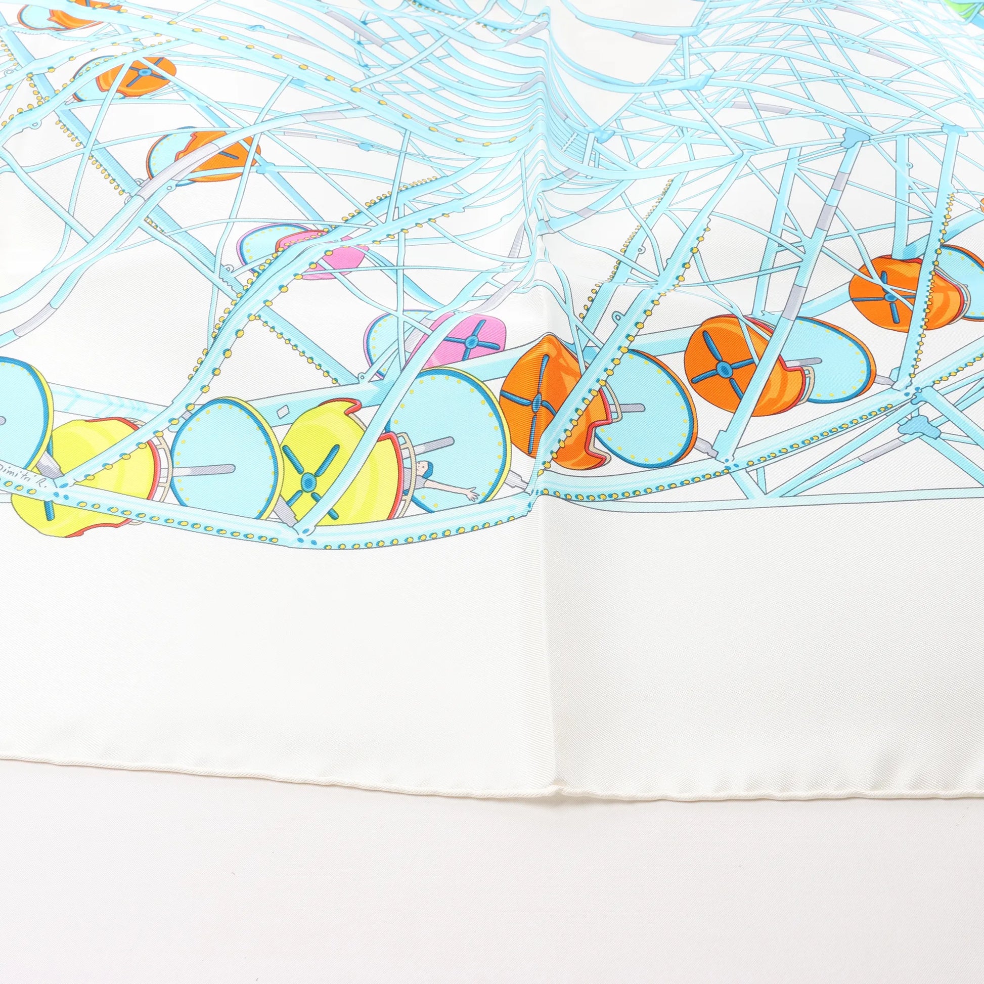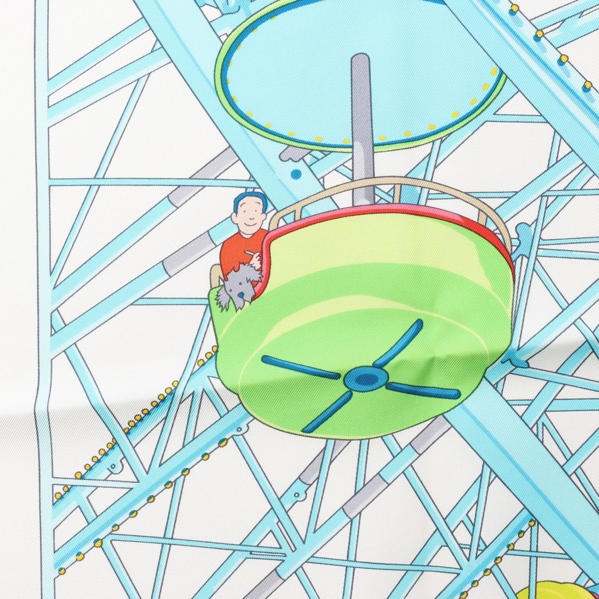 The Hermès Carré 90 "Grande Roue" in white and blue captures the whimsical charm of a Ferris wheel in motion. Crafted from luxurious silk, this vibrant scarf features pastel-colored gondolas and intricate structural details—perfect for playful, modern styling.
