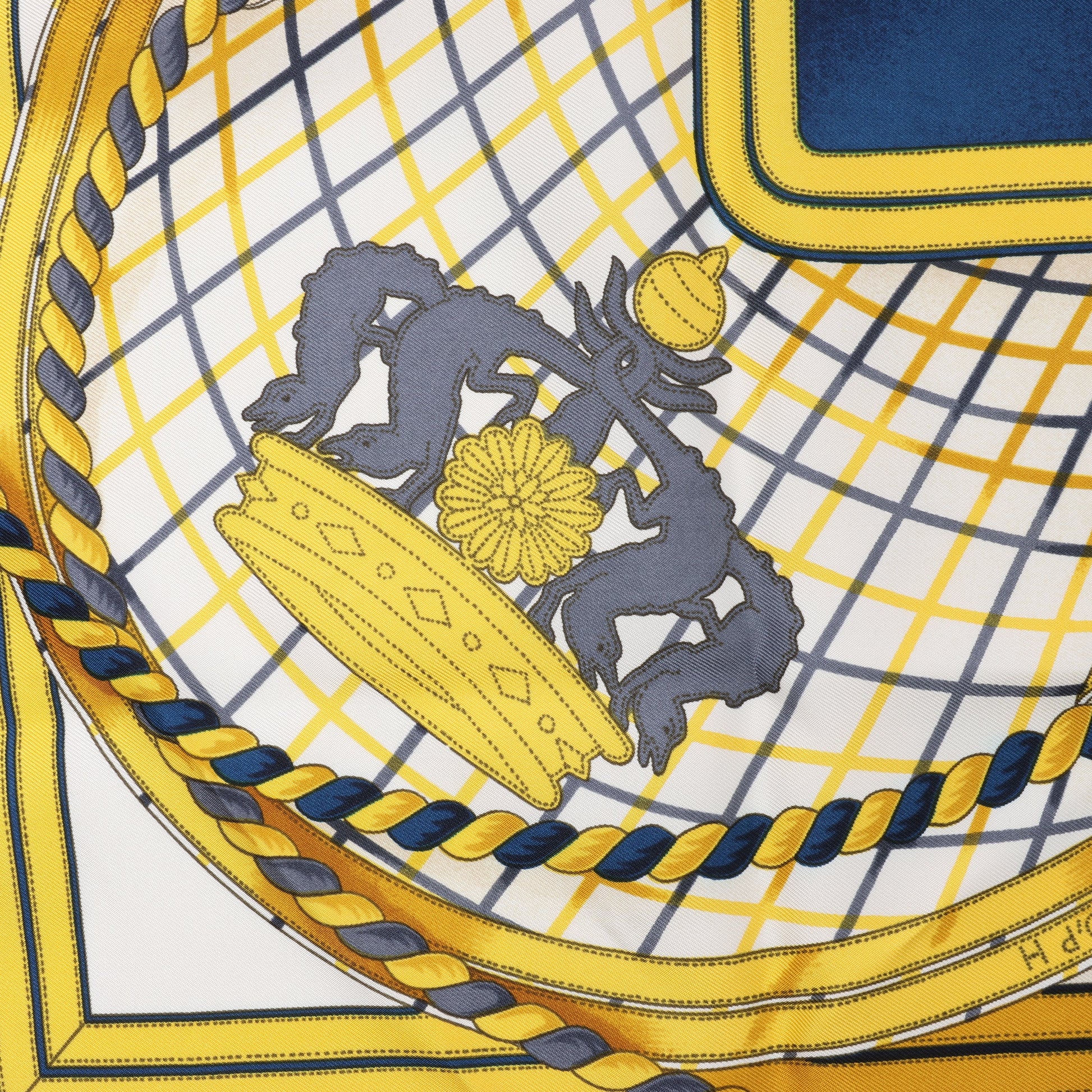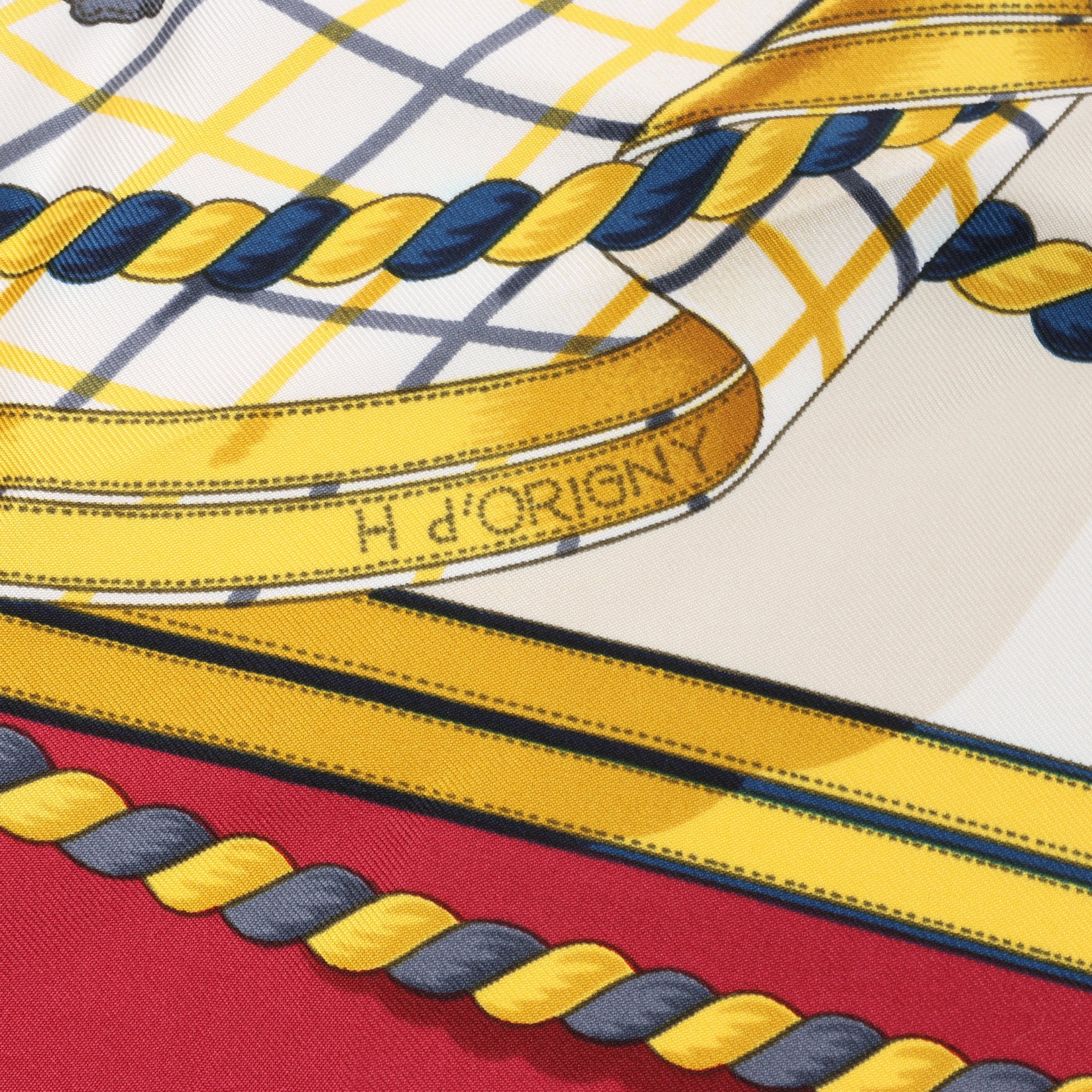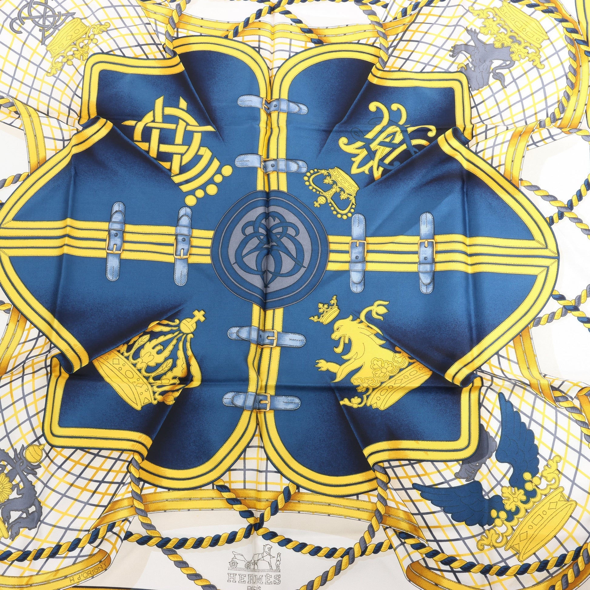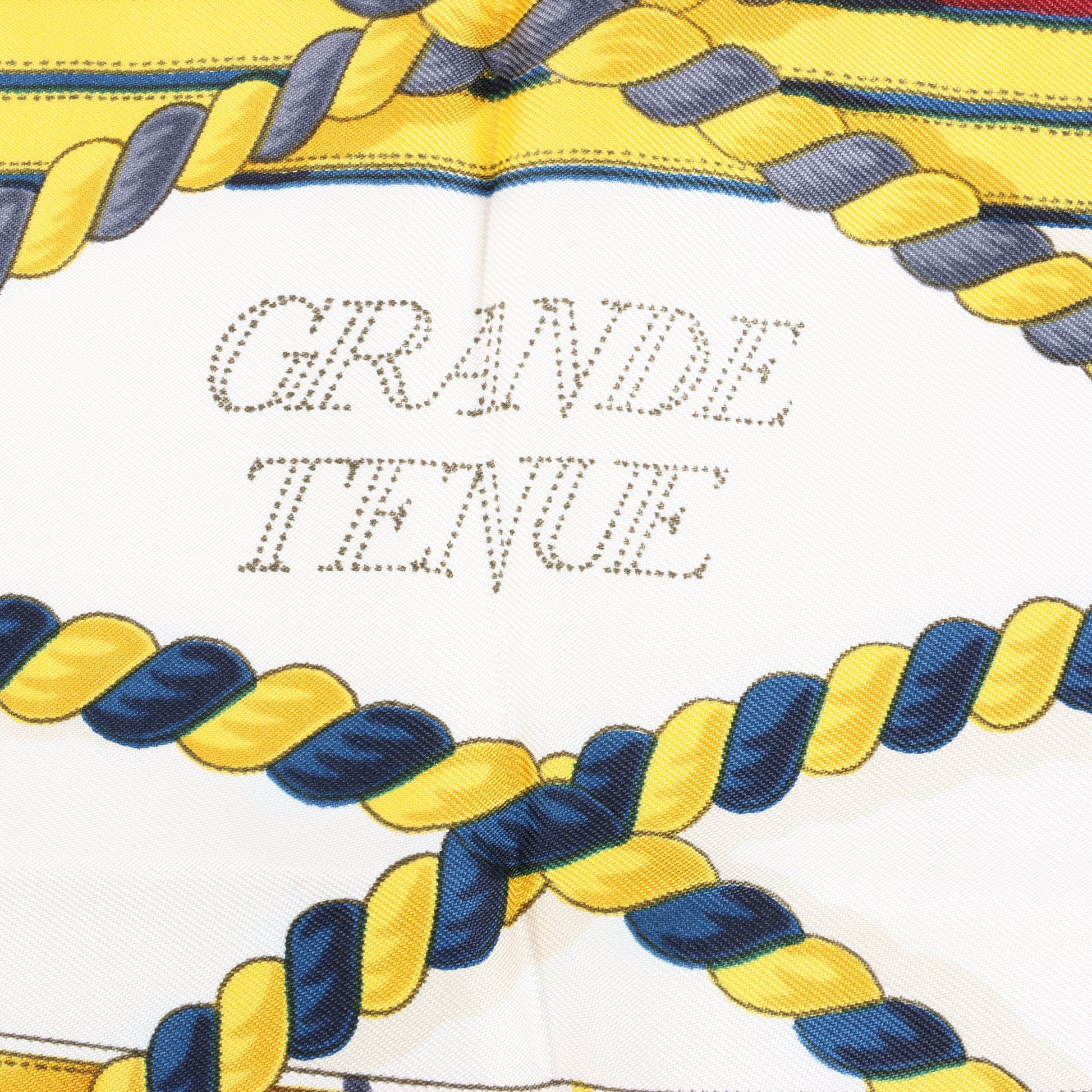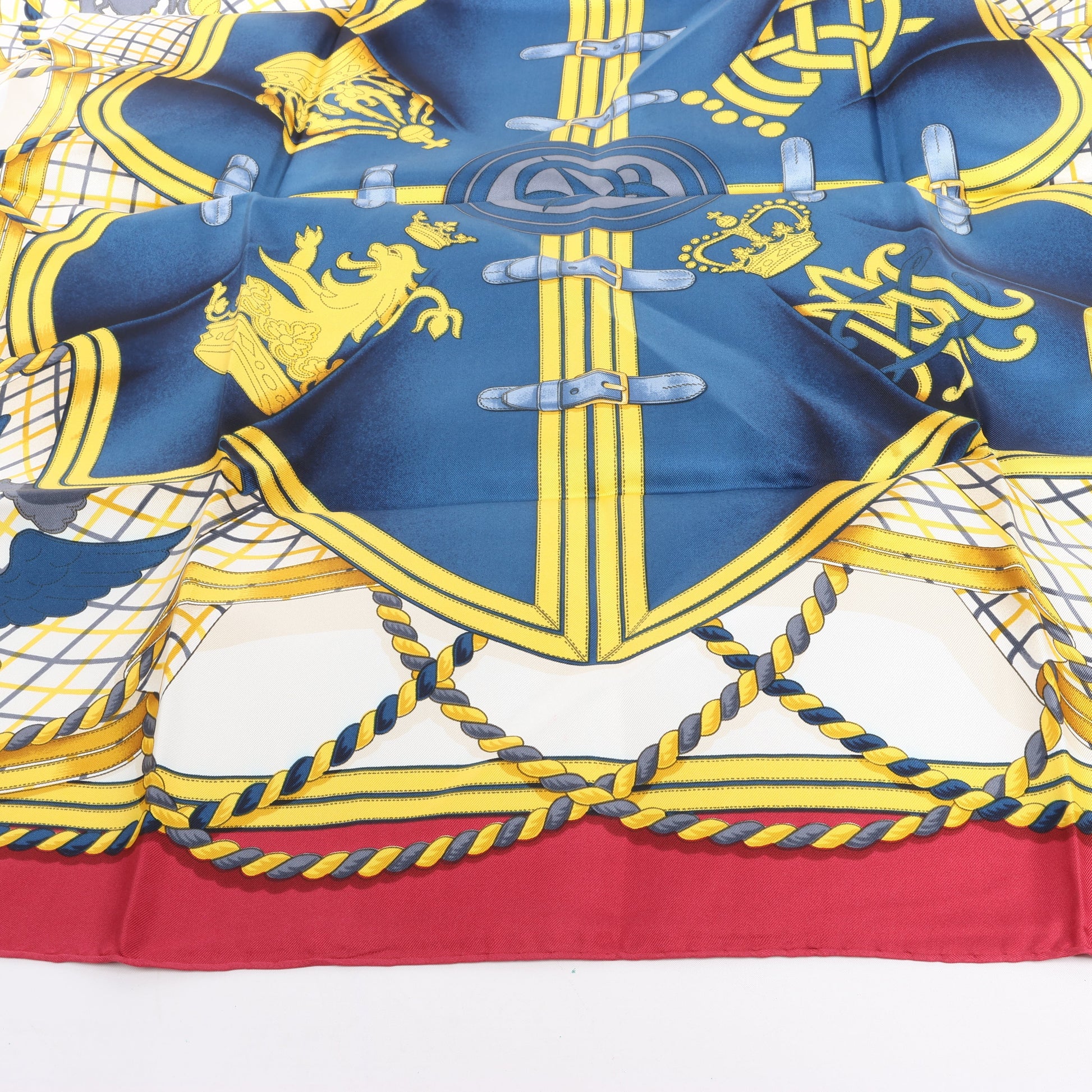 Regal and bold, this Hermès Carré 90 "Grande Tenue" silk handkerchief in burgundy features ornate crests, crowns, and braided detailing in rich gold and navy—an elegant nod to ceremonial equestrian attire.