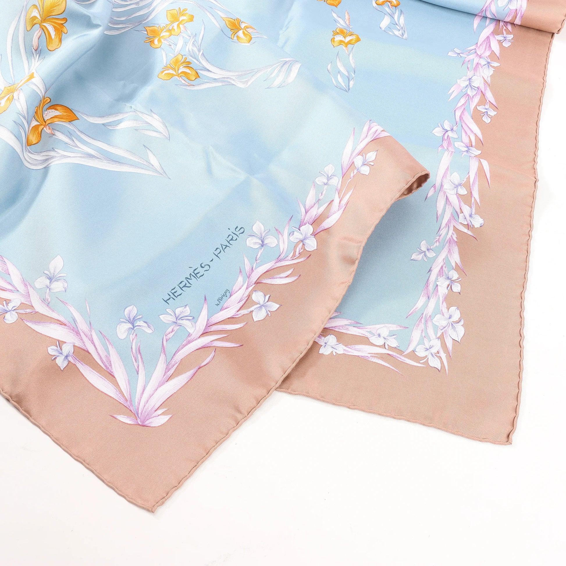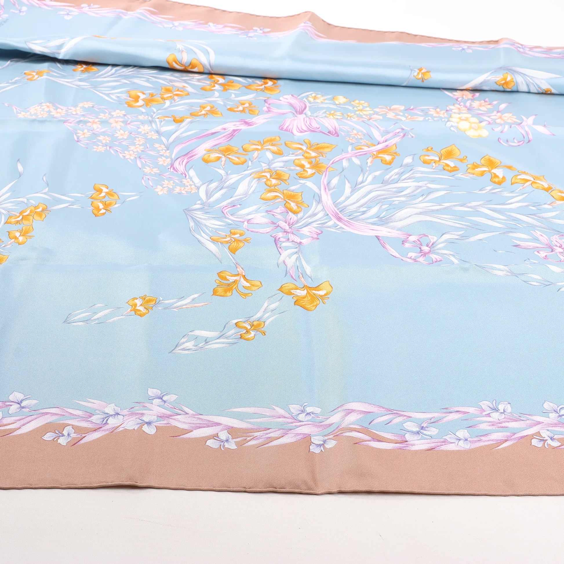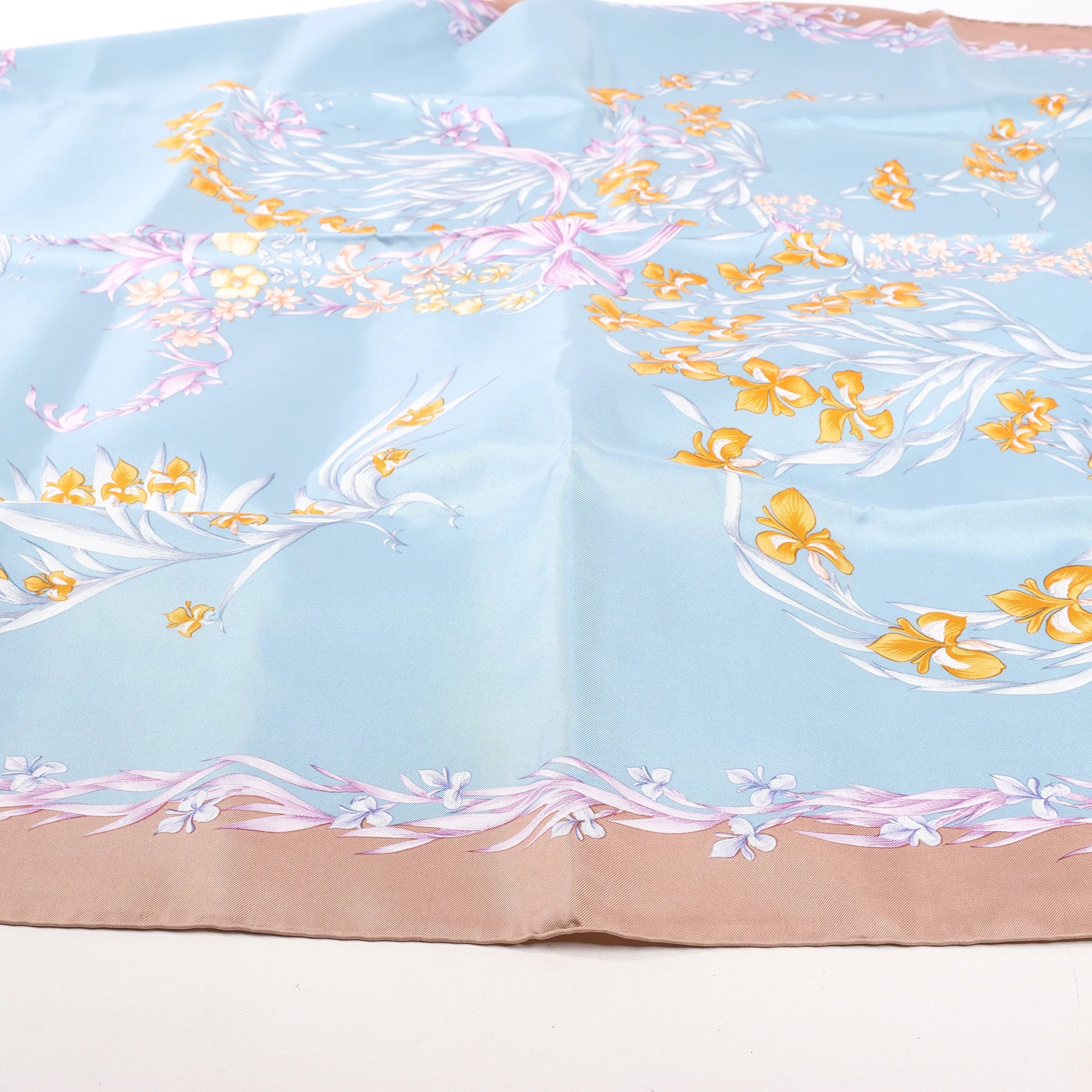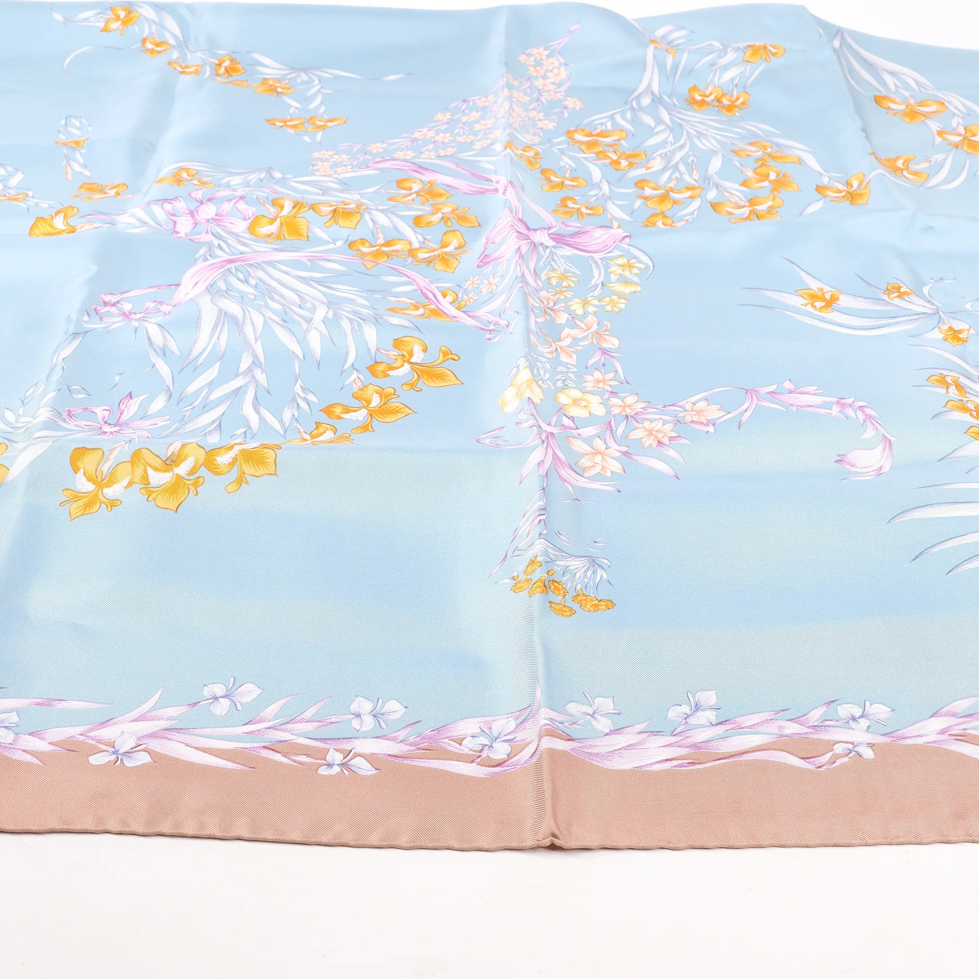 Hermès Carré 90 "H.d'Origny" silk scarf in soft blue showcases an elegant equestrian silhouette formed by delicate florals. Crafted from 100% silk, this piece blends artistry and femininity with timeless grace.