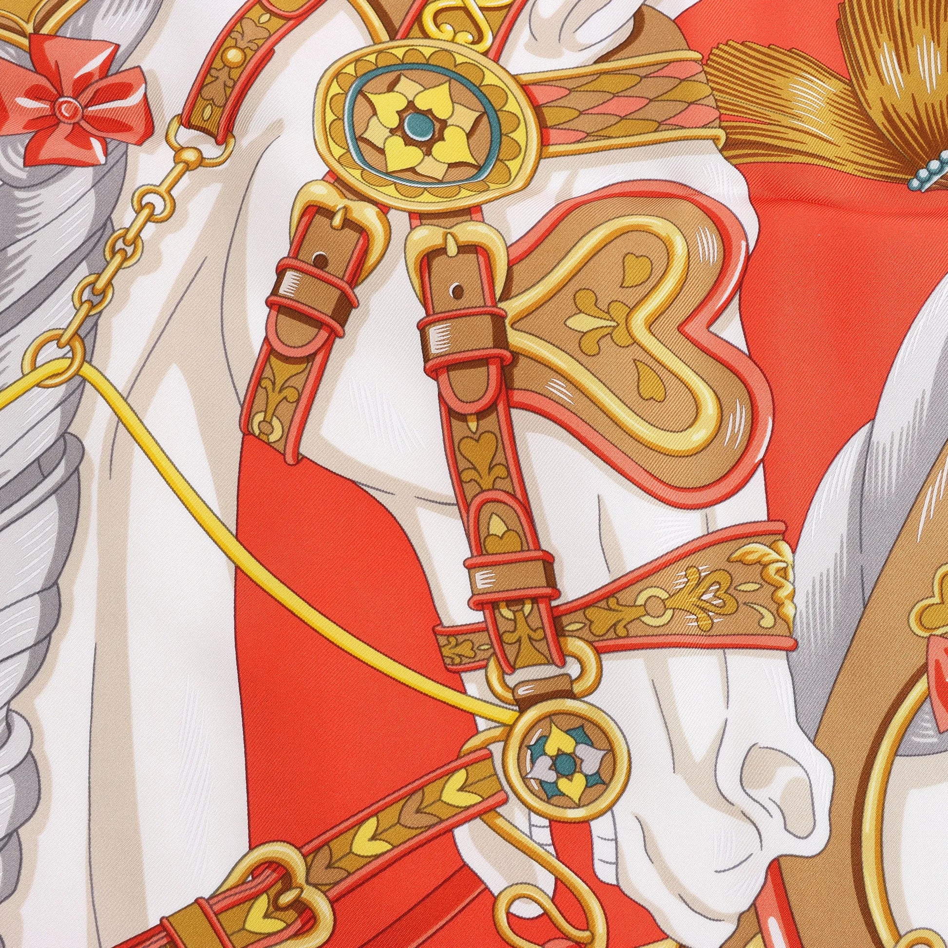 The Hermès Carré 90 "Harnais de Coeur" Silk Handkerchief in Red captures regal equestrian elegance in sumptuous silk. Adorned with ornate bridles, heart motifs, and vivid detailing, it’s a luxurious statement piece for any wardrobe.