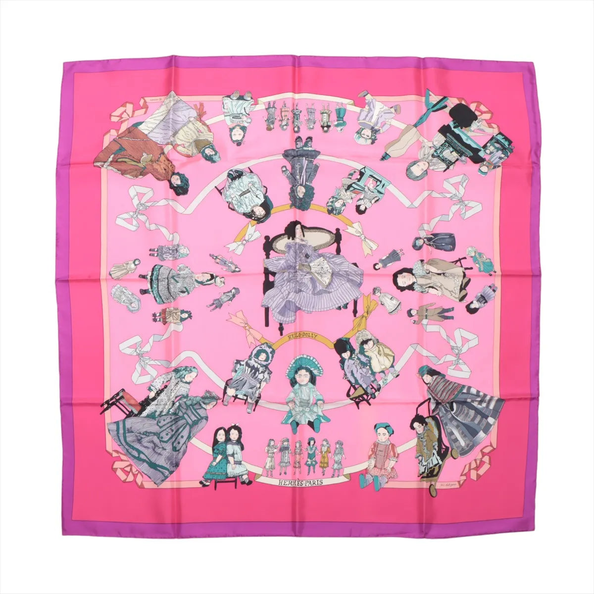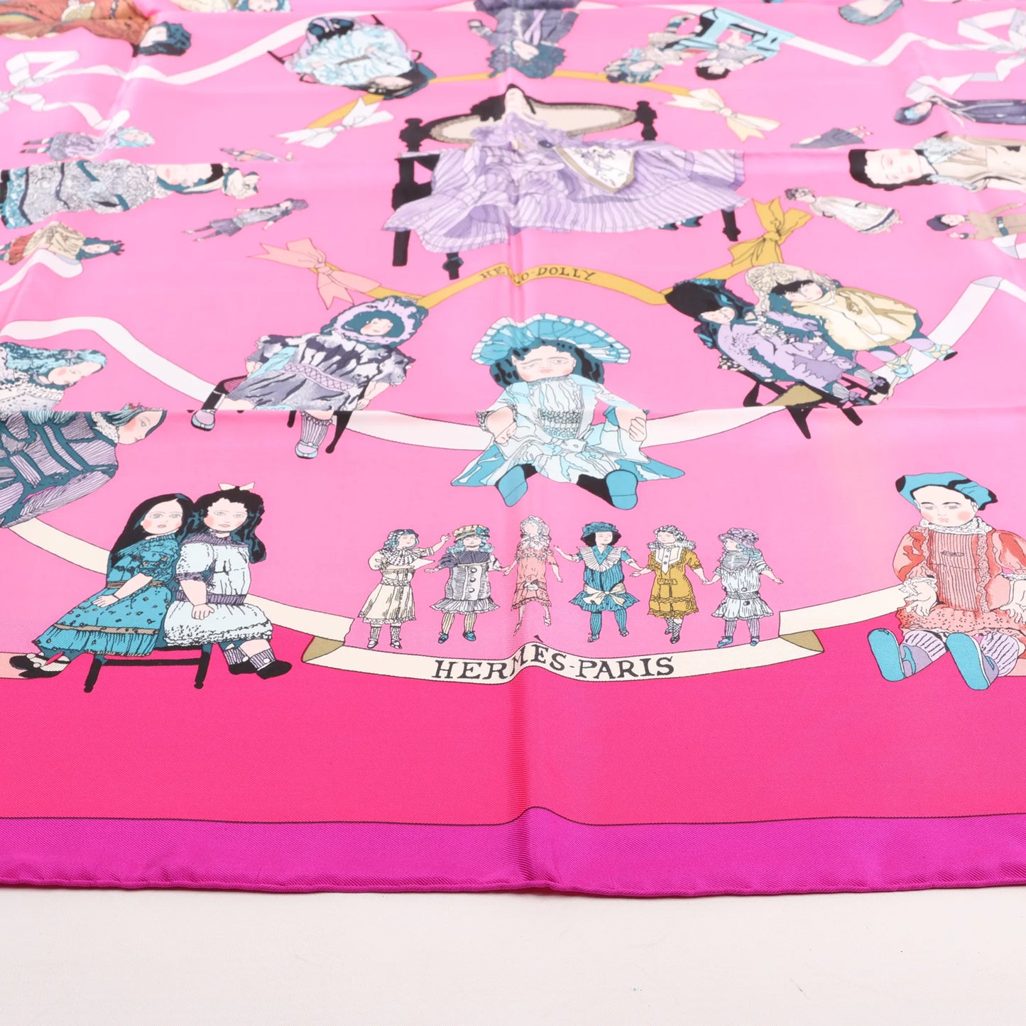 The Hermès Carré 90 "HELLO DOLLY" scarf in pink is a whimsical silk accessory showcasing vintage doll illustrations in vivid detail. Crafted in France from luxurious silk twill, it's a collector's piece that adds playful elegance to any outfit.