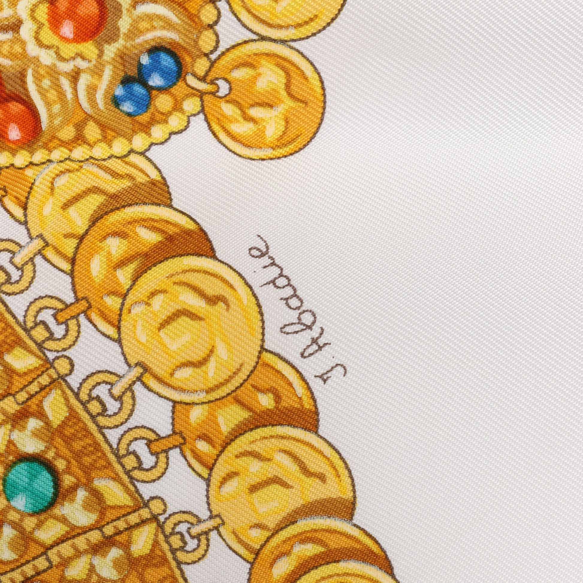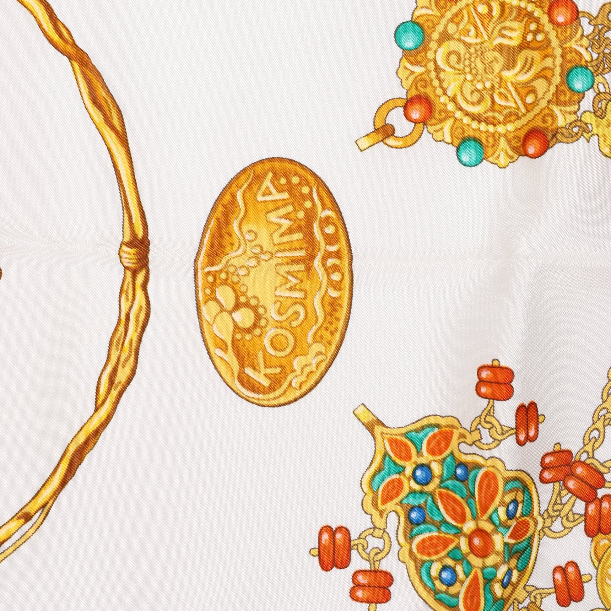 Hermès Carré 90 "Kosmima" 100% silk scarf in navy and beige. A luxurious design featuring intricate gold jewelry, including opulent necklaces, pendants, and earrings, capturing the essence of regal sophistication and timeless elegance. Ideal for adding a statement of glamour to any outfit.