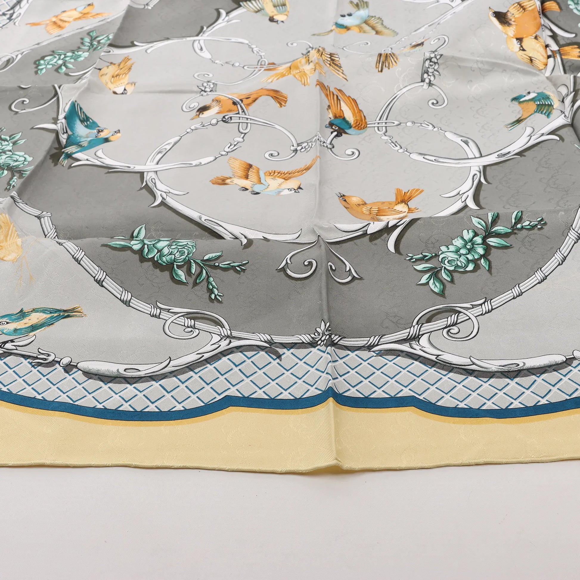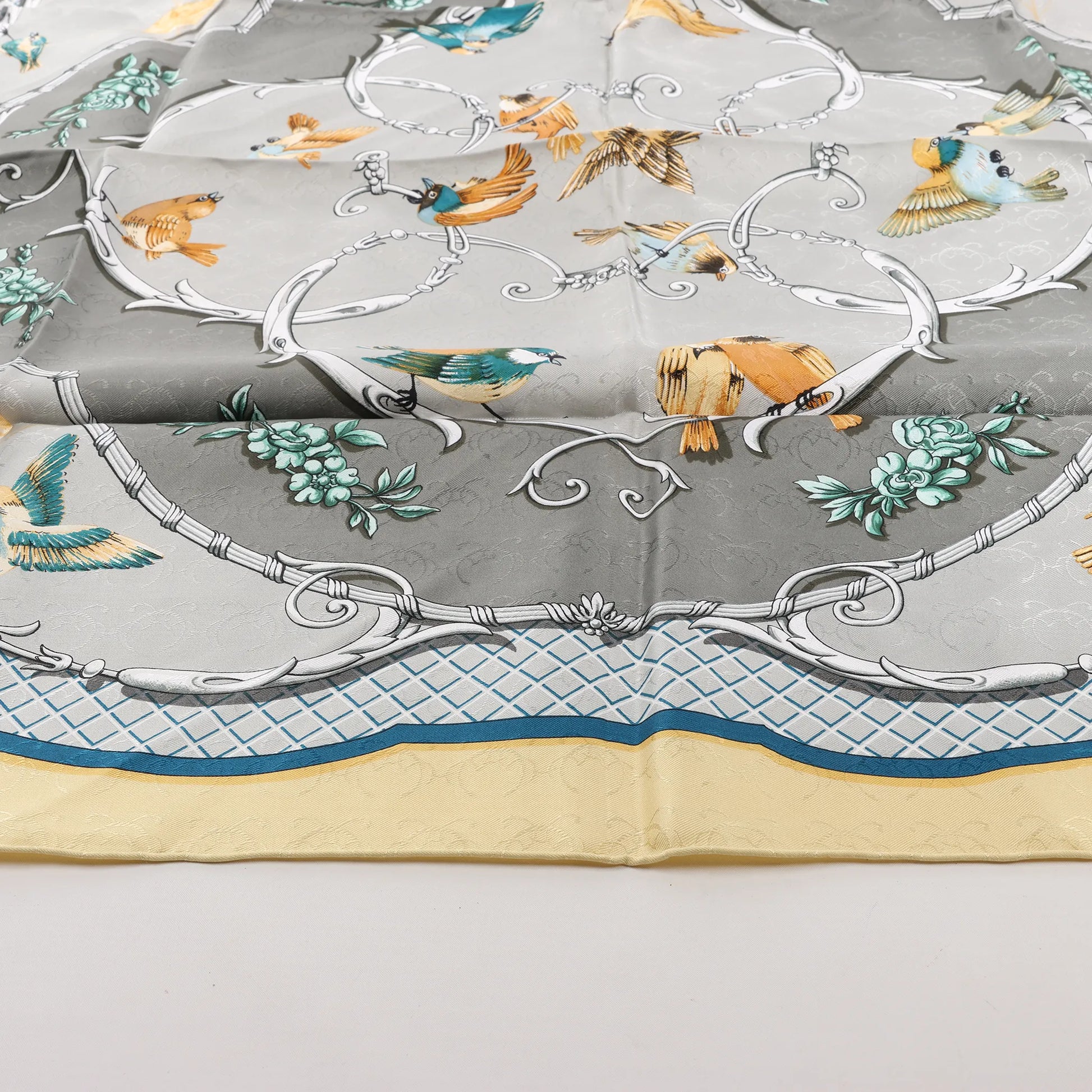 The Hermès Carré 90 "La Clé des Champs" silk handkerchief in beige is a delicate masterpiece featuring a romantic bird motif. Crafted from 100% silk, it brings nature-inspired elegance and timeless charm to your wardrobe.