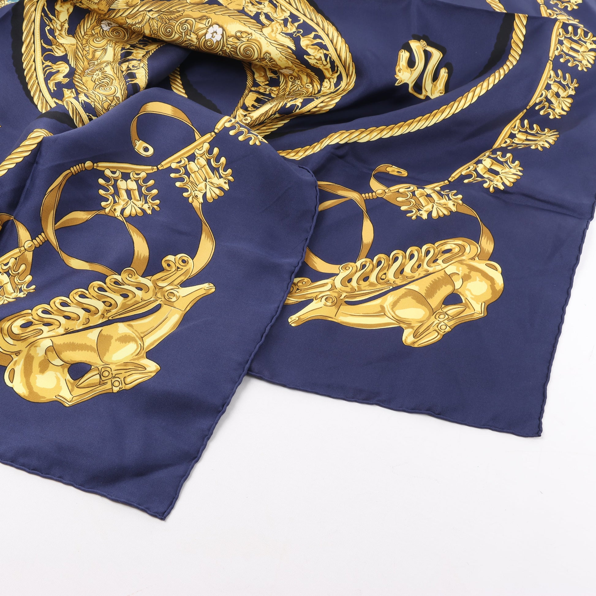 Hermès Carré 90 “Les Cavaliers d'Or” silk scarf in navy blue and gold, showcasing ornate equestrian-inspired gold motifs. A regal, timeless accessory crafted in luxurious silk with exquisite detailing.