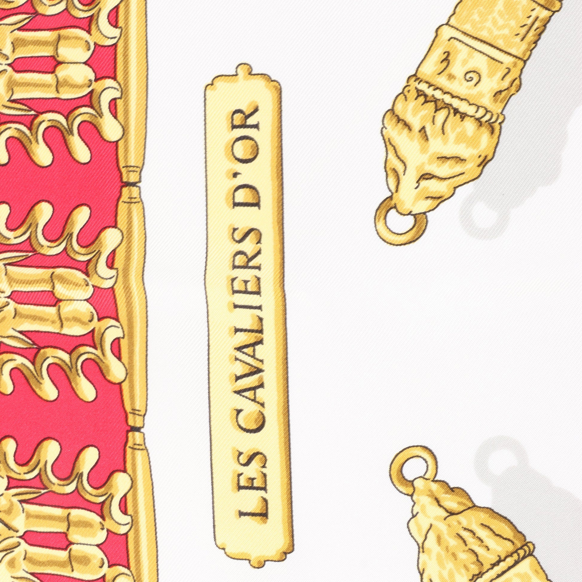Hermès Carré 90 “Les Cavaliers d'Or” silk scarf in rich red features an opulent display of golden equestrian-inspired jewelry, exuding regal elegance and timeless sophistication in every intricate detail.