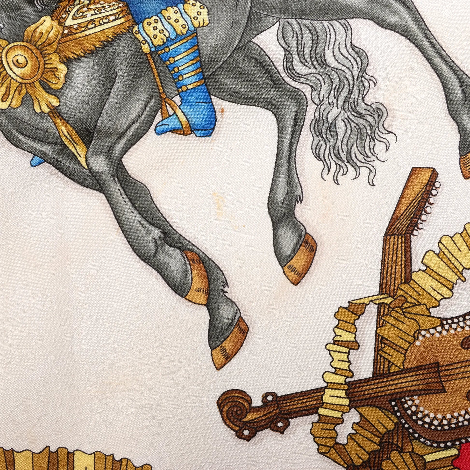 Step into royal splendor with the Hermès Carré 90 "Les Fêtes du Roi Soleil" in regal red. Made from exquisite silk, this opulent design celebrates the lavish festivals of Louis XIV with elaborately dressed figures on horseback—perfect for a baroque-inspired statement.