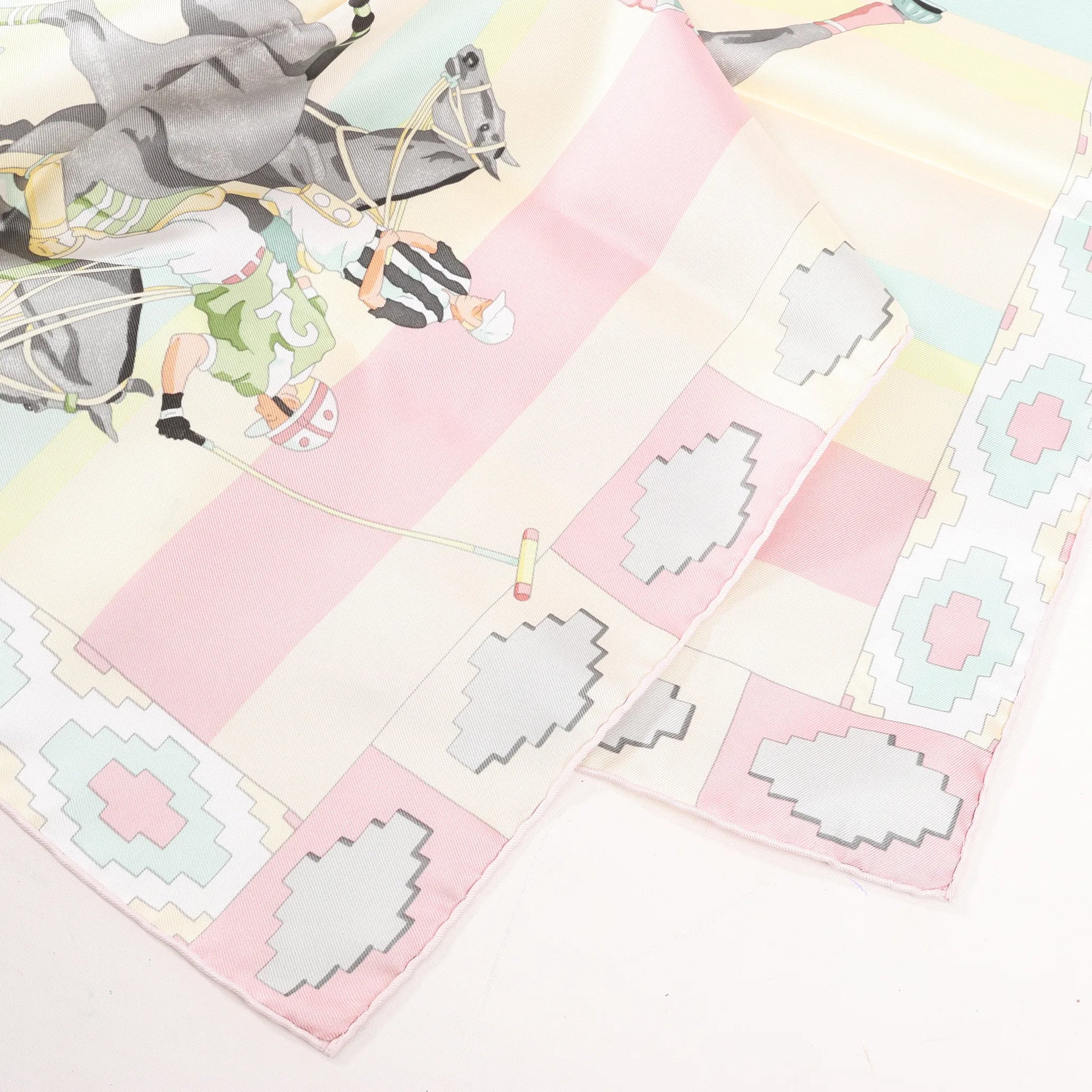 The Hermès Carré 90 "Les Poneys de Polo" scarf in pink silk showcases a dynamic equestrian motif with pastel hues - crafted in luxurious silk twill for timeless elegance and collectible charm.