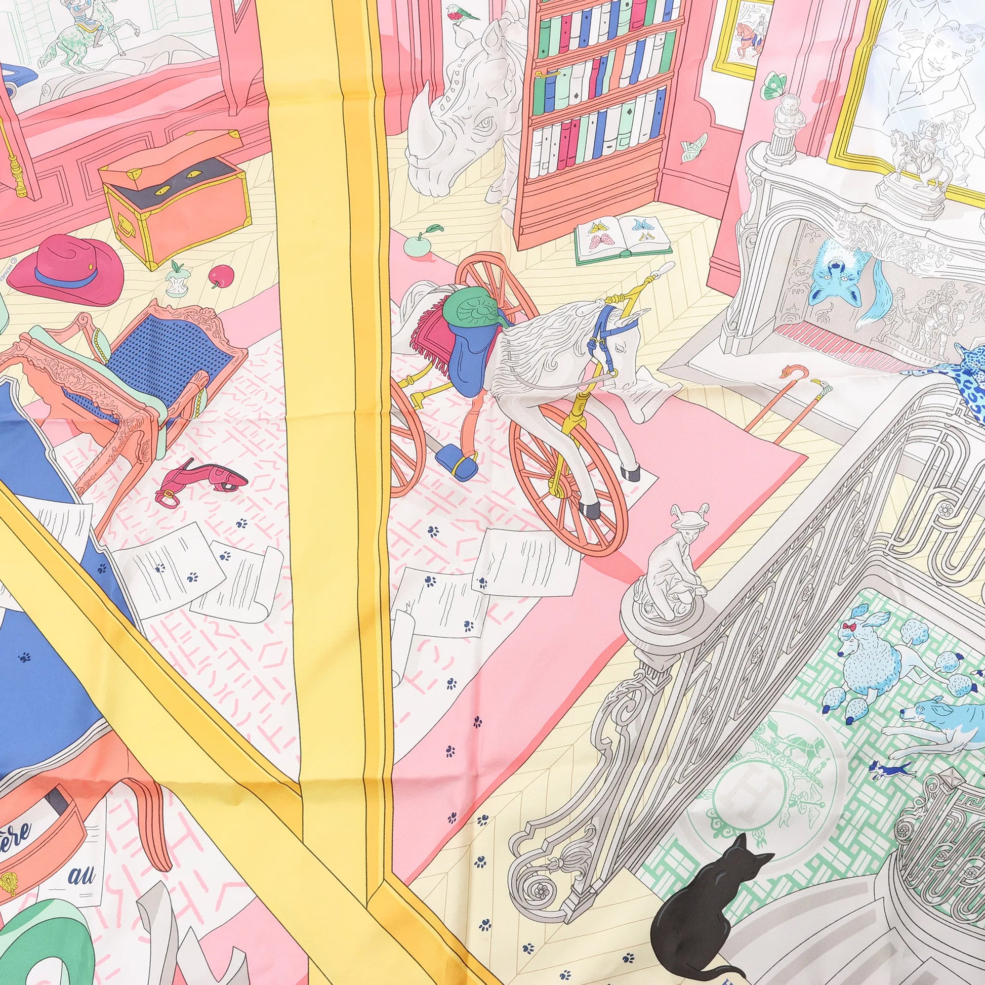 Uncover the charm of the Hermès Carré 90 "Mystère au 24" silk scarf, a whimsical multicolor piece that blends luxury with playful intrigue. Crafted in pure silk, it features a vibrant, detailed mystery scene set inside the iconic Hermès Paris building.