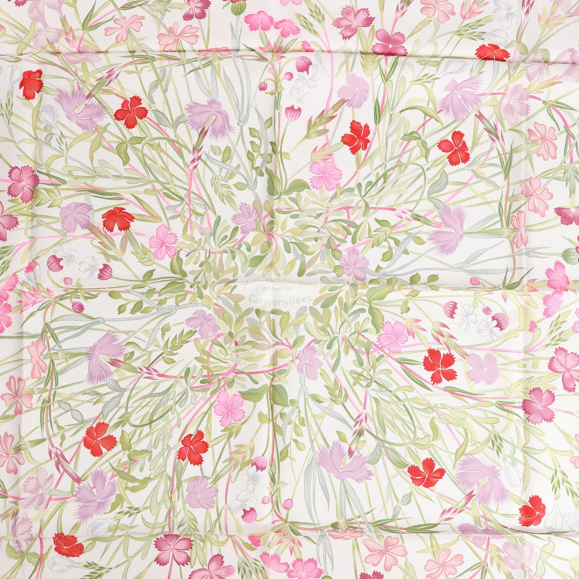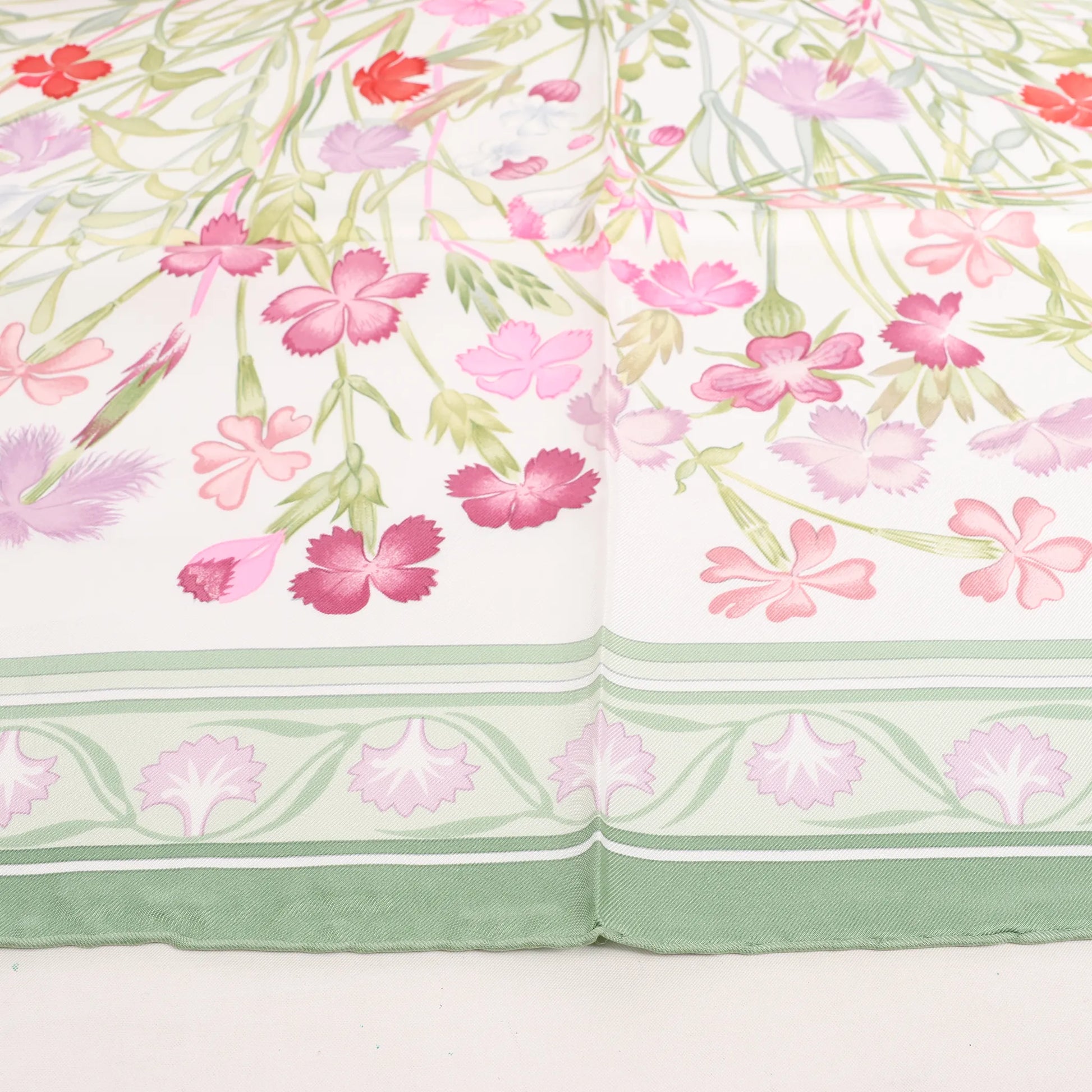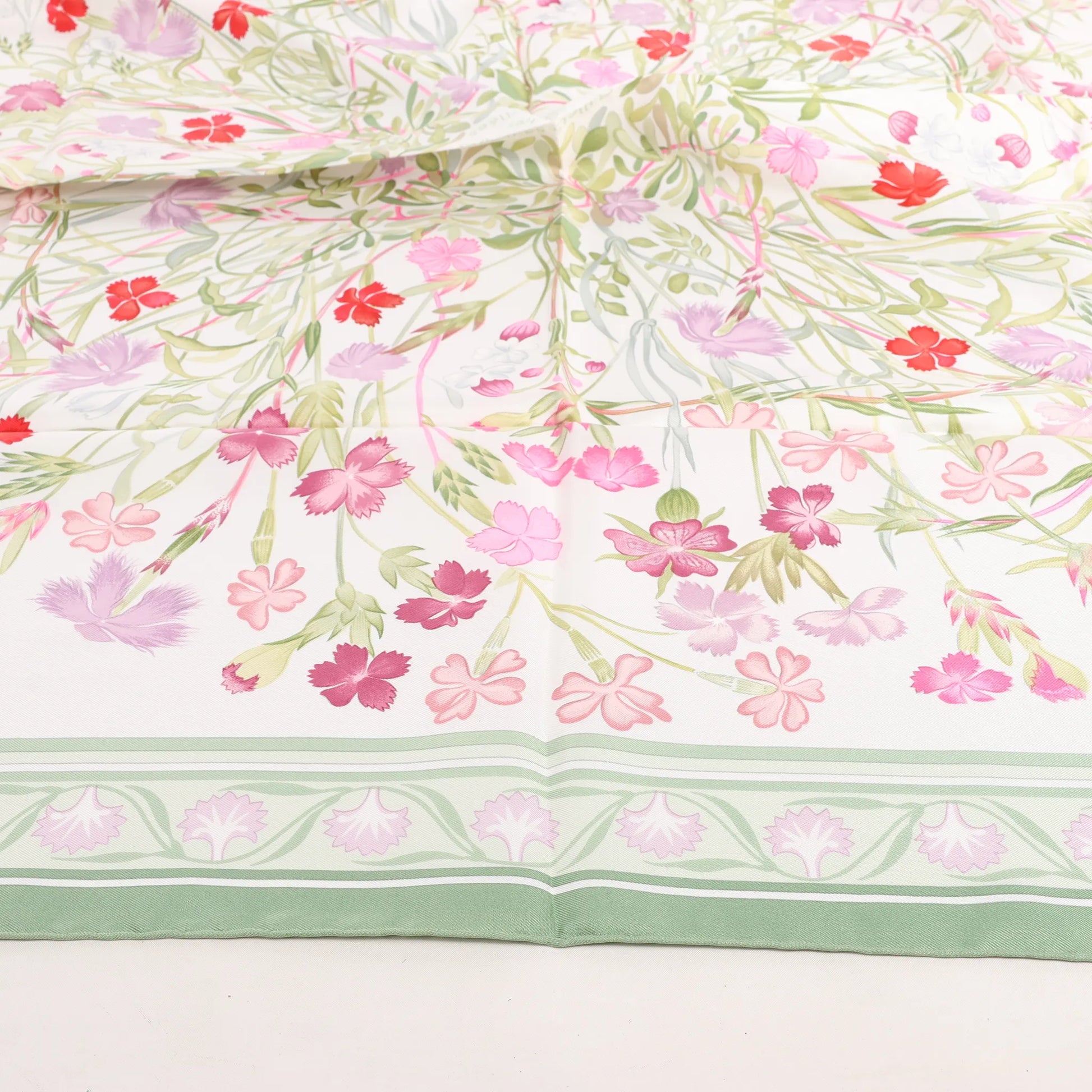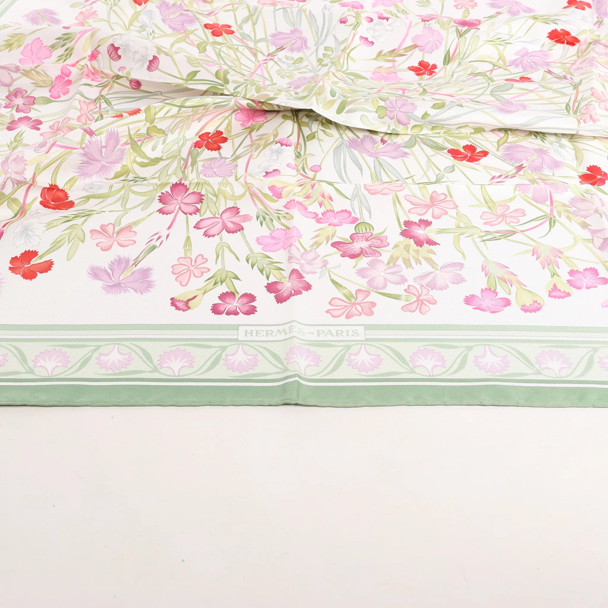 The Hermès Carré 90 "Œillets Sauvages et Autres Caryophyllées" in green silk features a soft floral explosion of wild pinks and greens, crafted in luxurious 100% silk twill.