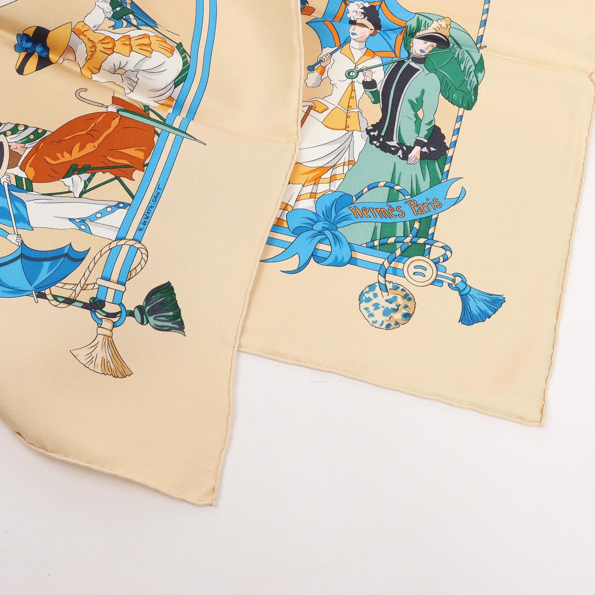 The Hermès Carré 90 "Ombrelles et Parapluies" silk handkerchief in beige showcases exquisite craftsmanship and whimsical charm. Made from luxurious silk, this iconic square scarf features intricate parasol and umbrella motifs for timeless elegance.