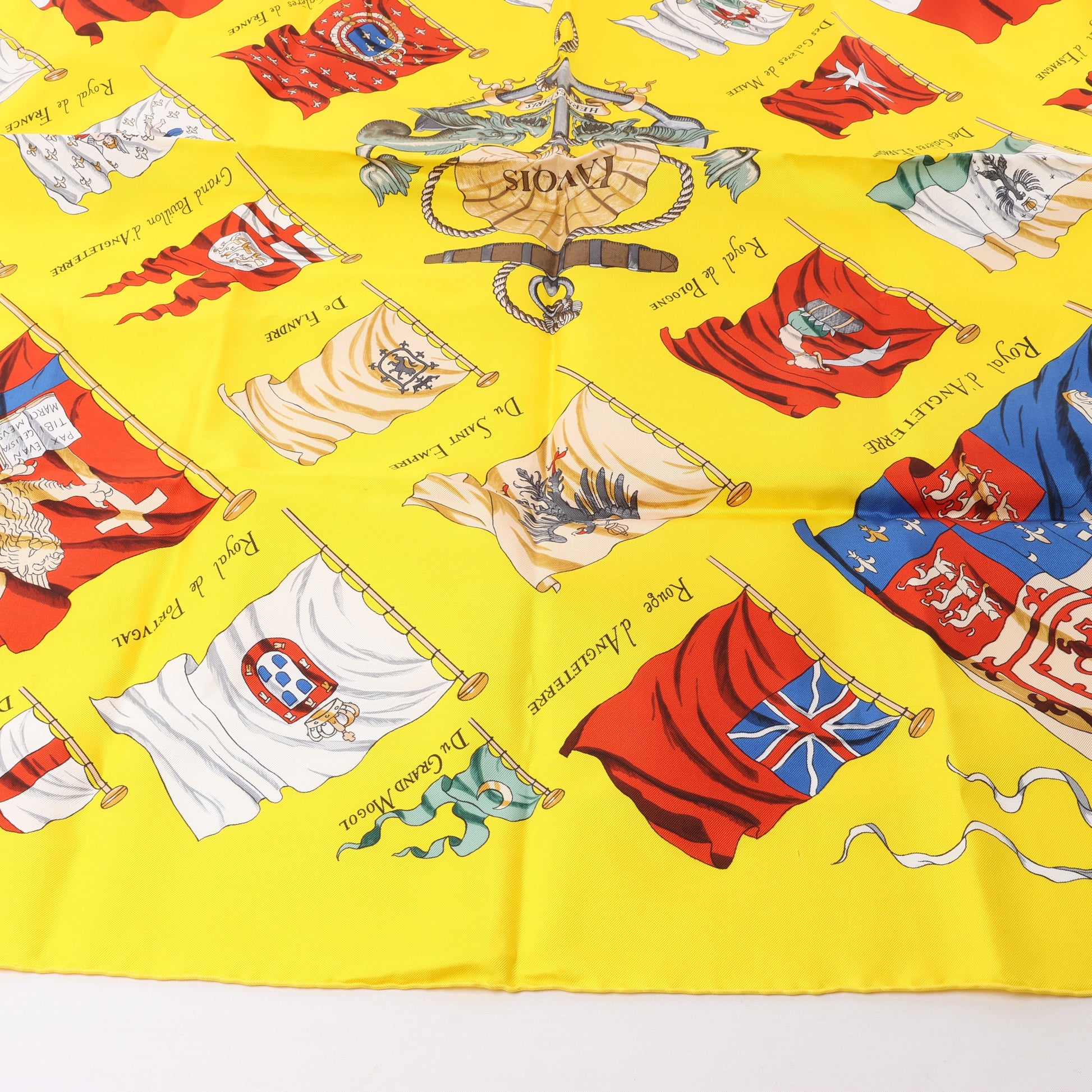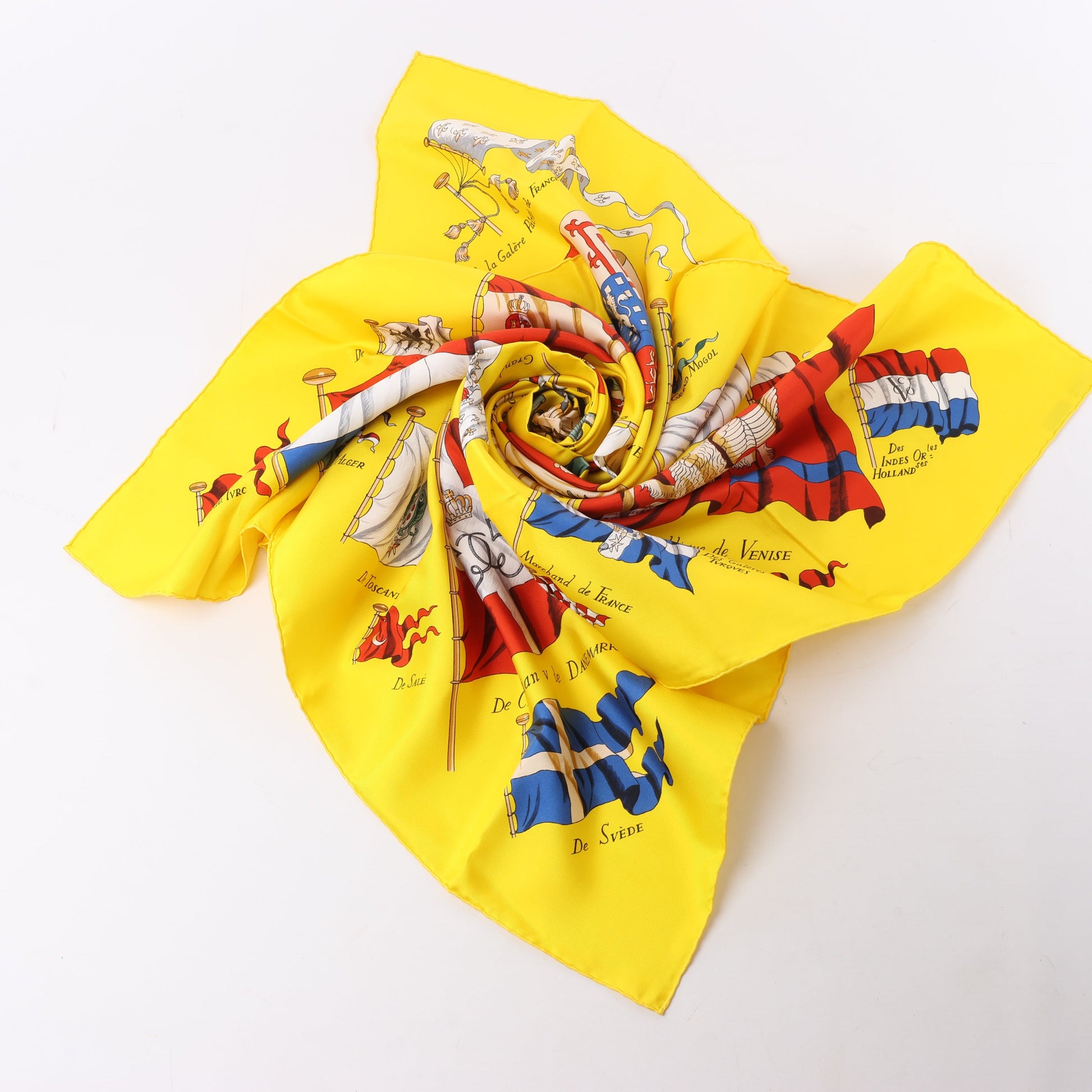 Hermès Carré 90 “Pavois” silk scarf in radiant yellow, showcasing a vibrant array of historic maritime flags. A striking accessory that captures nautical elegance with bold color and intricate design.