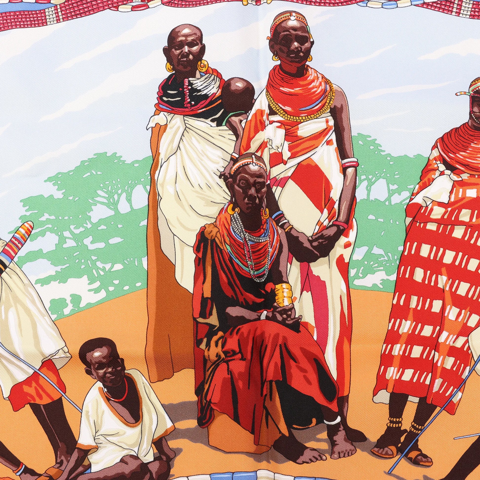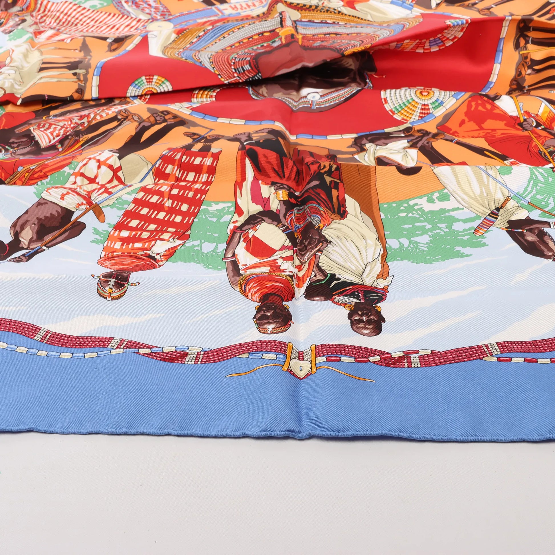 The Hermès Carré 90 "Perles du Kenya" silk handkerchief in blue is a stunning tribute to Kenyan beadwork and culture. Made from luxurious silk, this piece features bold colors and intricate illustrations, celebrating tradition with timeless Hermès elegance.